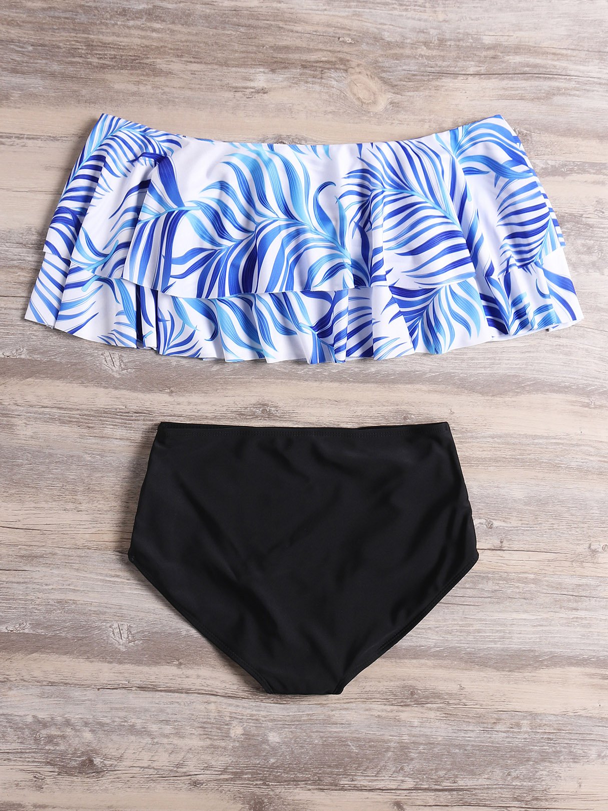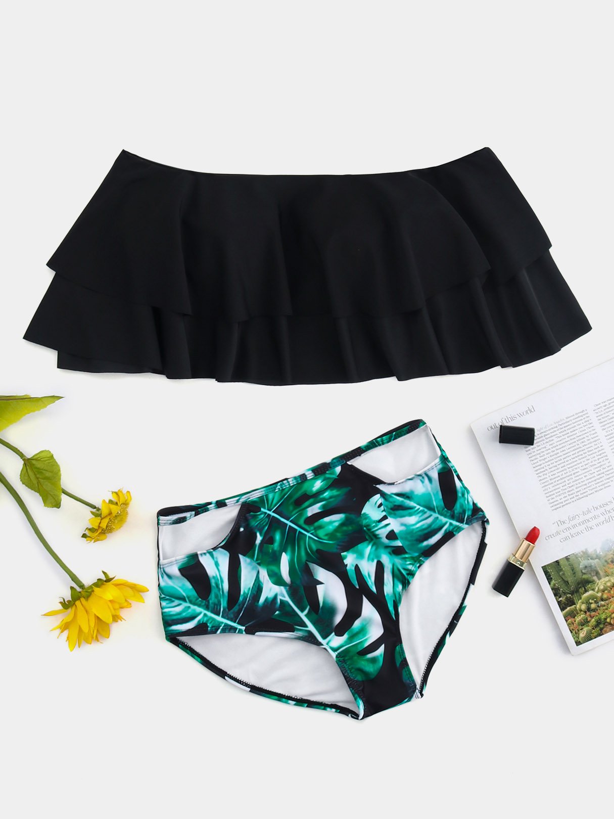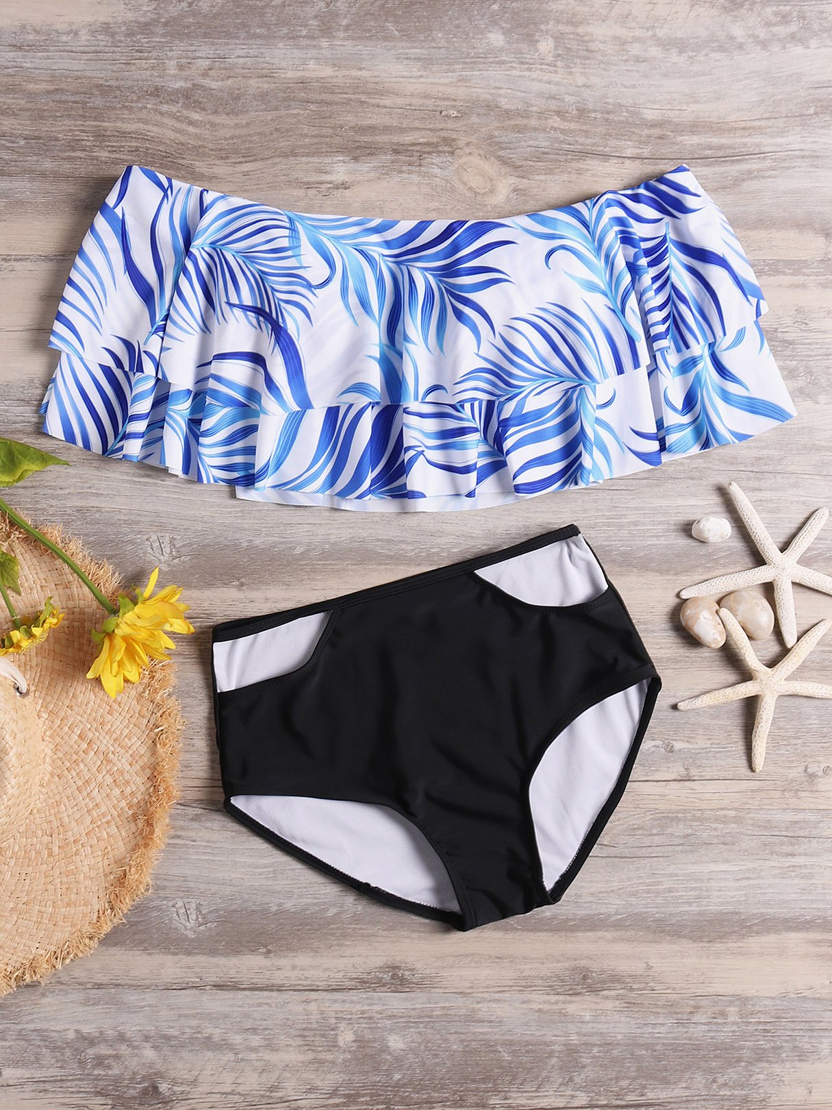 Off The Shoulder Half Sleeve Printed Tiered Backless Cut Out Bikinis