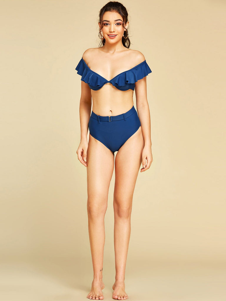 Off The Shoulder Plain Backless Self-Tie Ruffle Trim Short Sleeve Dark Blue Bikinis