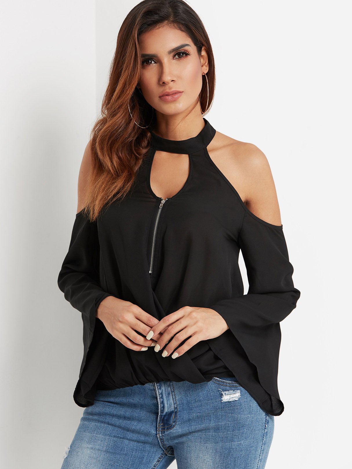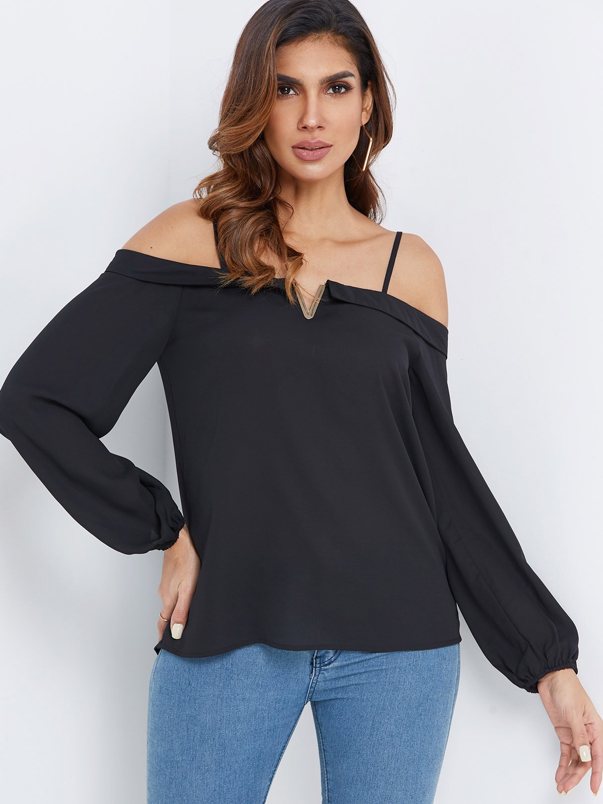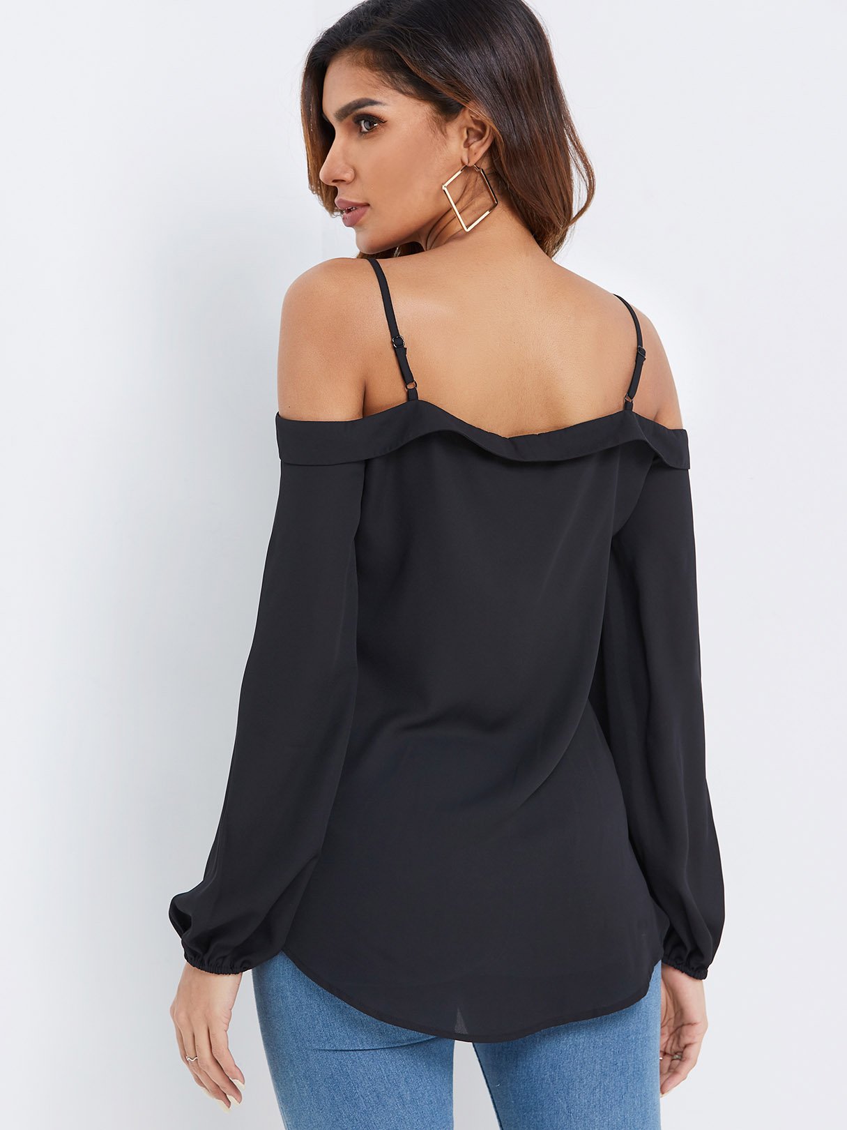 Off The Shoulder Plain Spaghetti Strap Long Sleeve Curved Hem Black Blouses