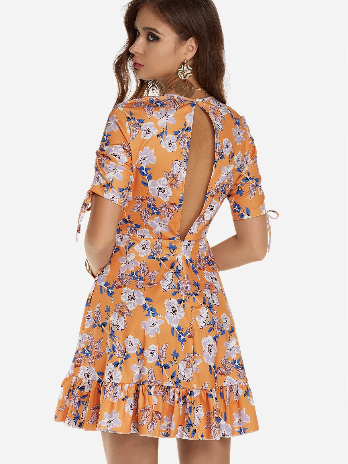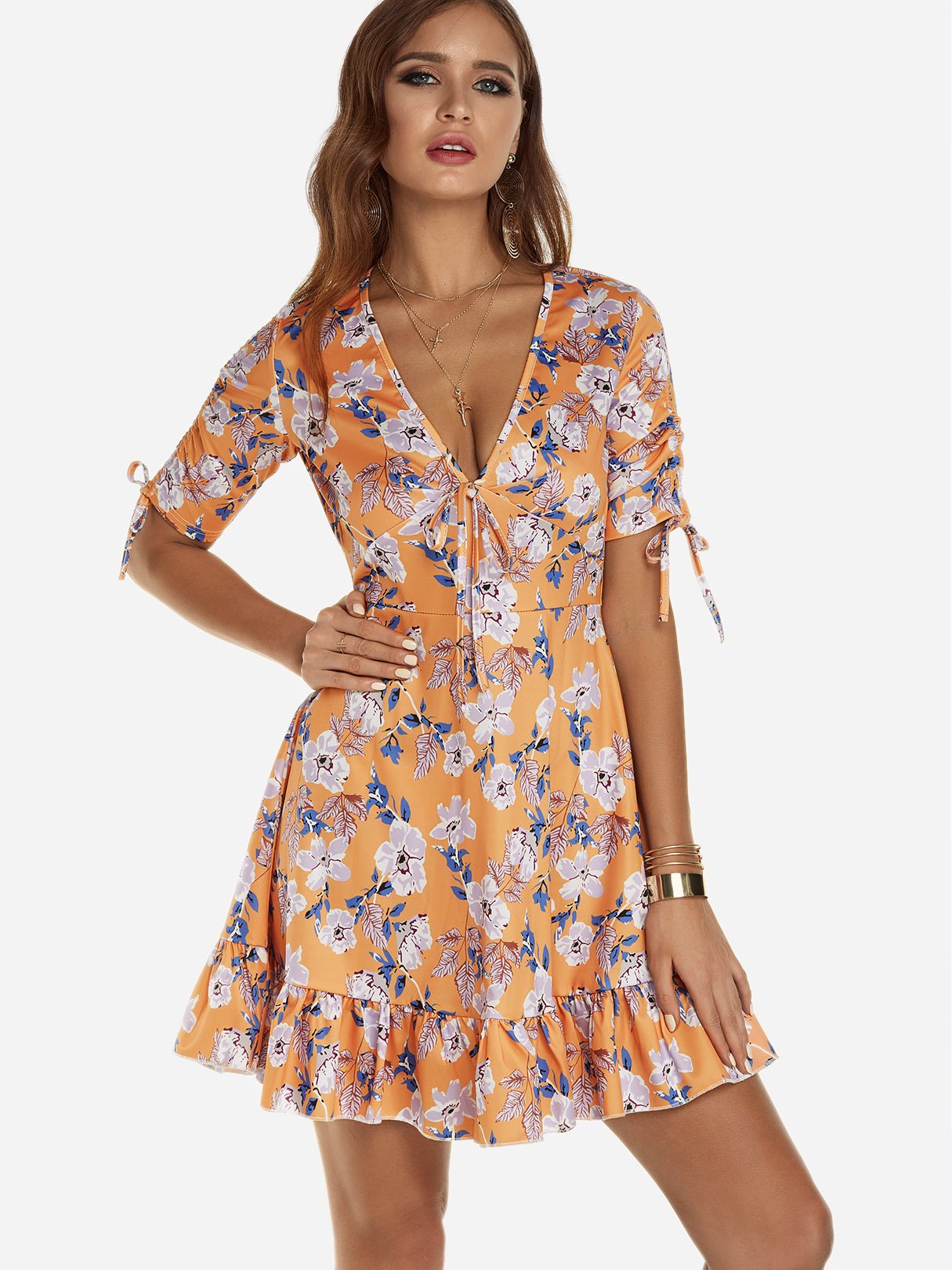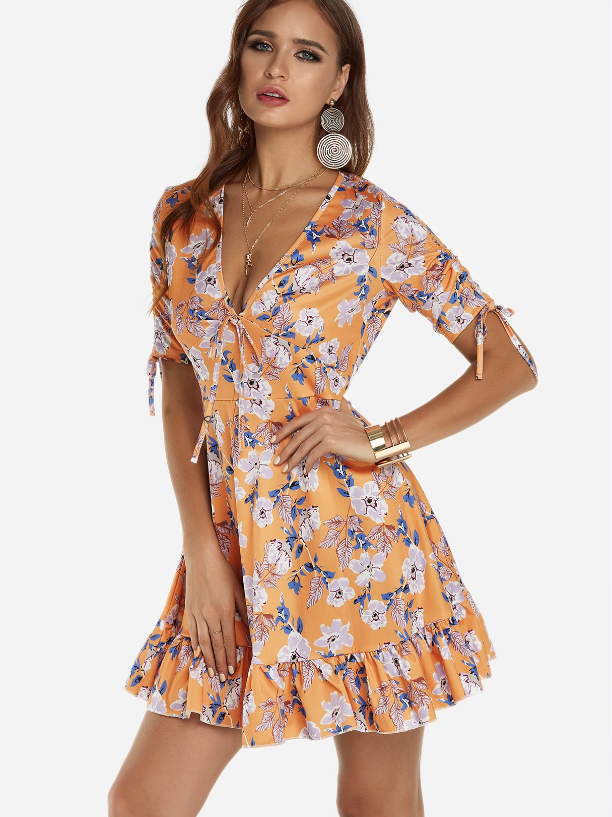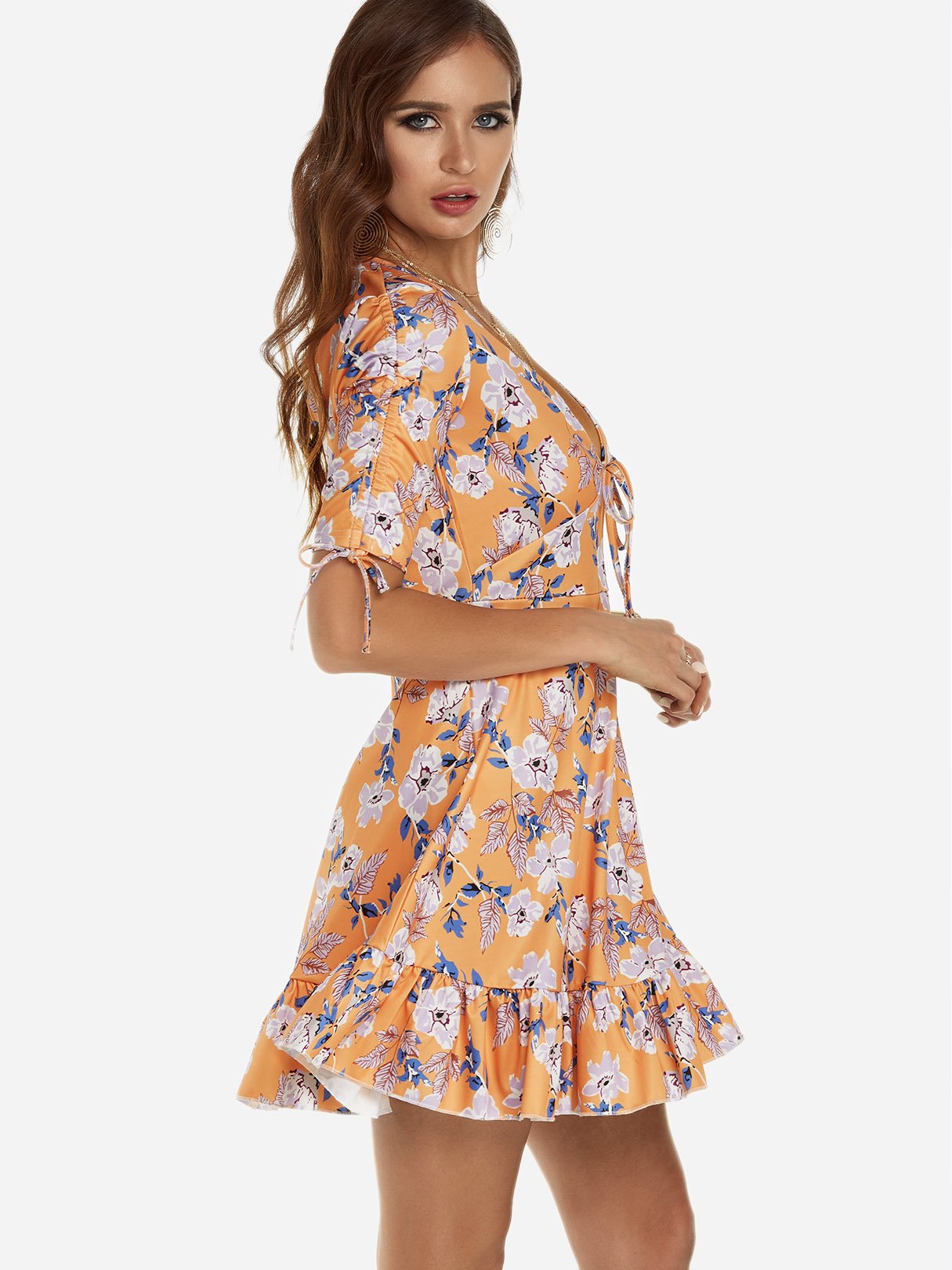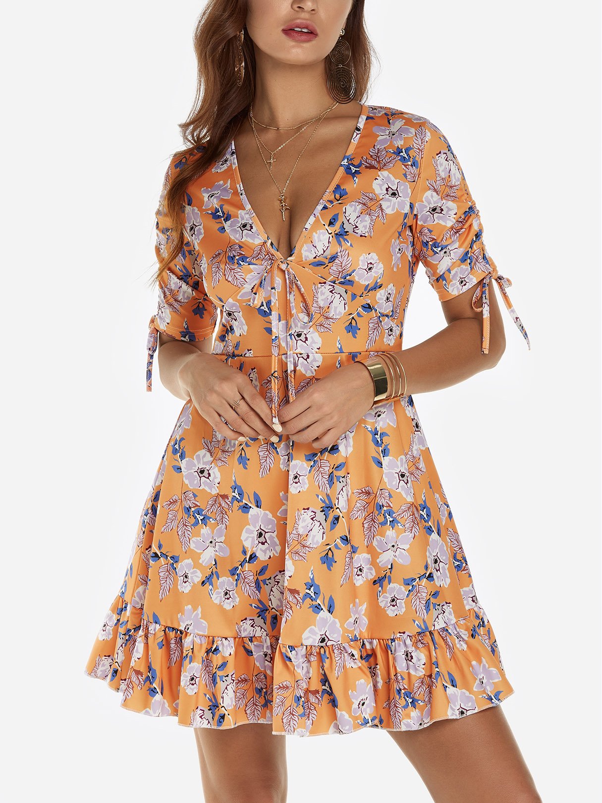 Orange V-Neck Short Sleeve Floral Print Lace-Up Cut Out Flounced Hem Dresses
