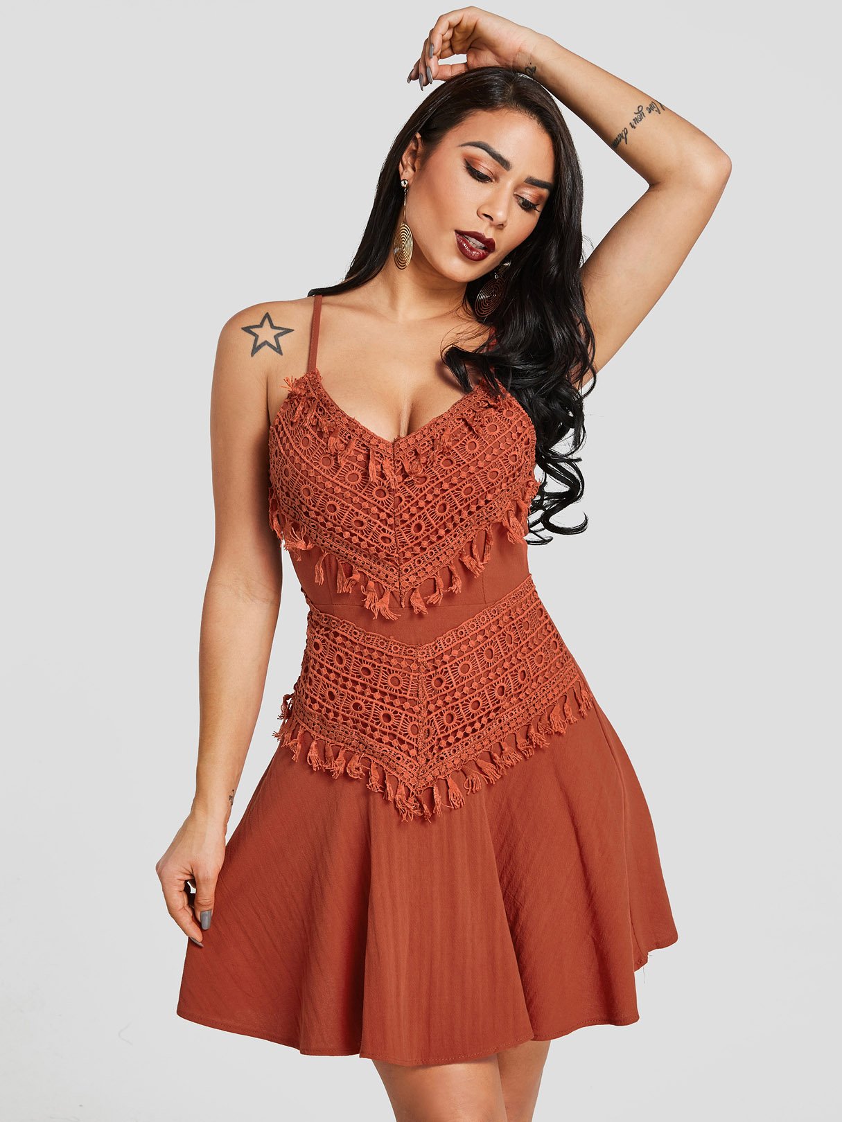 Orange V-Neck Sleeveless Backless Self-Tie Lace Insert Dresses