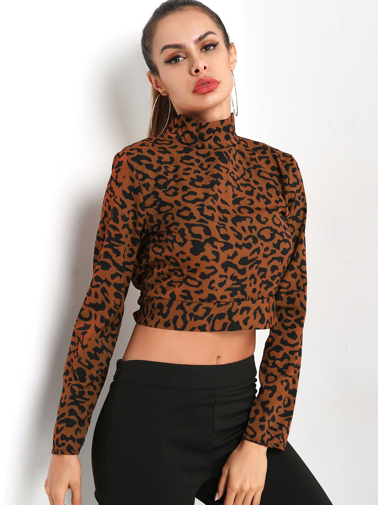 Perkins Collar Leopard Backless Self-Tie Long Sleeve Red Blouses