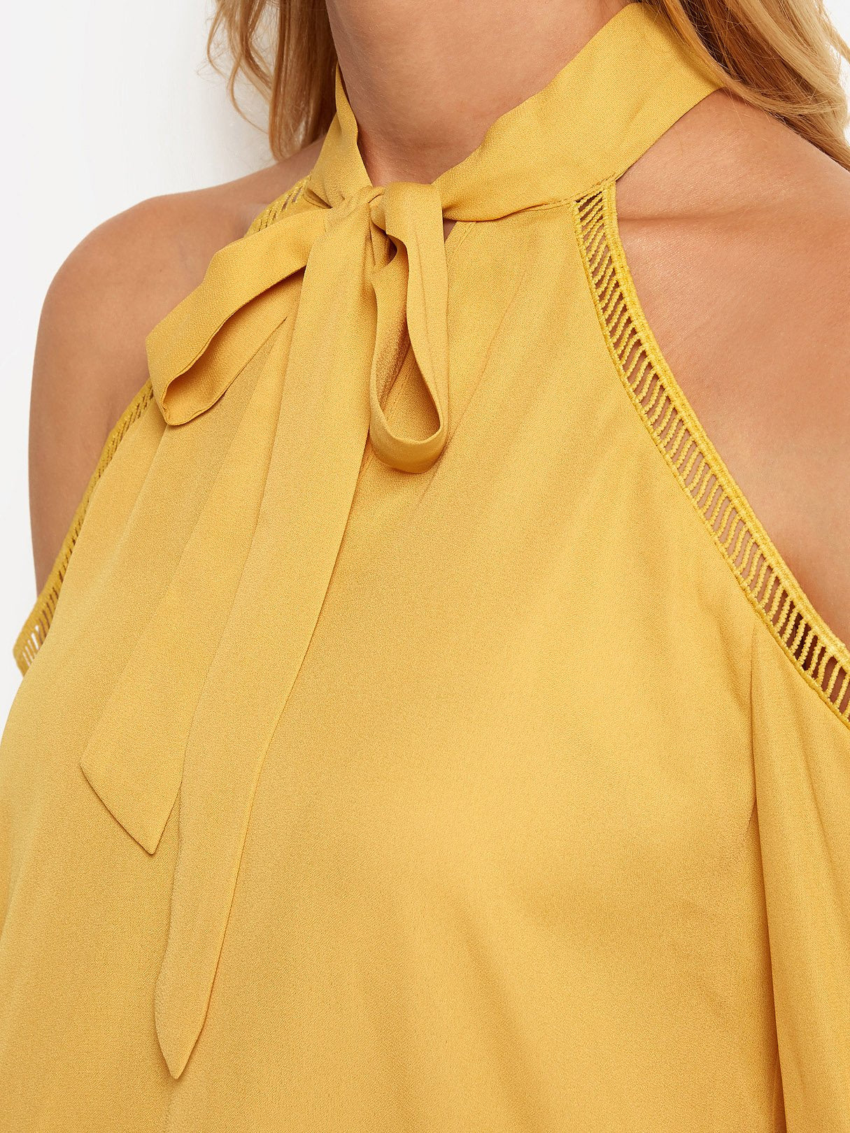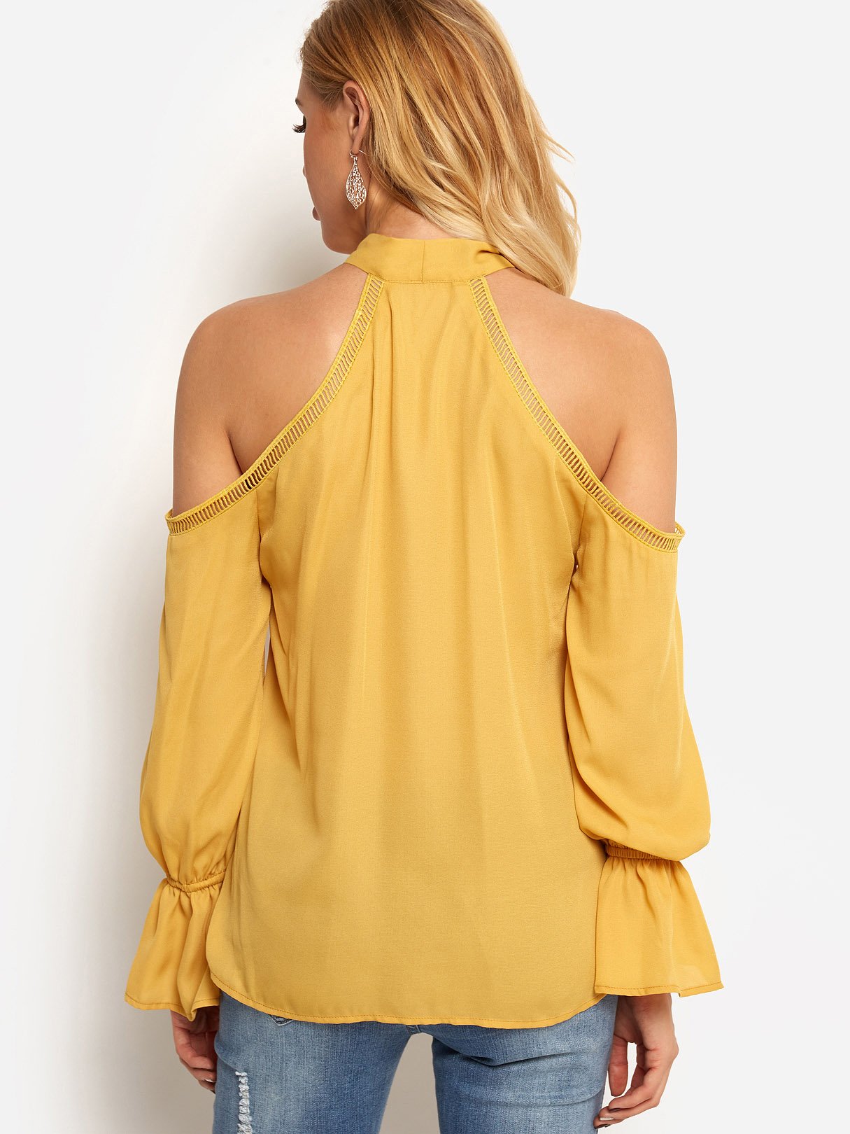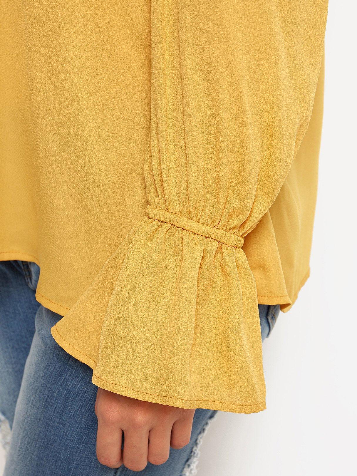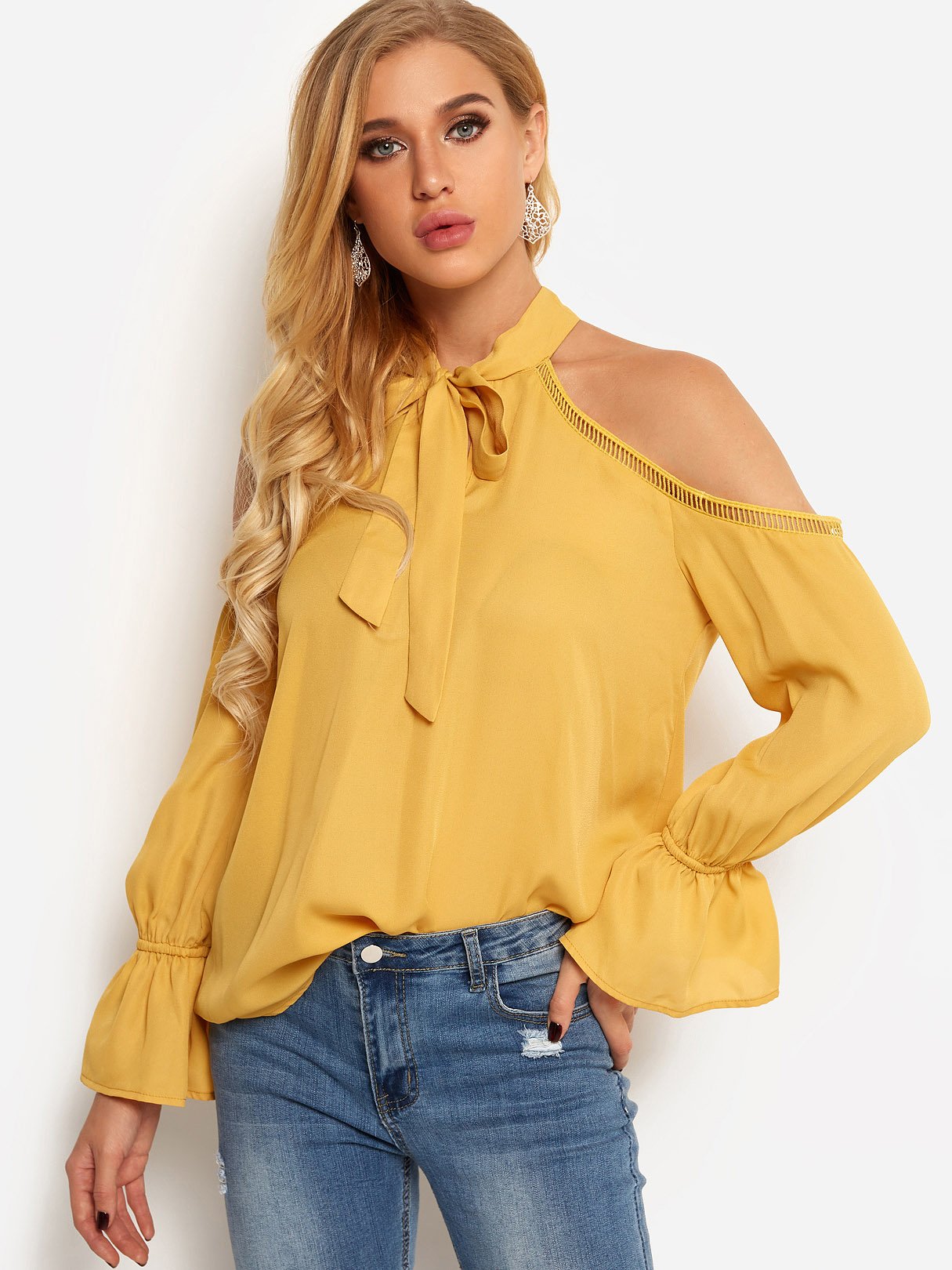 Perkins Collar Plain Hollow Cut Out Self-Tie Long Sleeve Flounced Hem Yellow Blouses