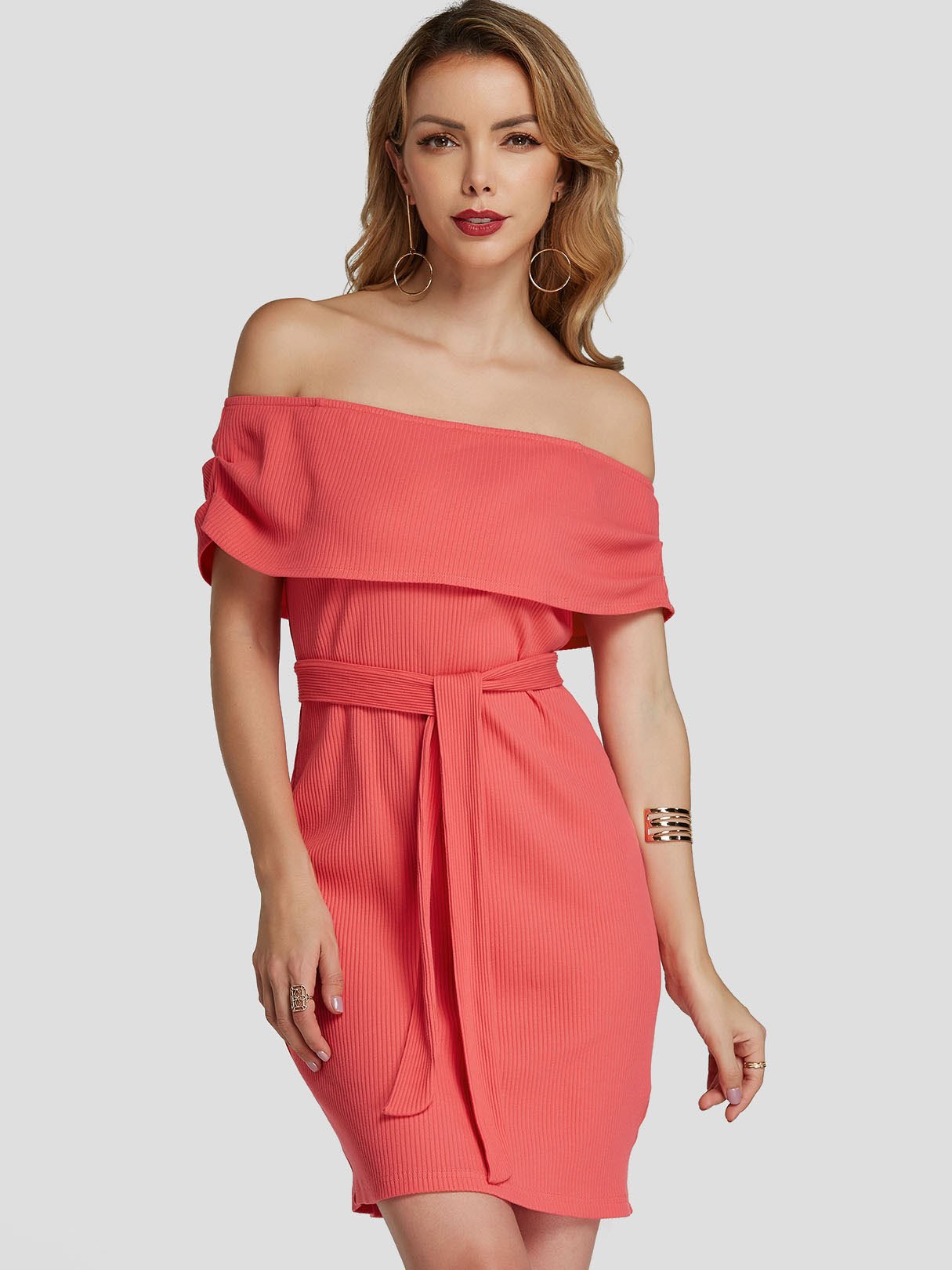Pink Bateau Short Sleeve Plain Pleated Belt Mini Dresses