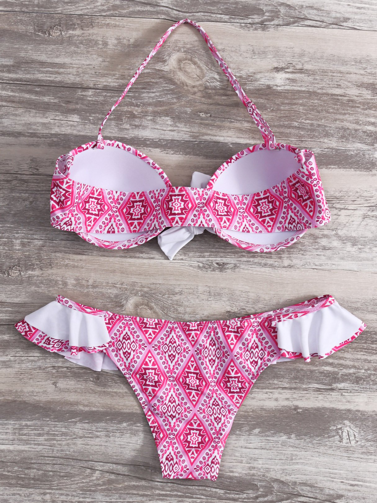 Pink Halter Printed Self-Tie Ruffle Trim Two Piece Bikinis