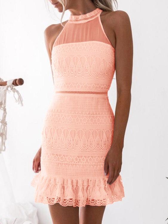 Pink Round Neck Sleeveless Lace Zip Back Hollow See Through Flounced Hem Mini Dress