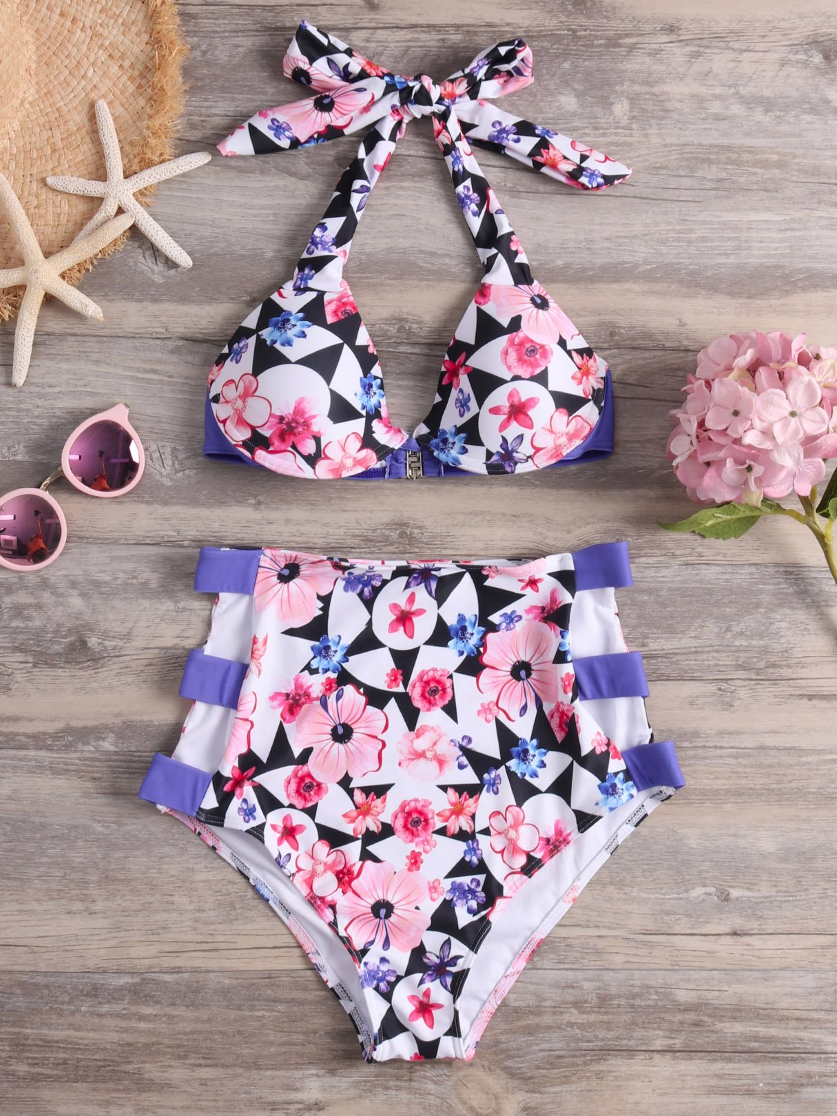 Purple Halter Sleeveless Floral Print Cut Out Tie-Up High-Waisted Two Piece Bikinis