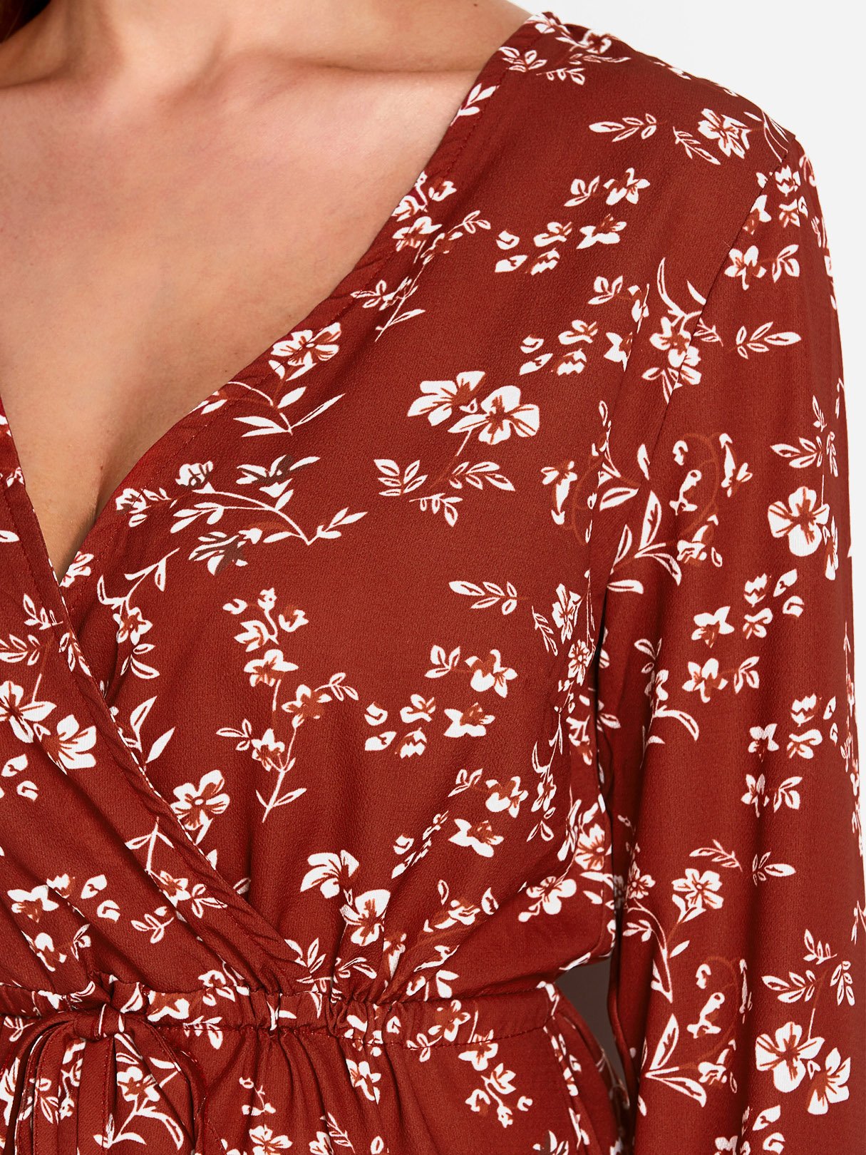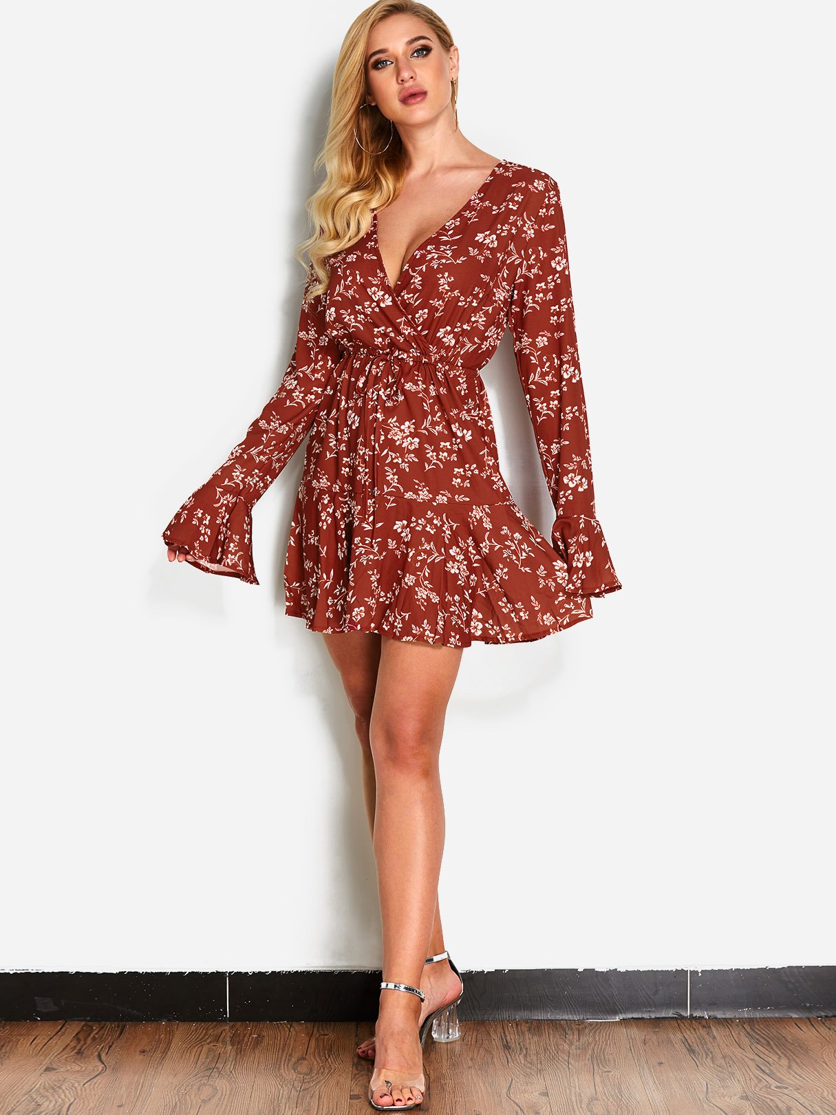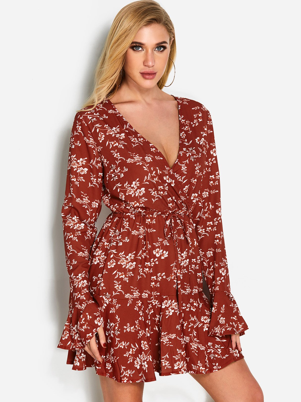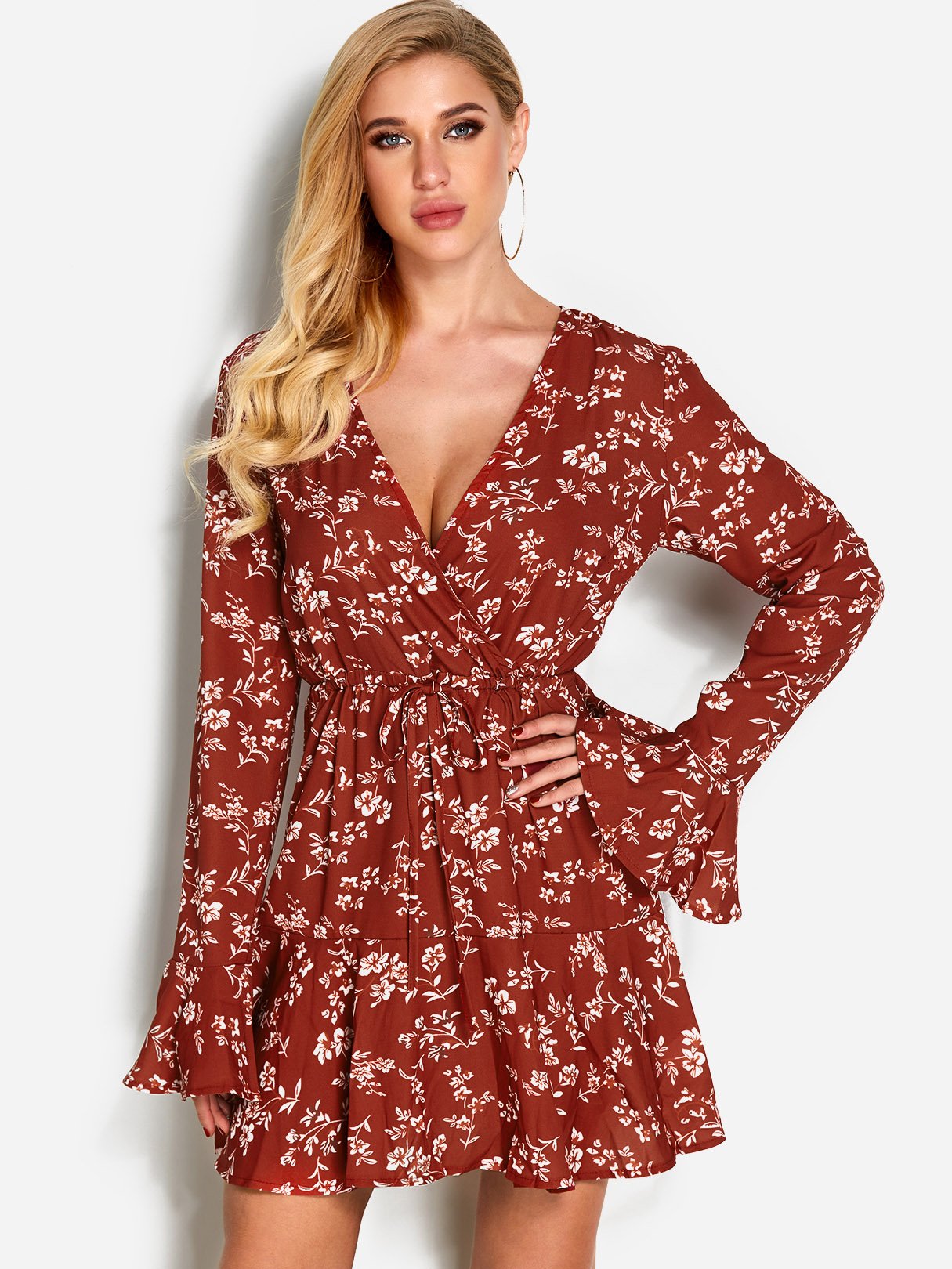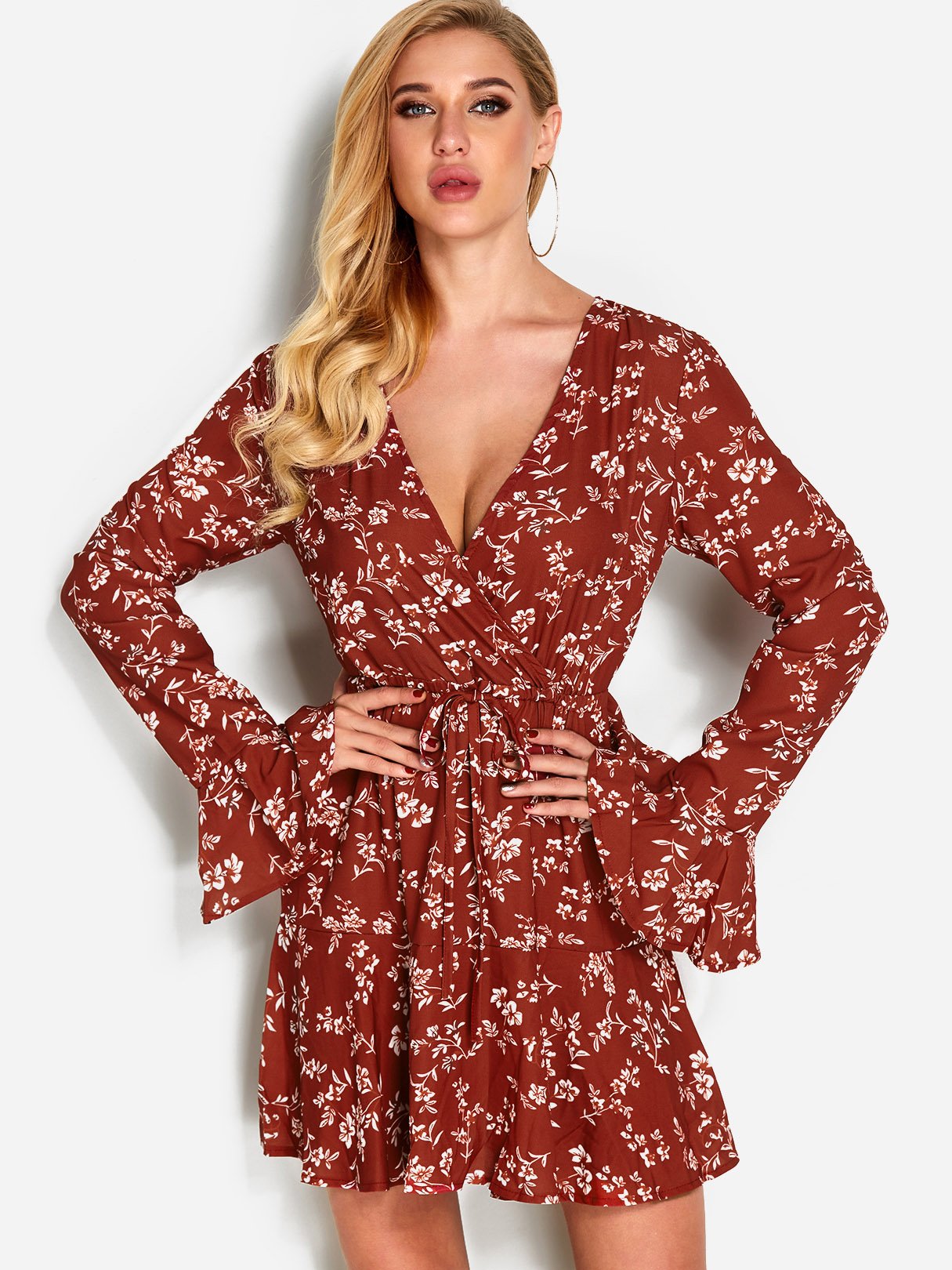 Material:Polyester,SpandexNeckline:Deep V NeckSeason:Spring,Summer,AutumnSleeves:Long SleevesPattern:Floral PrintDetail:Lace-Up DesignLength:MiniFit:Regular Fit