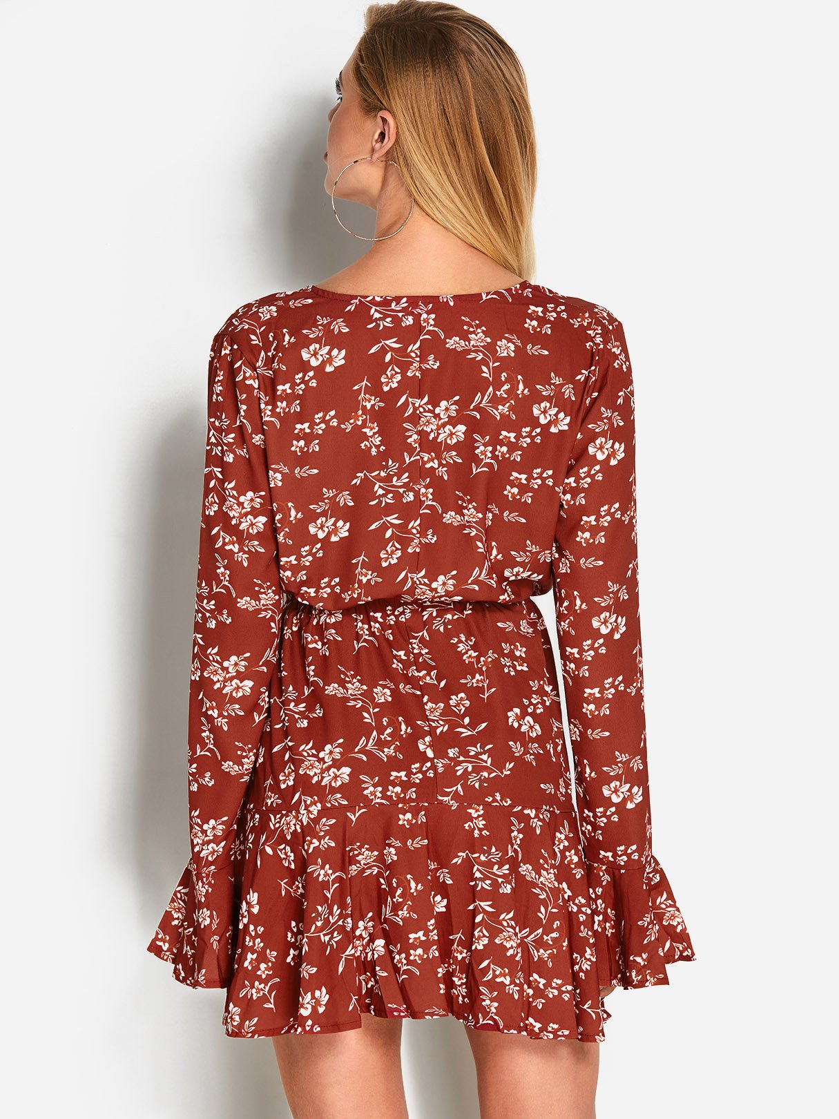 Red Deep V Neck Long Sleeve Floral Print Lace-Up Mini Dress - Red / S is backordered and will ship as soon as it is back in stock.