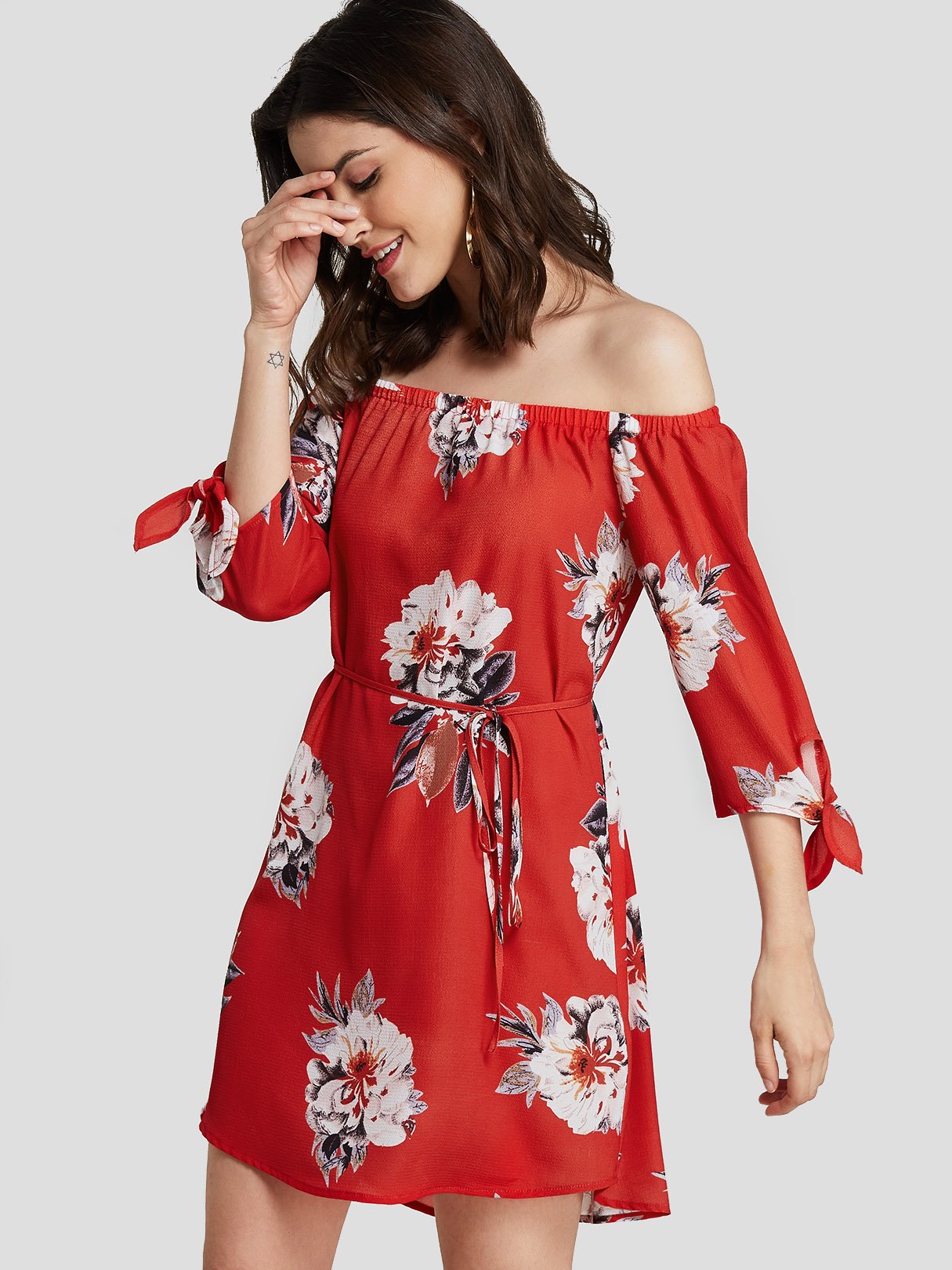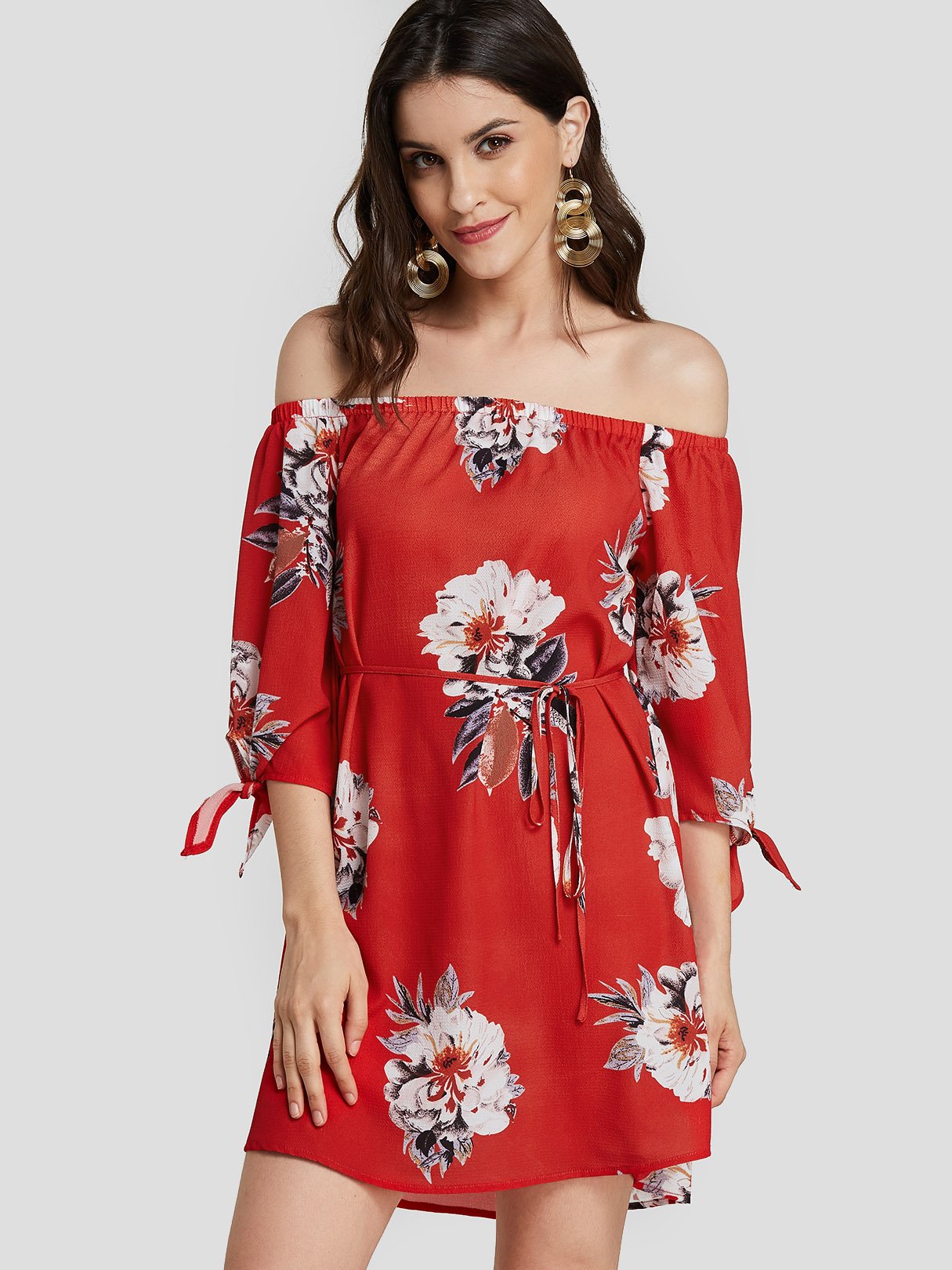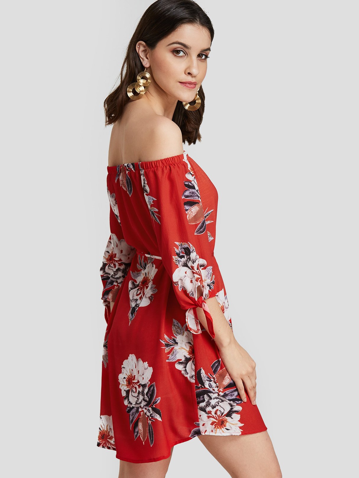 Material:PolyesterNeckline:Off The ShoulderSeason:Spring,Summer,AutumnSleeves:3/4 Length SleevesPattern:Floral PrintStyle:Vacation StyleDetail:Backless Design,Self-Tie DesignWaist Design:High-WaistedLength:MiniFit:Regular FitOccasion:Wedding Guest,Vacation