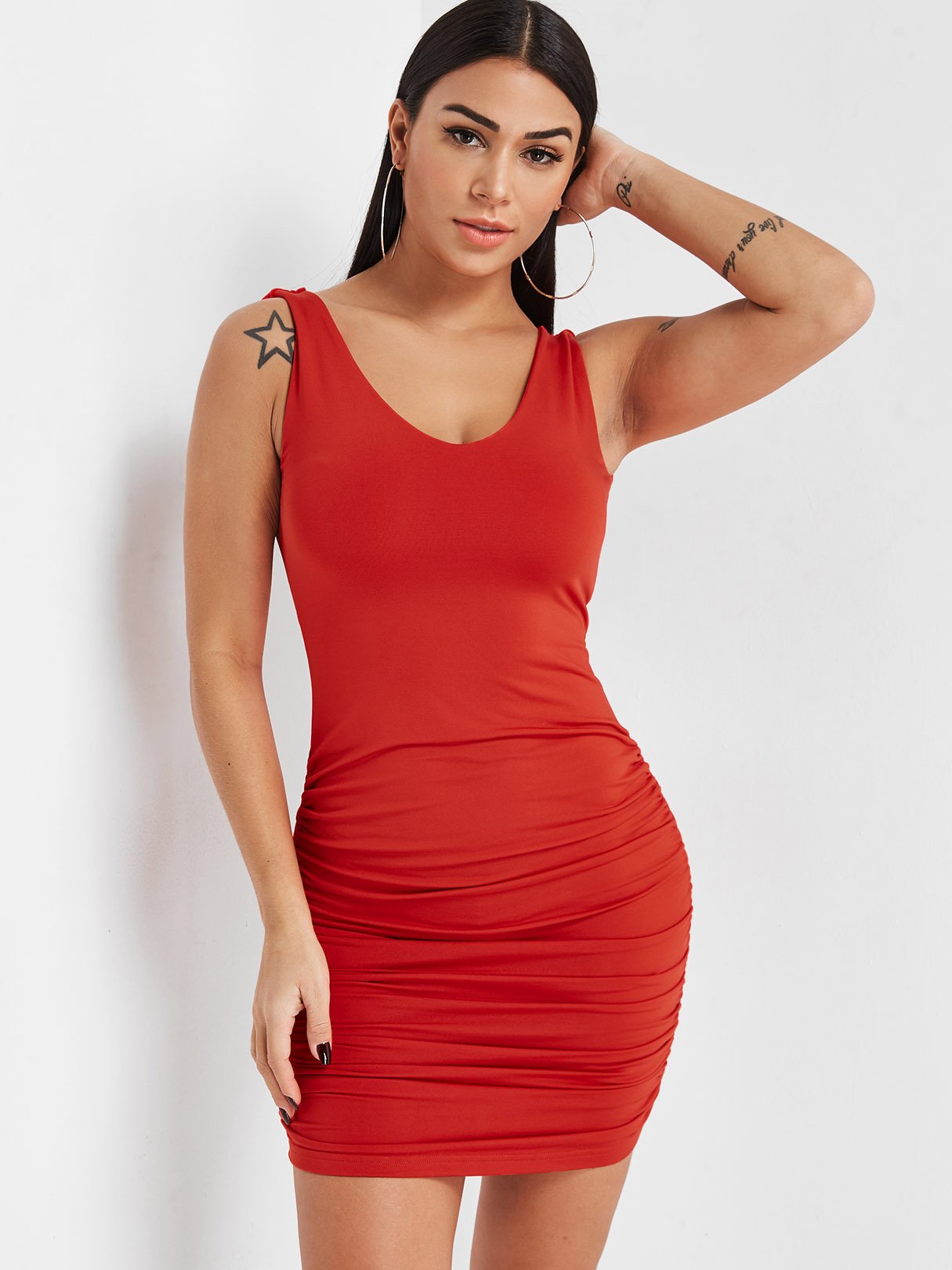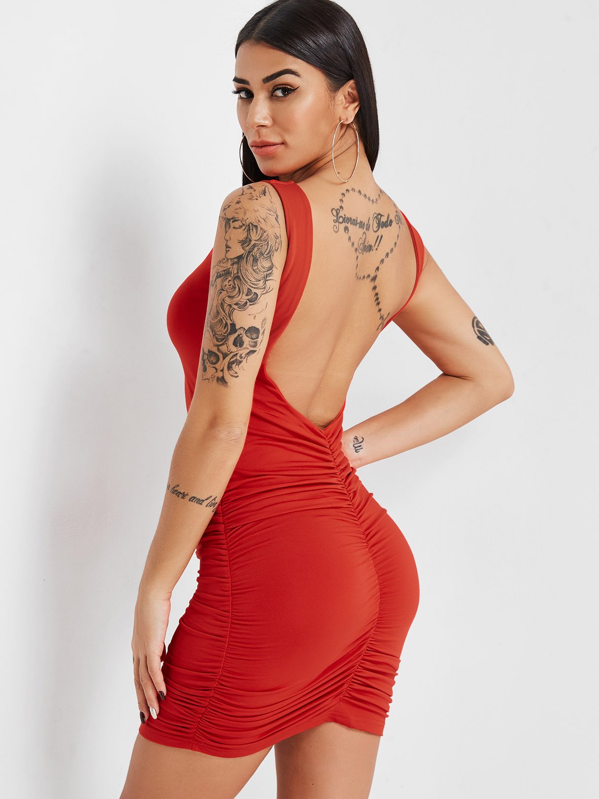 Red Scoop Neck Sleeveless Plain Backless Sexy Dresses