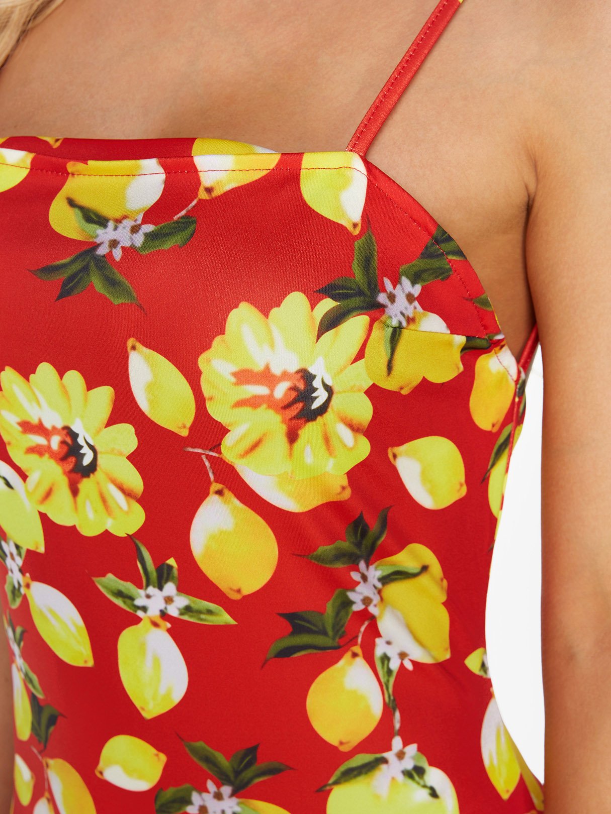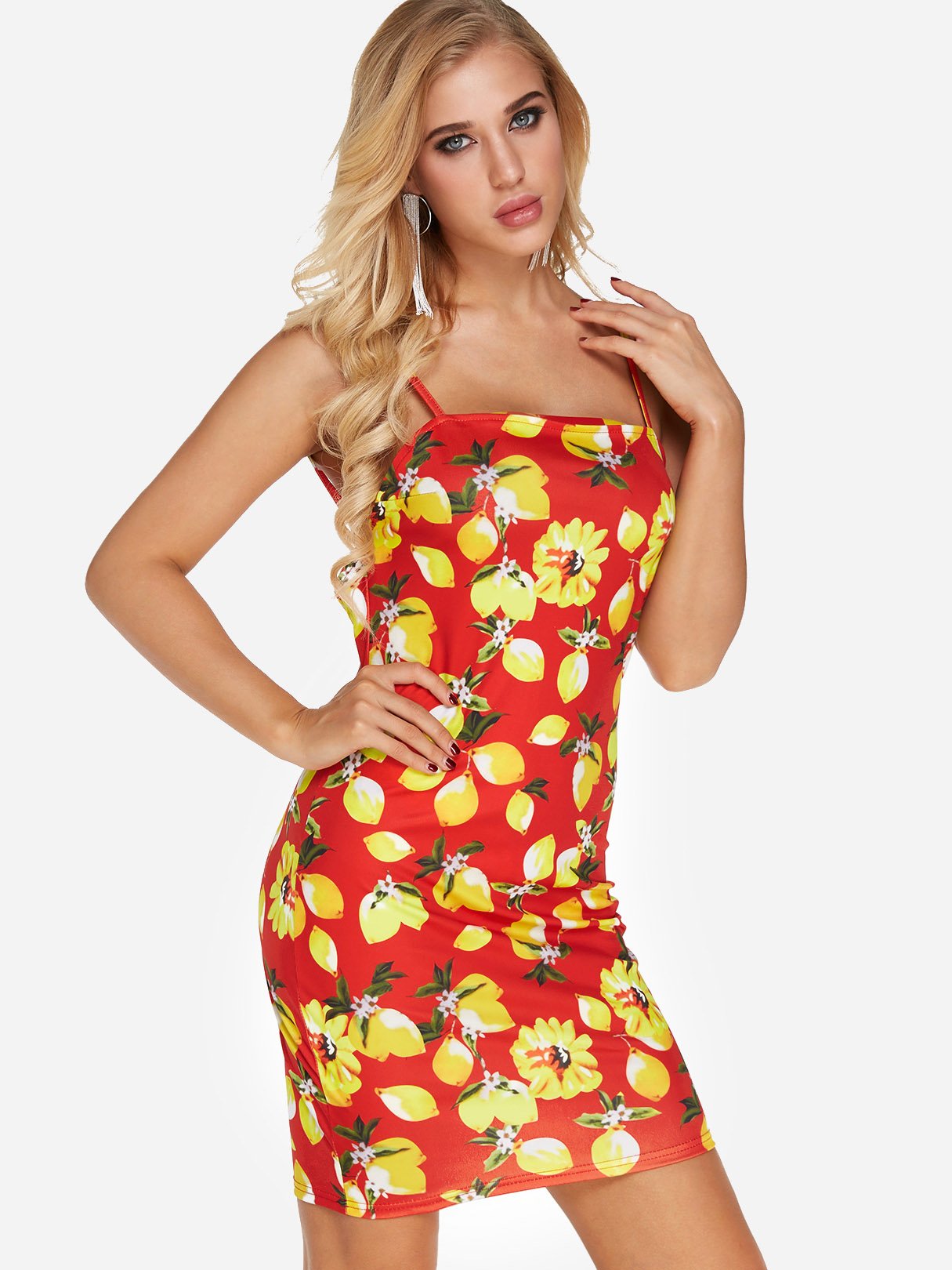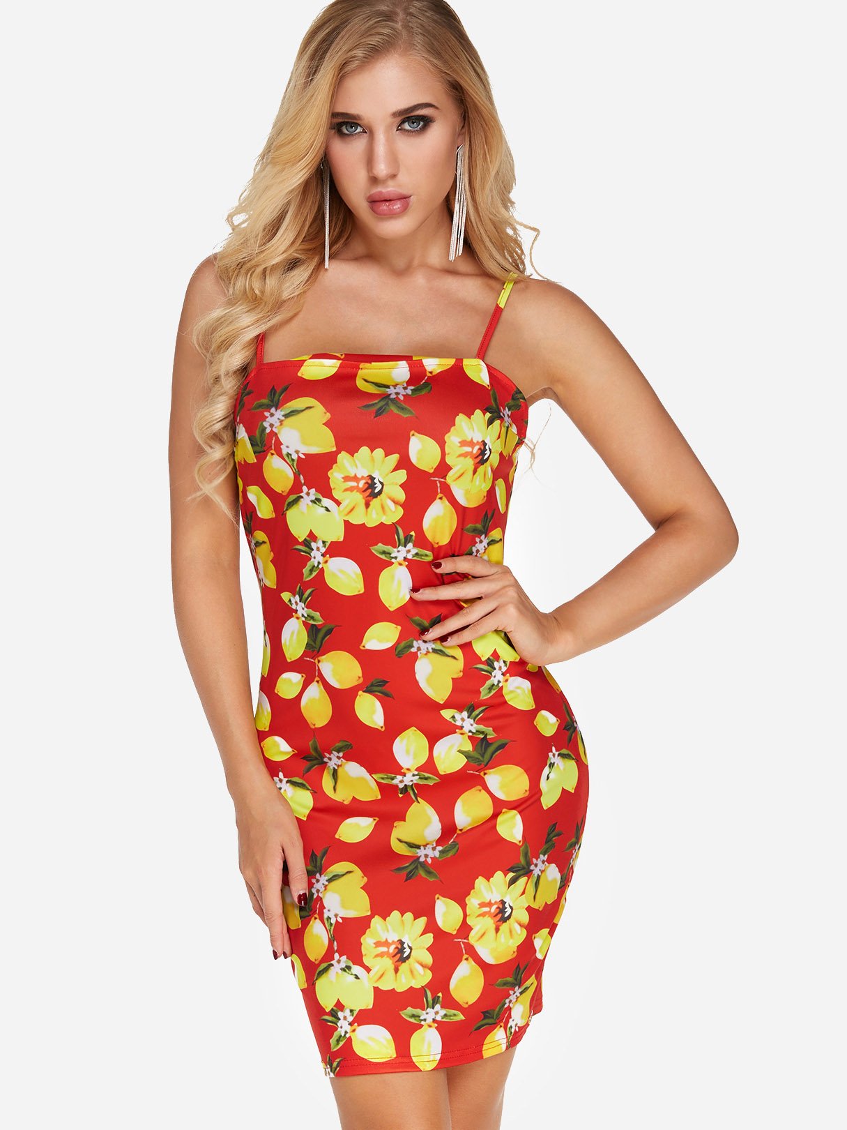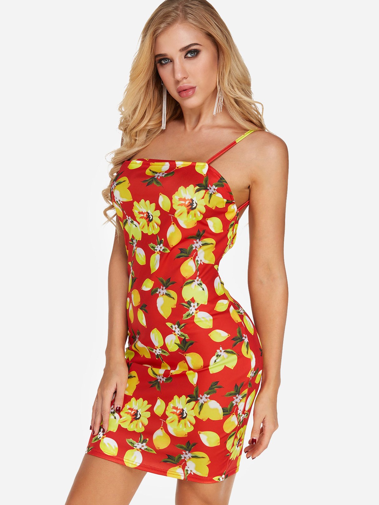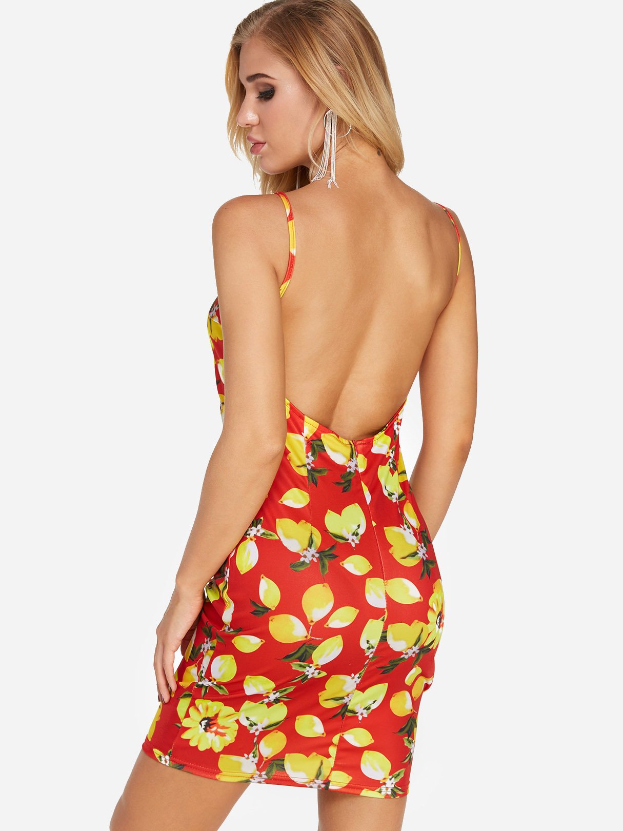 Red Sleeveless Floral Print Zip Back Backless Dresses