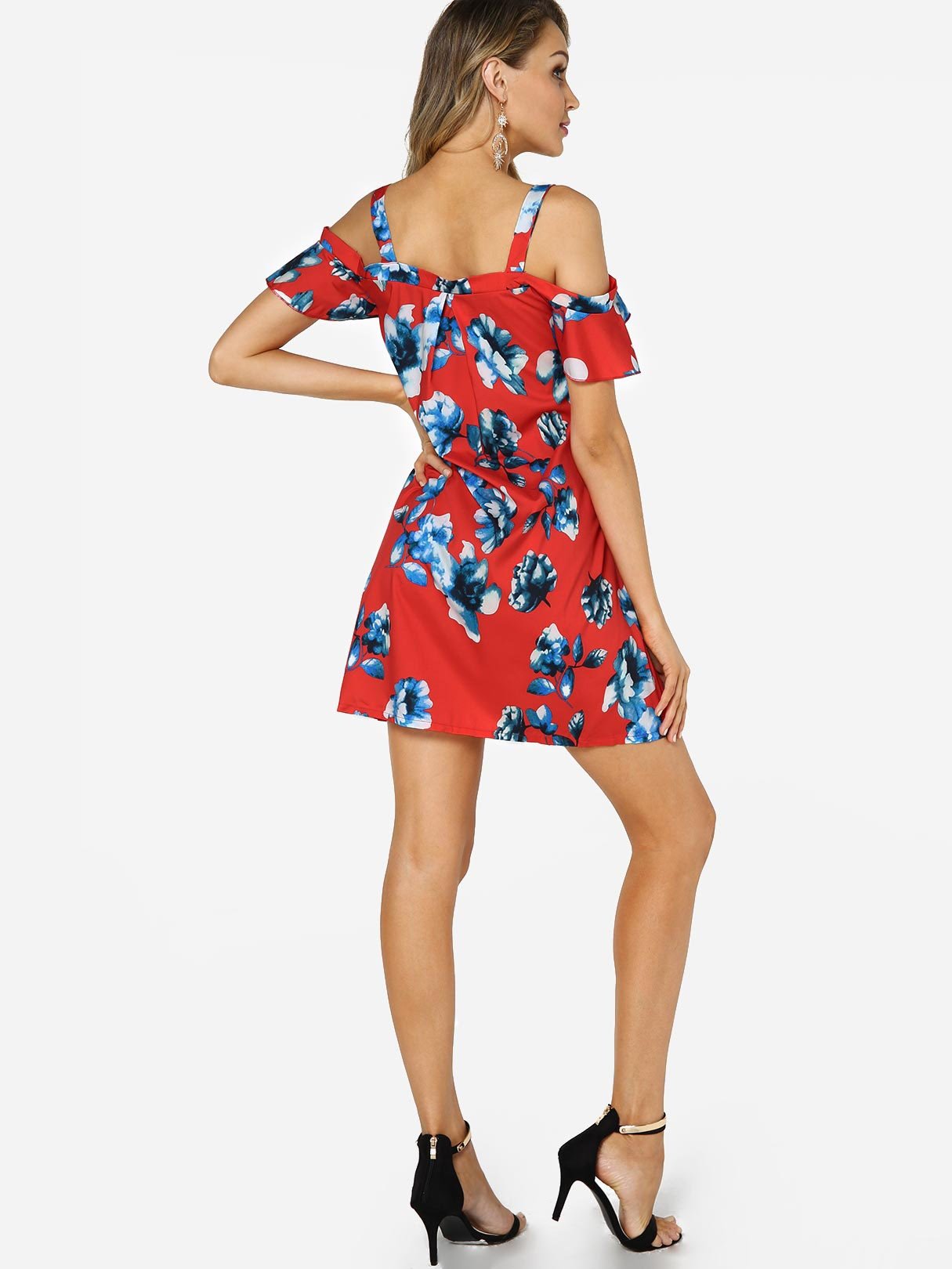 Red V-Neck Cold Shoulder Short Sleeve Floral Print Dresses - Red / S is backordered and will ship as soon as it is back in stock.