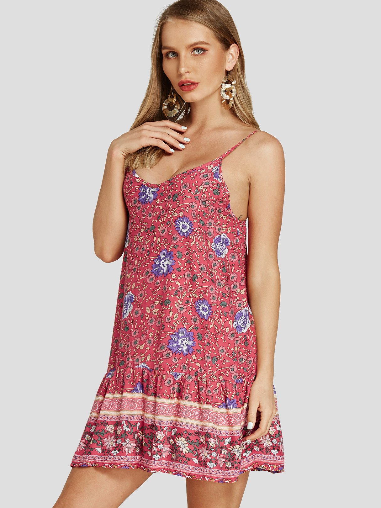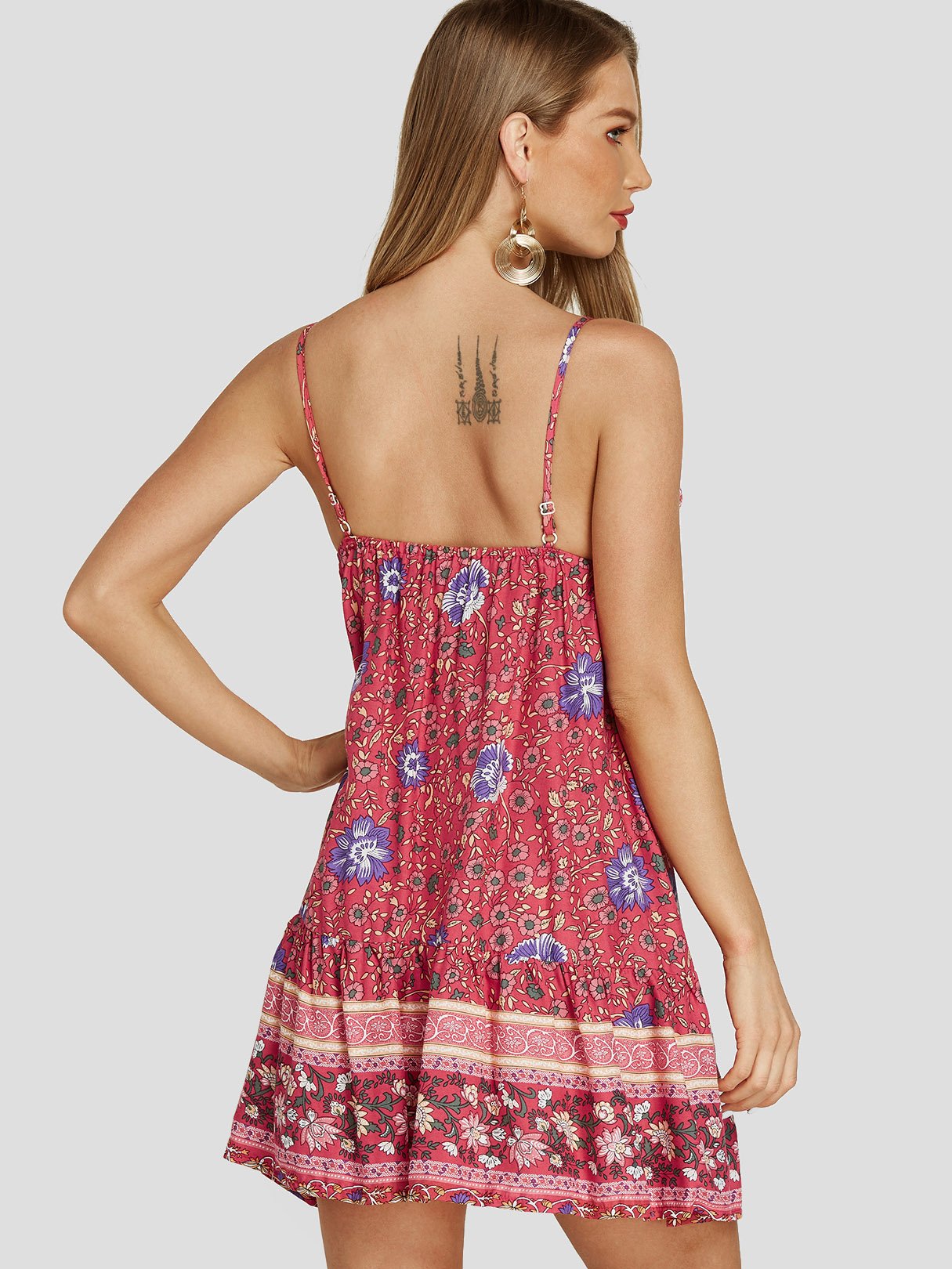 Material:Polyester,SpandexNeckline:V-NeckSeason:Spring,Summer,AutumnSleeves:SleevelessPattern:Floral PrintStyle:Vacation StyleDetail:Adjustable Shoulder Straps,Backless DesignHem Design:Flounced HemLength:MiniFit:Regular FitOccasion:Wedding Guest,Vacation