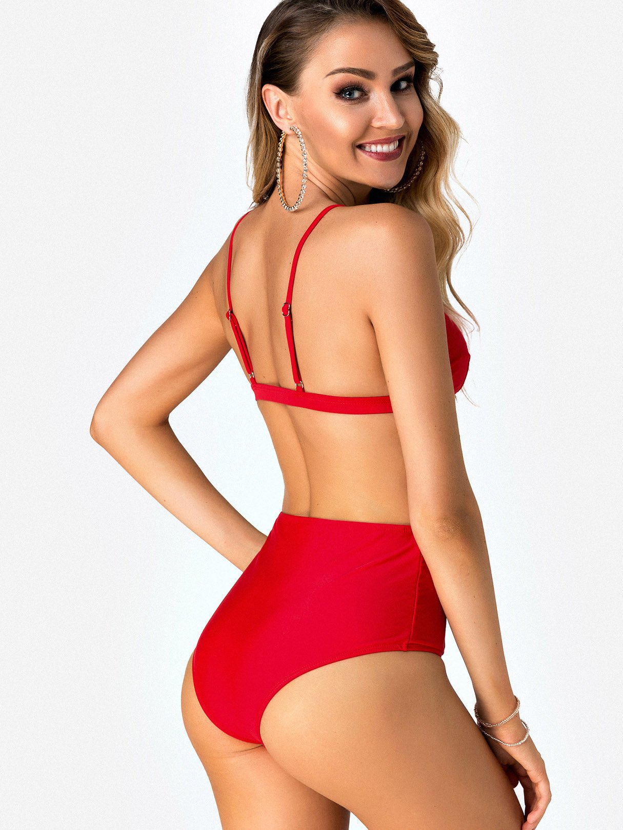 Red V-Neck Sleeveless Plain Backless High Waist Two Piece Bikinis
