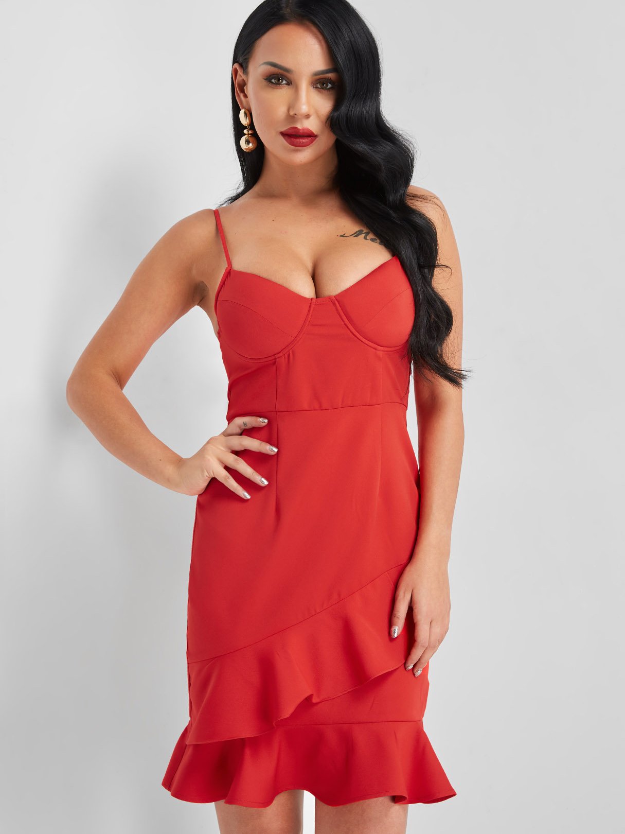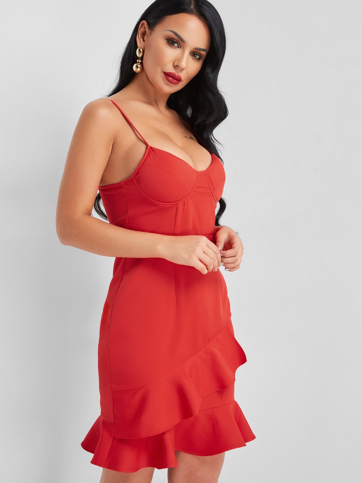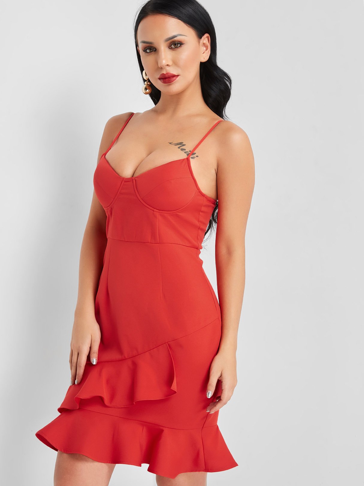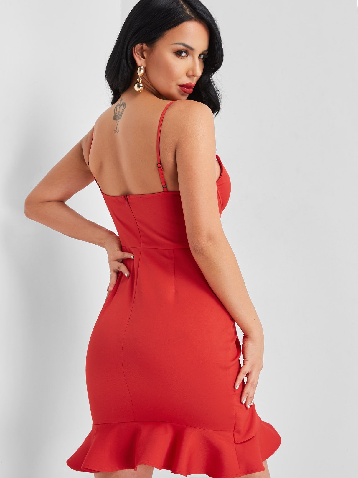 Red V-Neck Sleeveless Plain Backless Spaghetti Strap Ruffle Hem Sexy Dresses