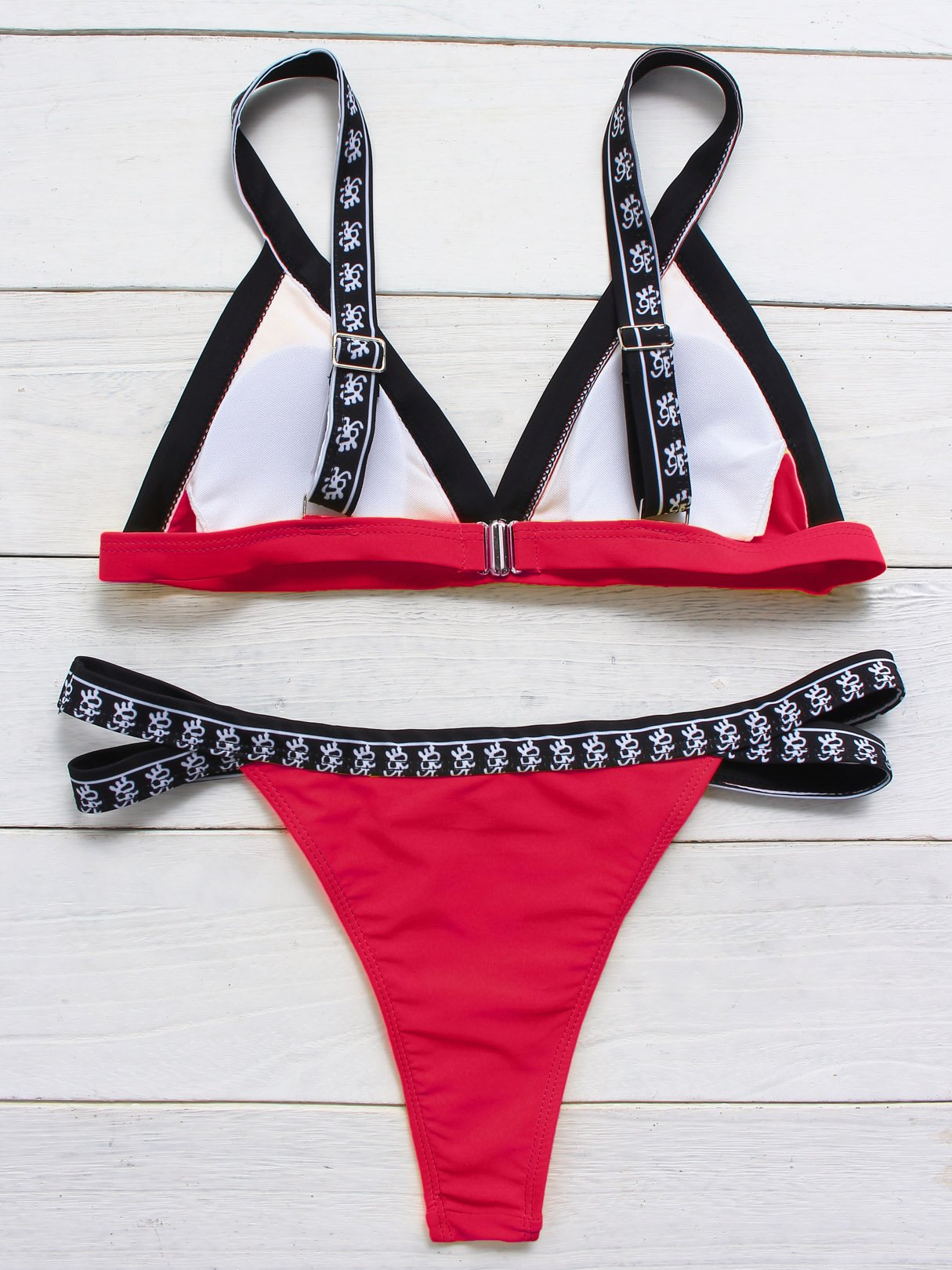 Red V-Neck Sleeveless Plain Cut Out Bikini Suit