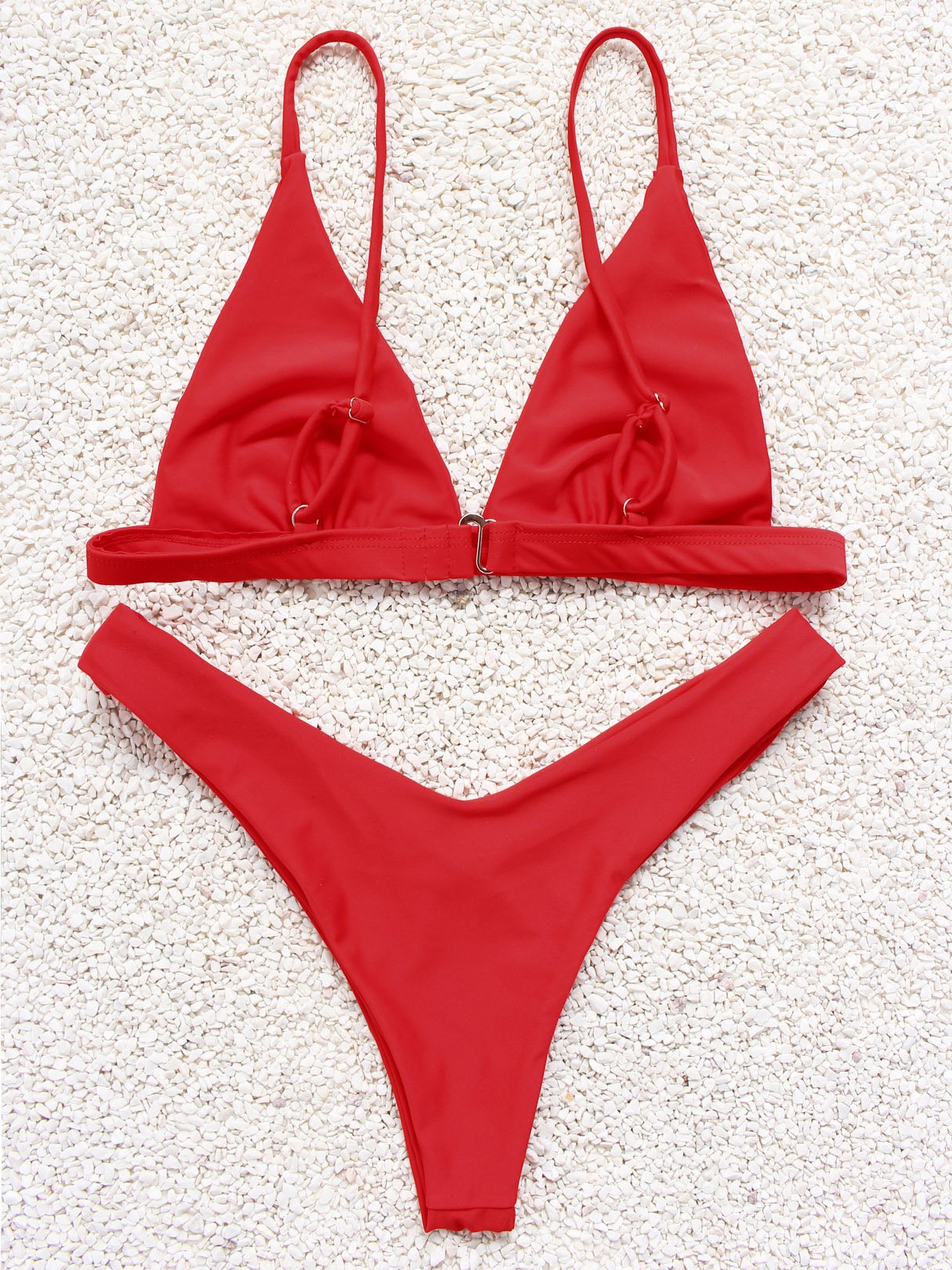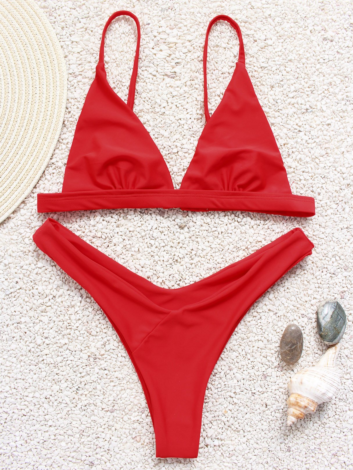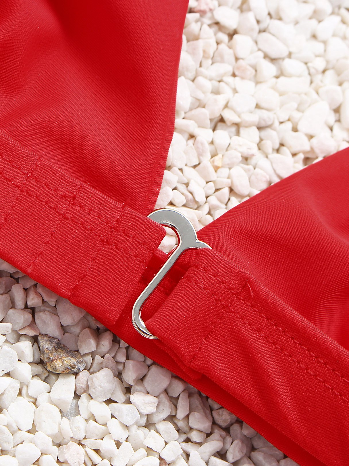 Red V-Neck Sleeveless Plain Two Piece Bikini