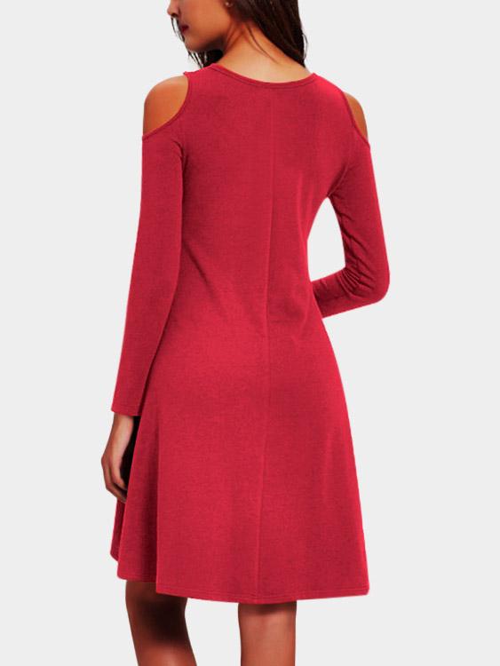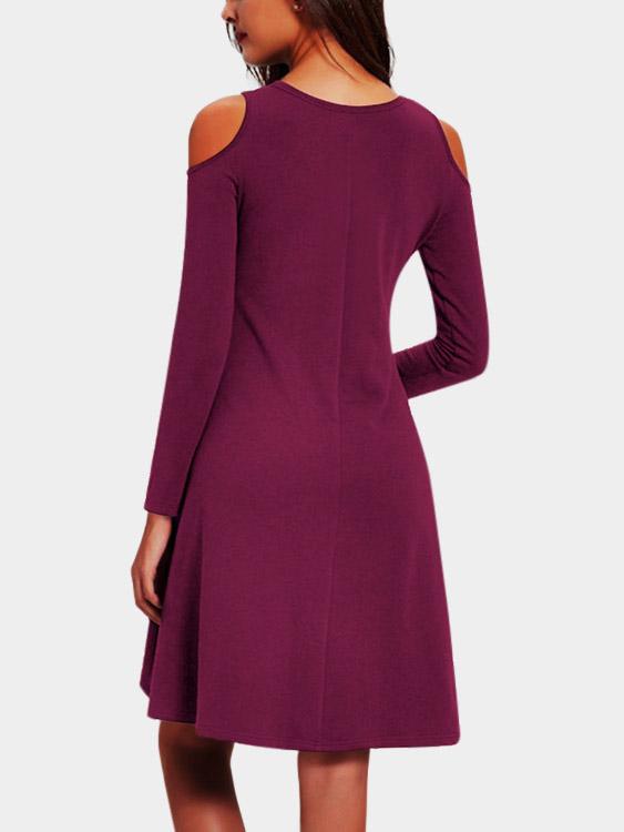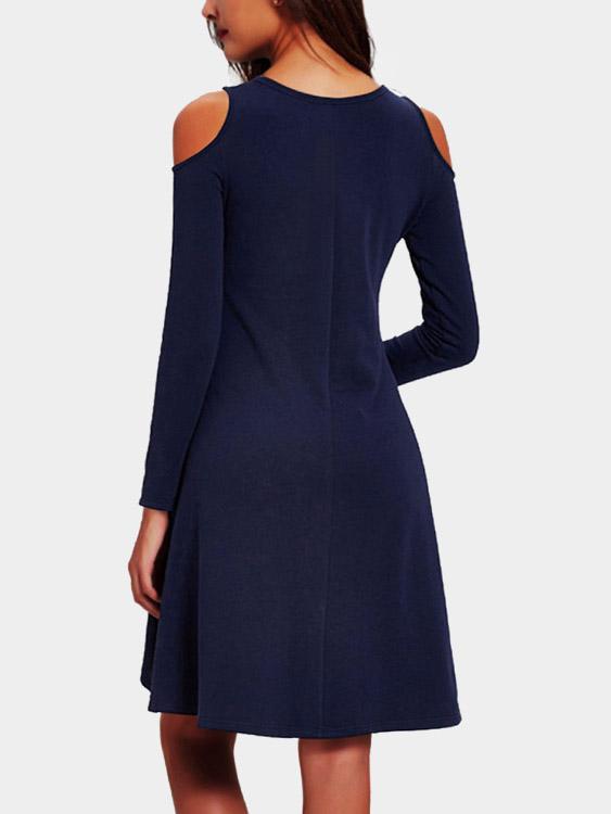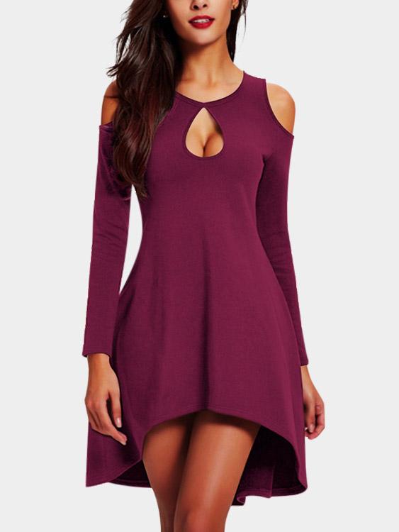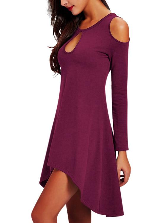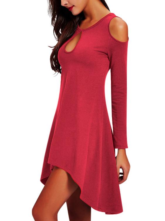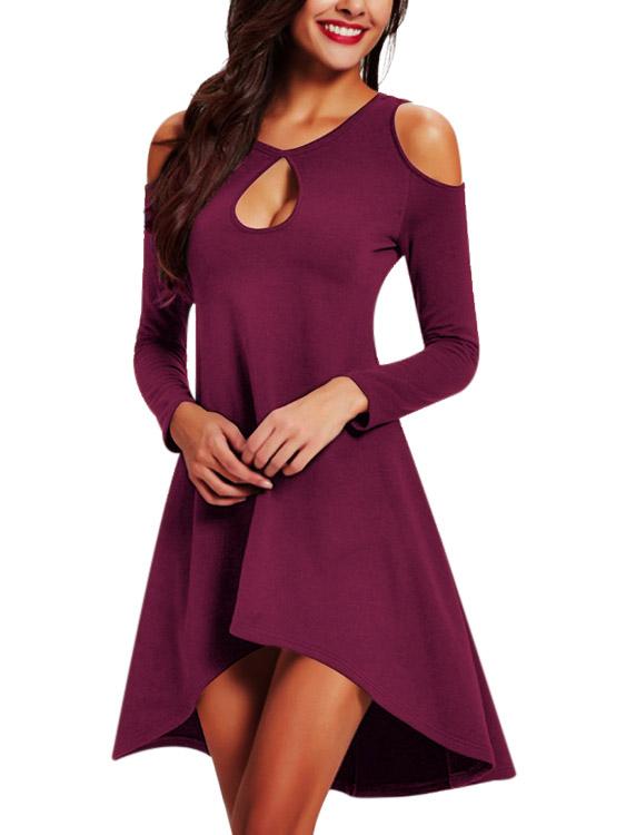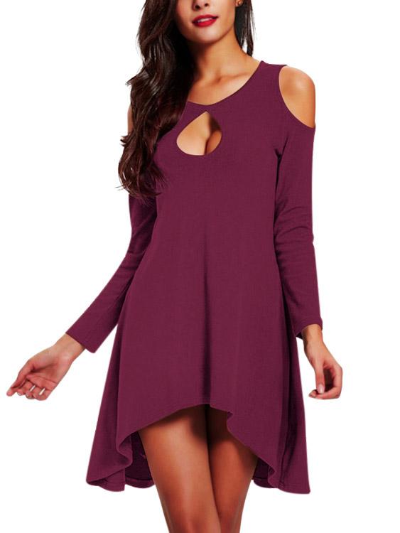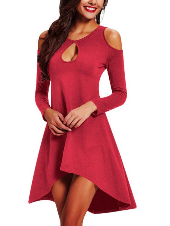 Round Neck Cold Shoulder Long Sleeve Plain Cut Out Irregular Hem High-Waisted Sexy Dresses