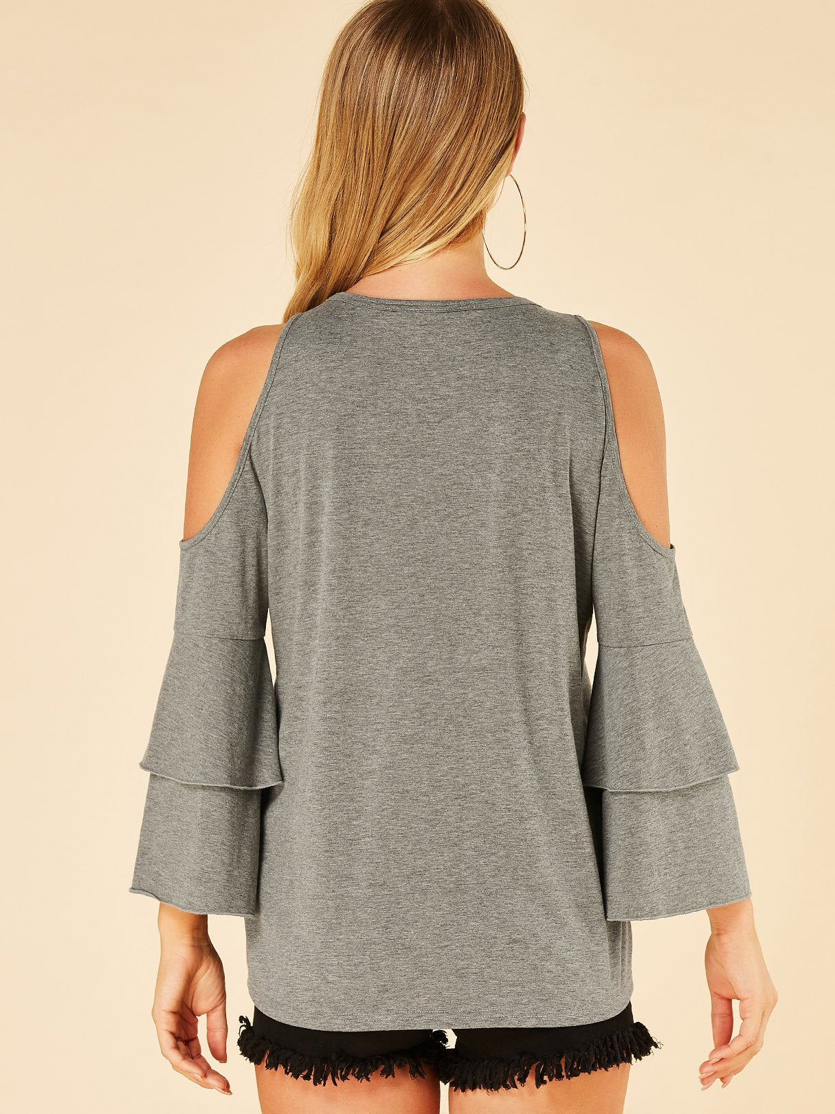Round Neck Cold Shoulder Plain Double Layer Long Sleeve Grey Blouses