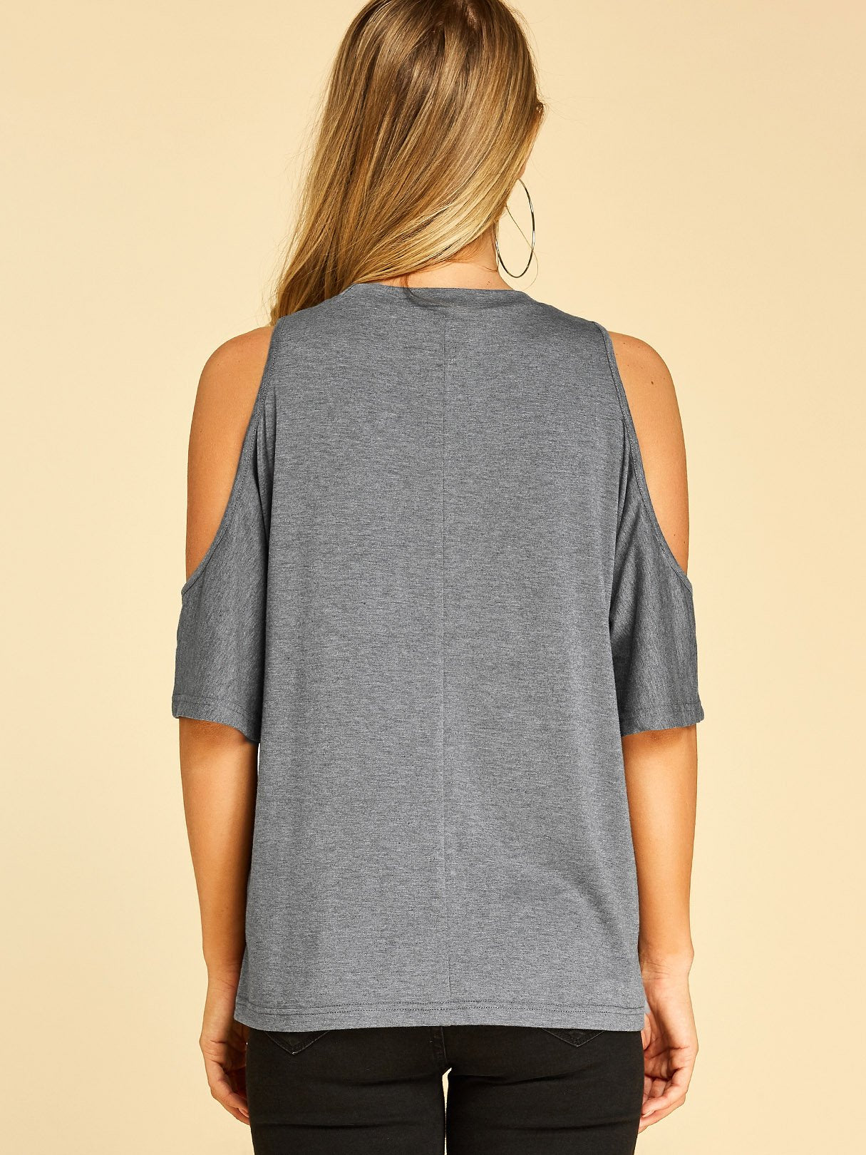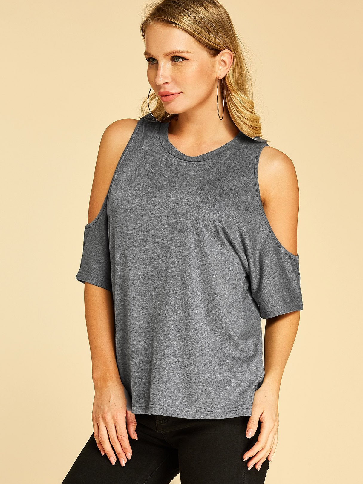Round Neck Cold Shoulder Plain Half Sleeve Gray Blouses