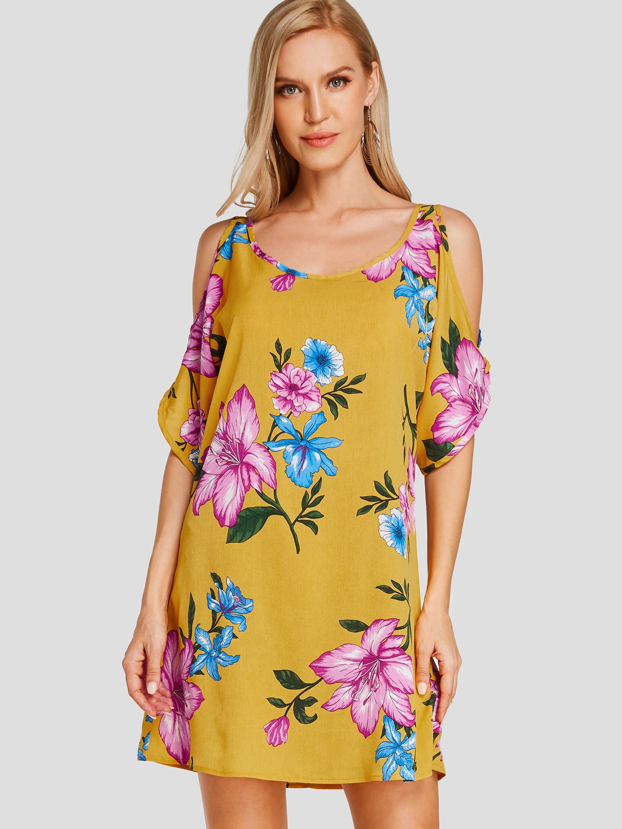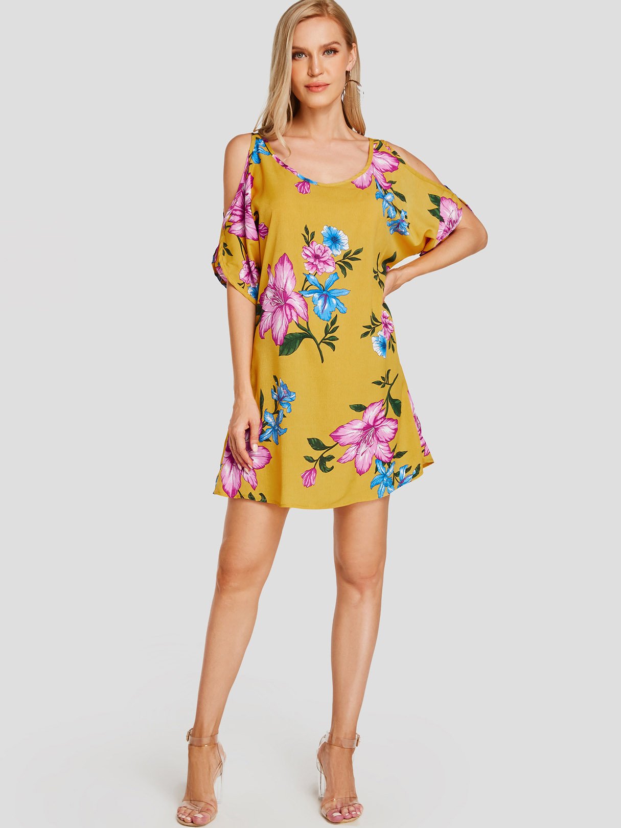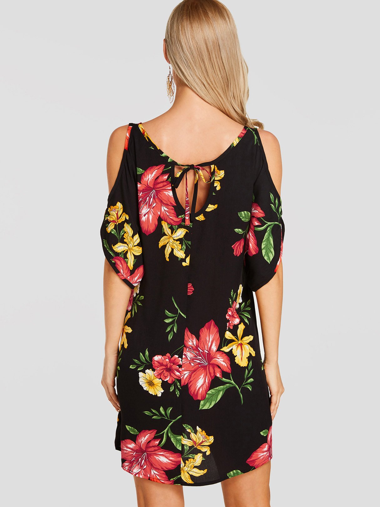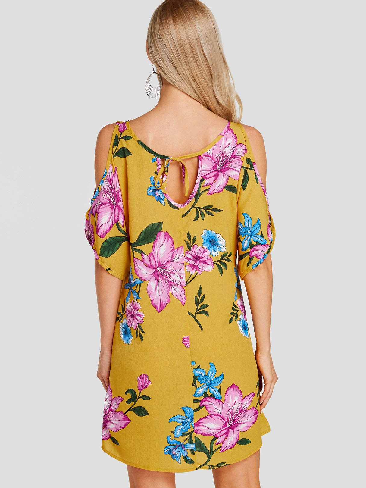 Material:PolyesterNeckline:Round Neck,Cold ShoulderSeason:Spring,SummerSleeves:Short SleevesPattern:Floral PrintStyle:Casual StyleDetail:Lace-Up DesignWaist Design:Loose WaistLength:MiniFit:Loose FitOccasion:Vacation