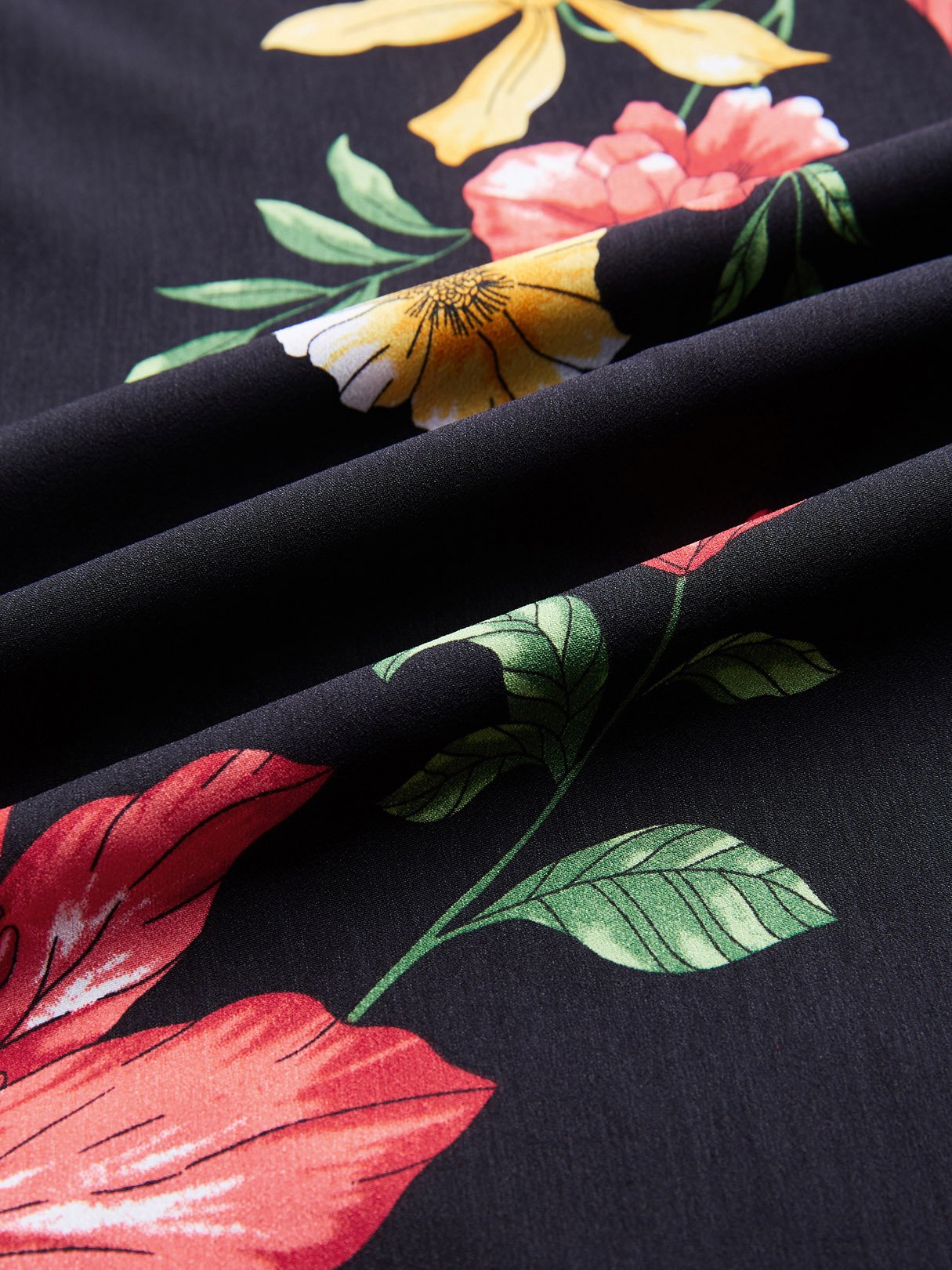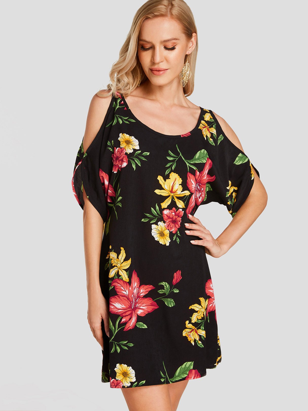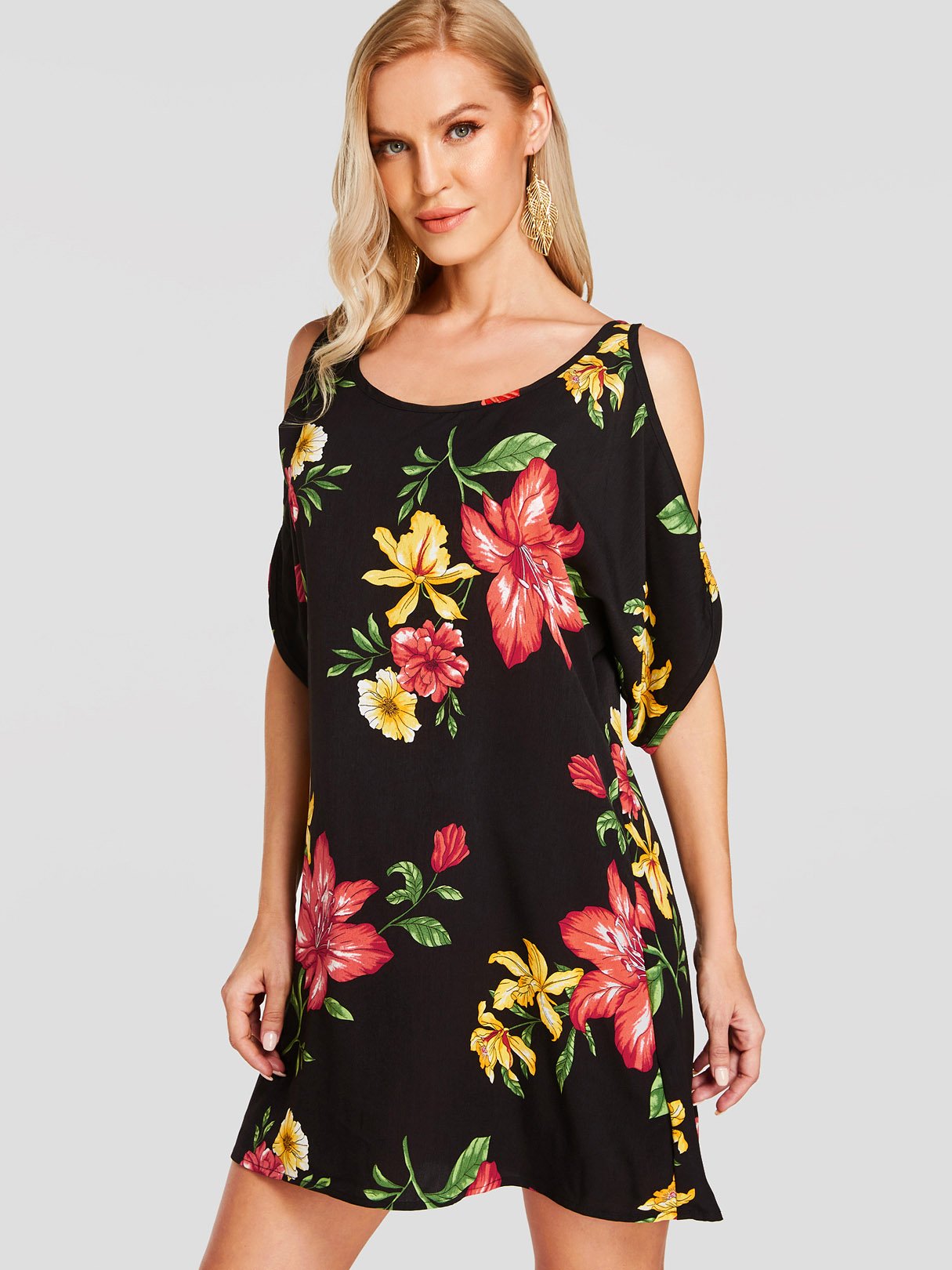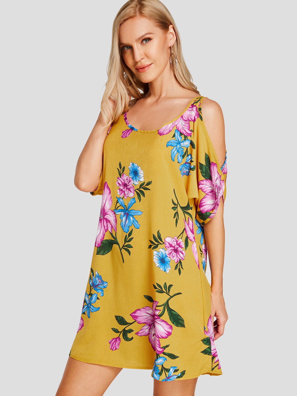 Material:PolyesterNeckline:Round Neck,Cold ShoulderSeason:Spring,SummerSleeves:Short SleevesPattern:Floral PrintStyle:Casual StyleDetail:Lace-Up DesignWaist Design:Loose WaistLength:MiniFit:Loose FitOccasion:Vacation