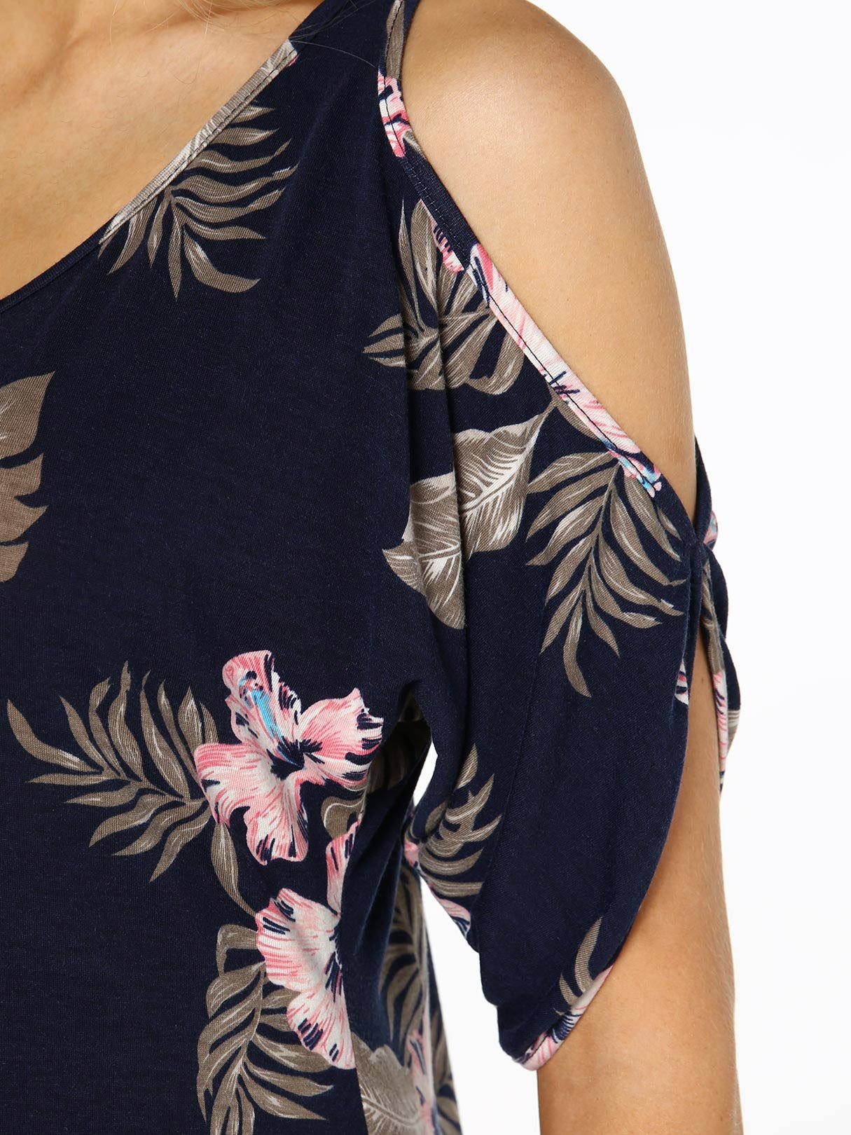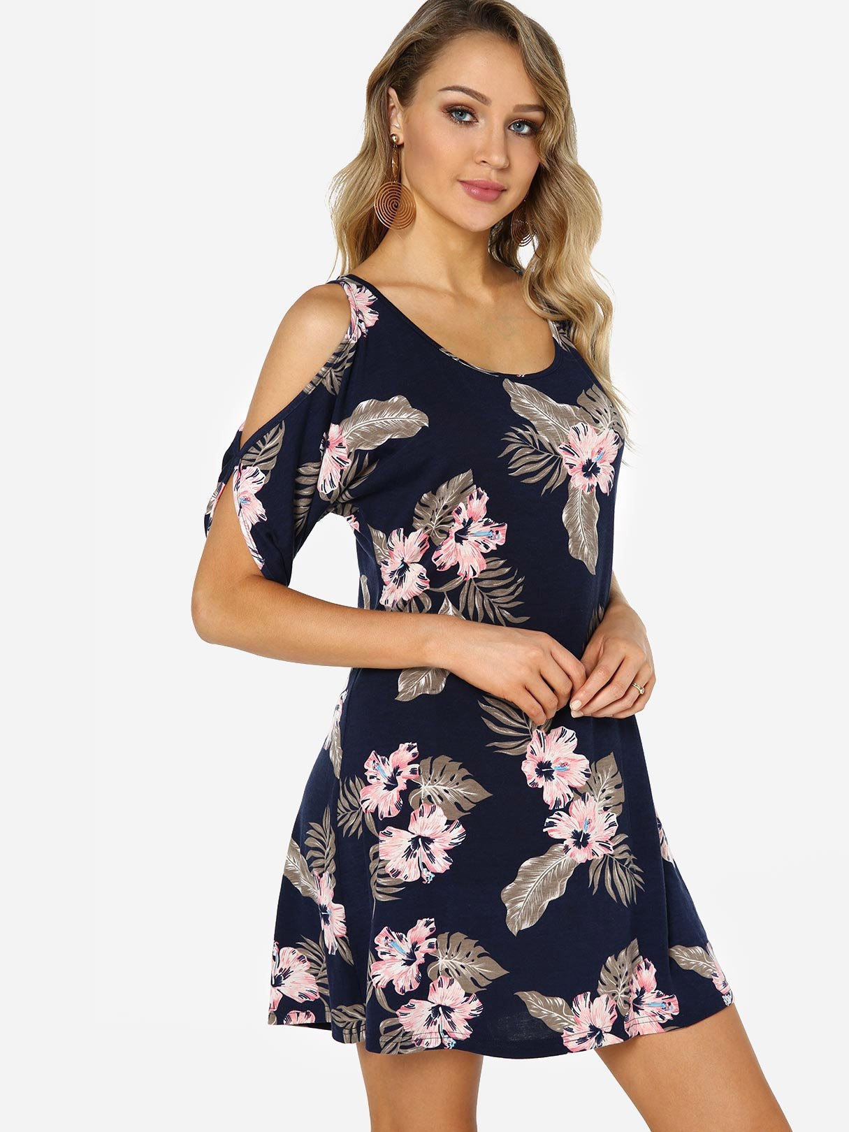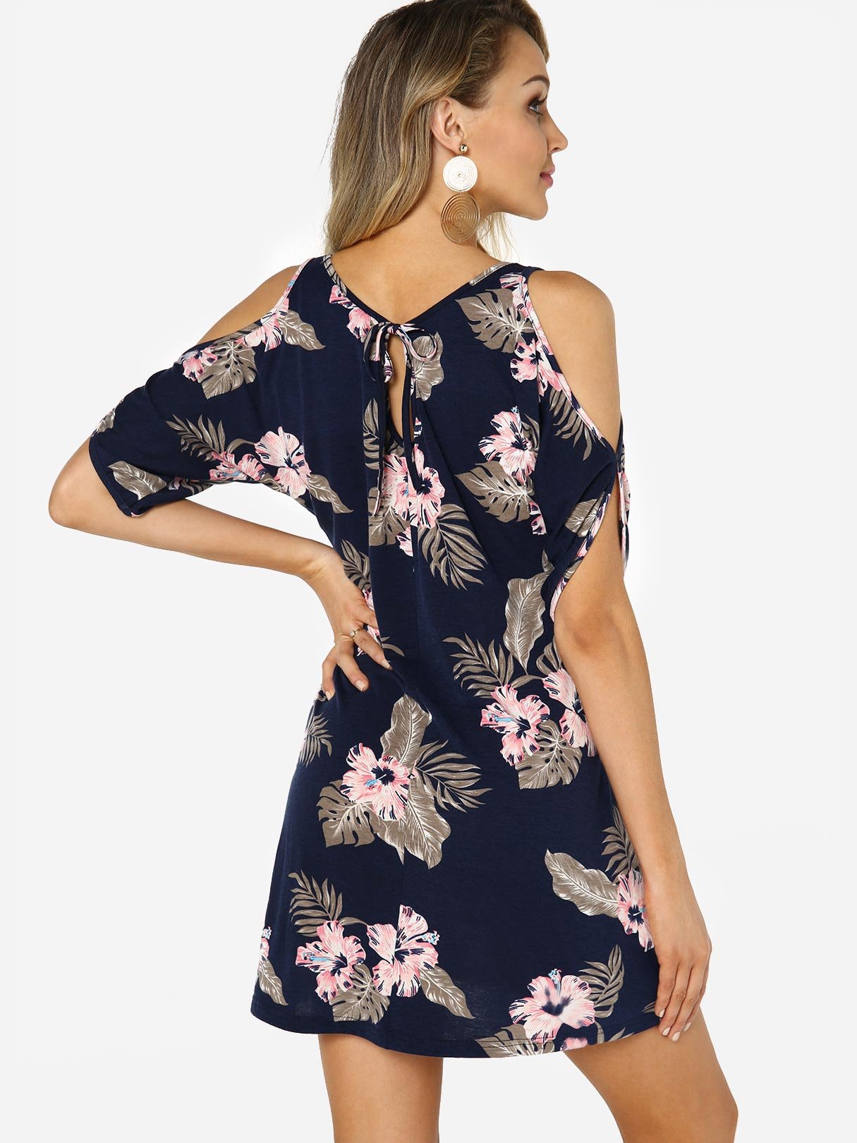 Round Neck Cold Shoulder Short Sleeve Floral Print Lace-Up Mini Dresses - Navy / S is backordered and will ship as soon as it is back in stock.