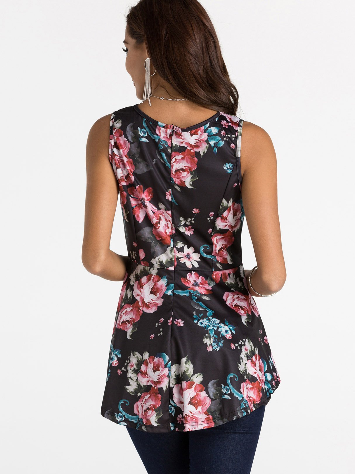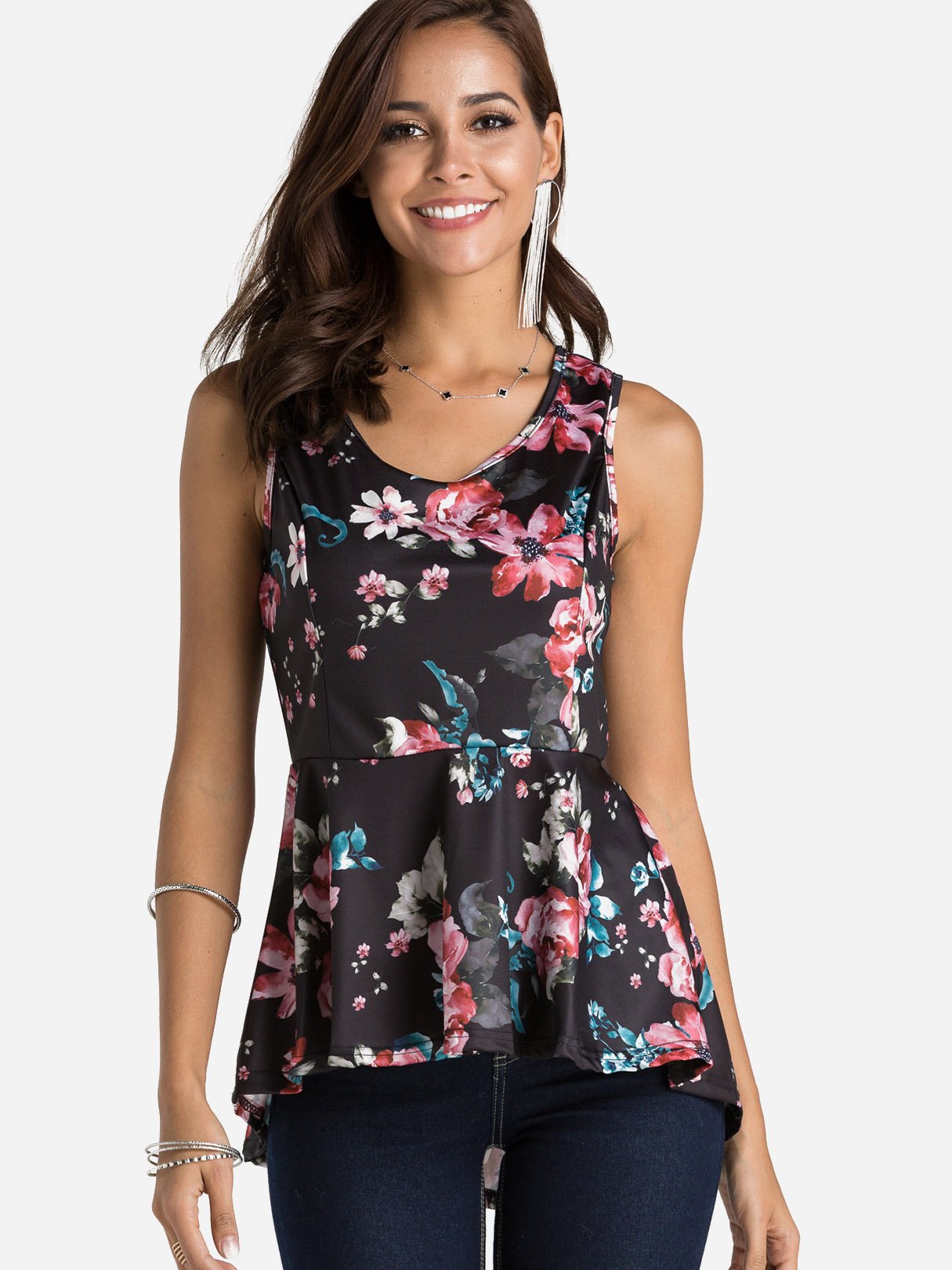 Round Neck Floral Print Sleeveless Flounced Hem Black Tank Top