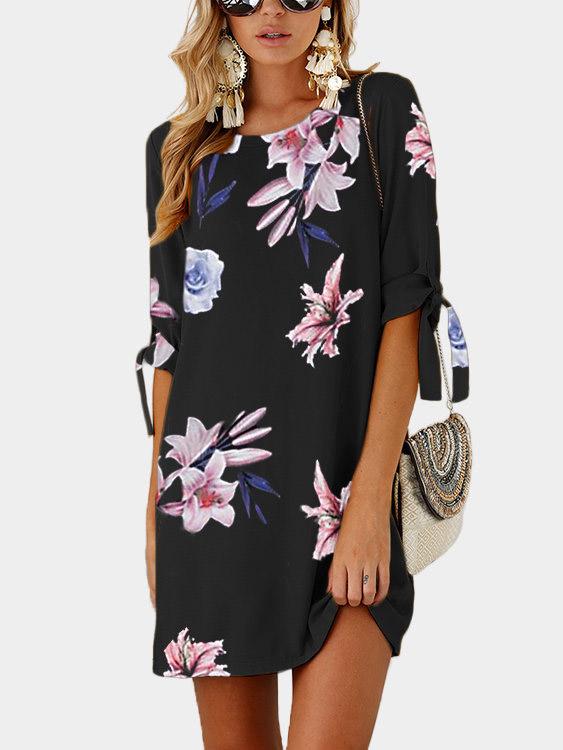 Round Neck Half Sleeve Floral Print Self-Tie Navy Mini Dress