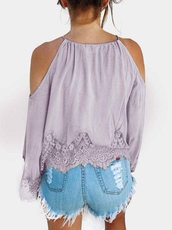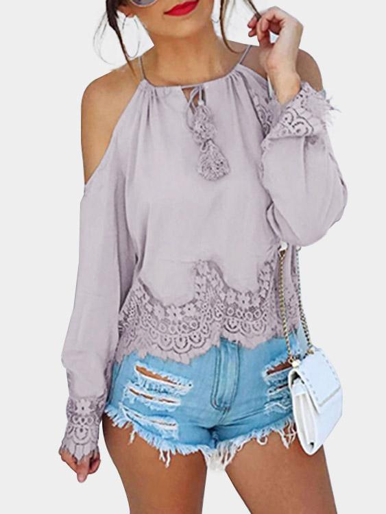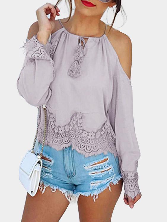 Round Neck Lace Long Sleeve Light Purple Blouses