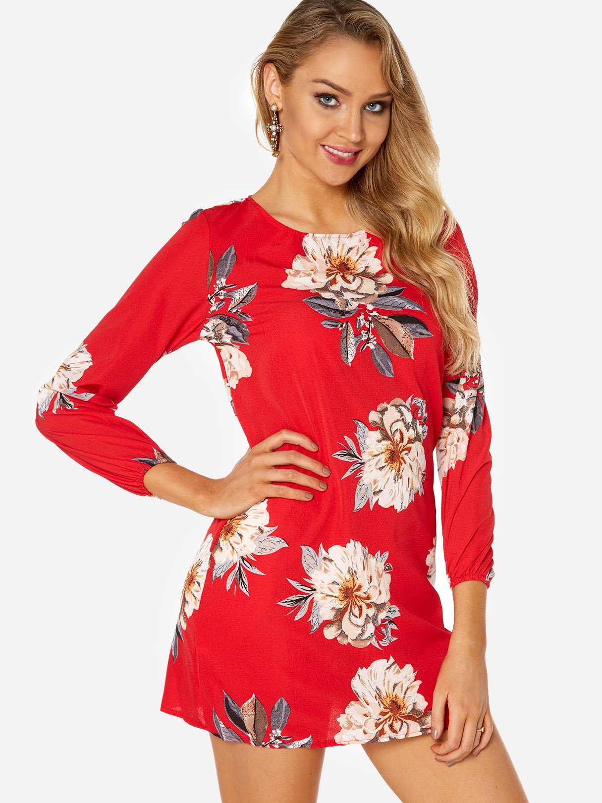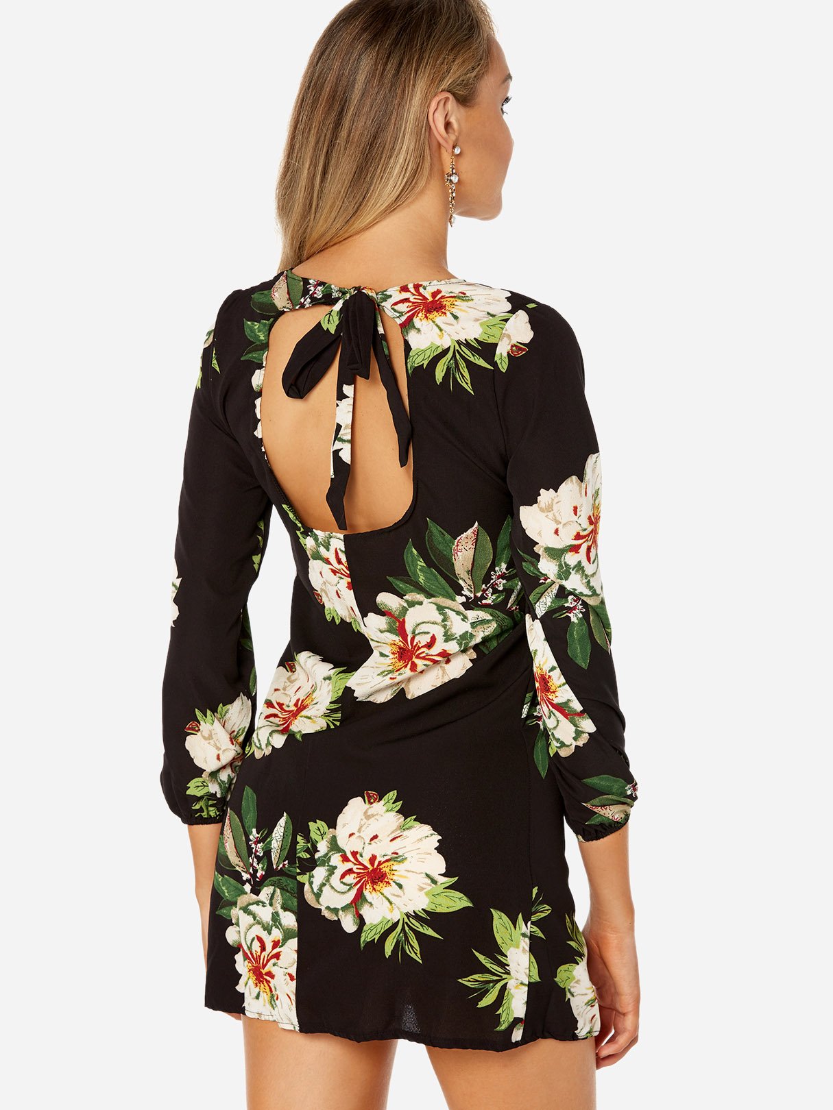 Round Neck Long Sleeve Floral Print Backless Lace-Up Dresses