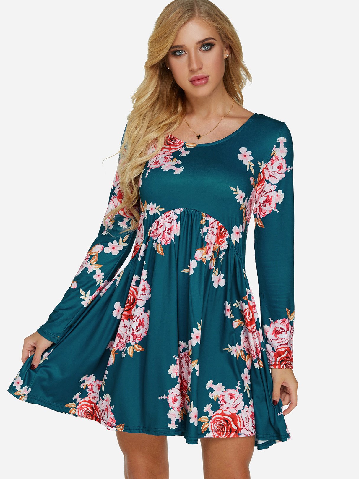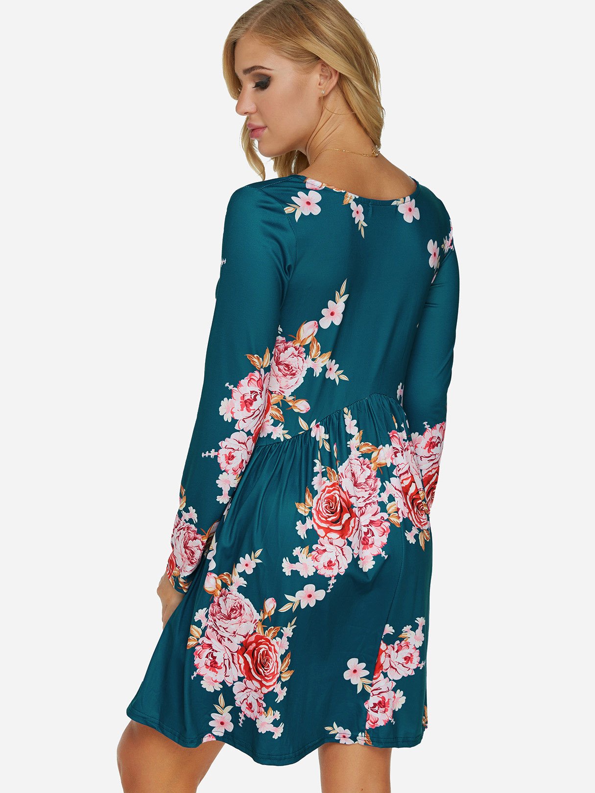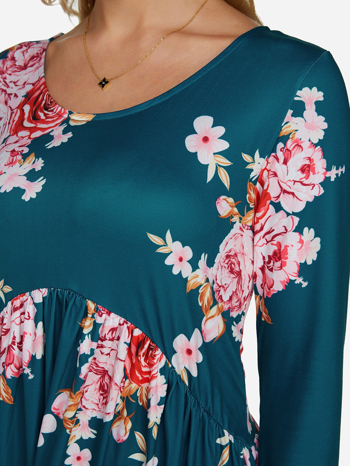 Round Neck Long Sleeve Floral Print Ruffle Hem Dresses