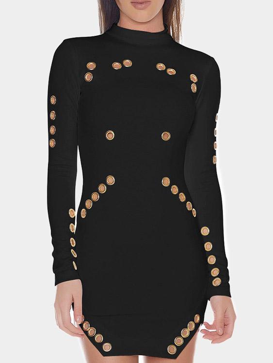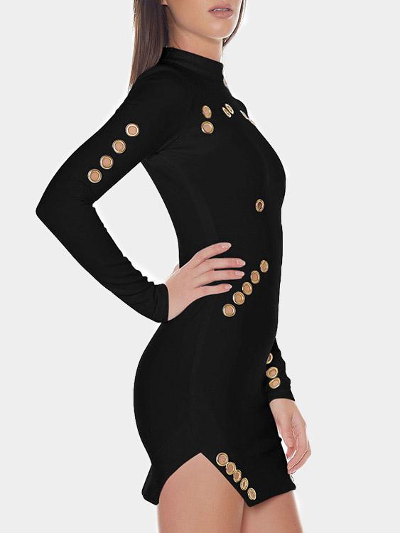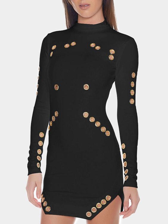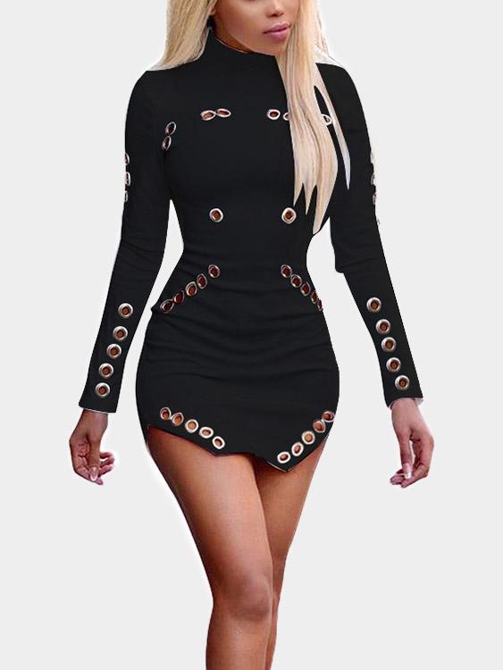 Round Neck Long Sleeve Hollow Irregular Hem Black Mini Dress