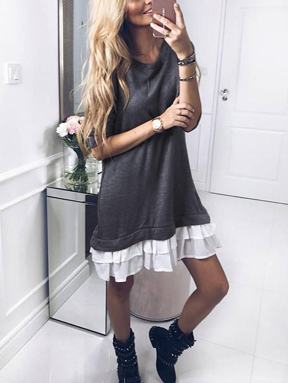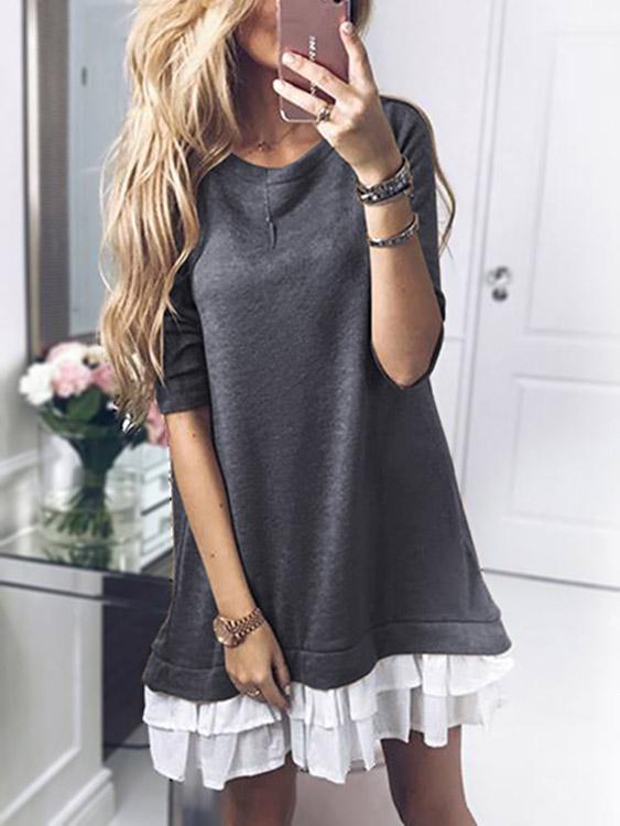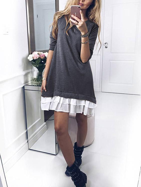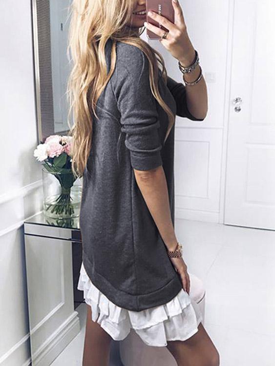 Round Neck Plain Long Sleeve Ruffle Hem Grey Midi Dress