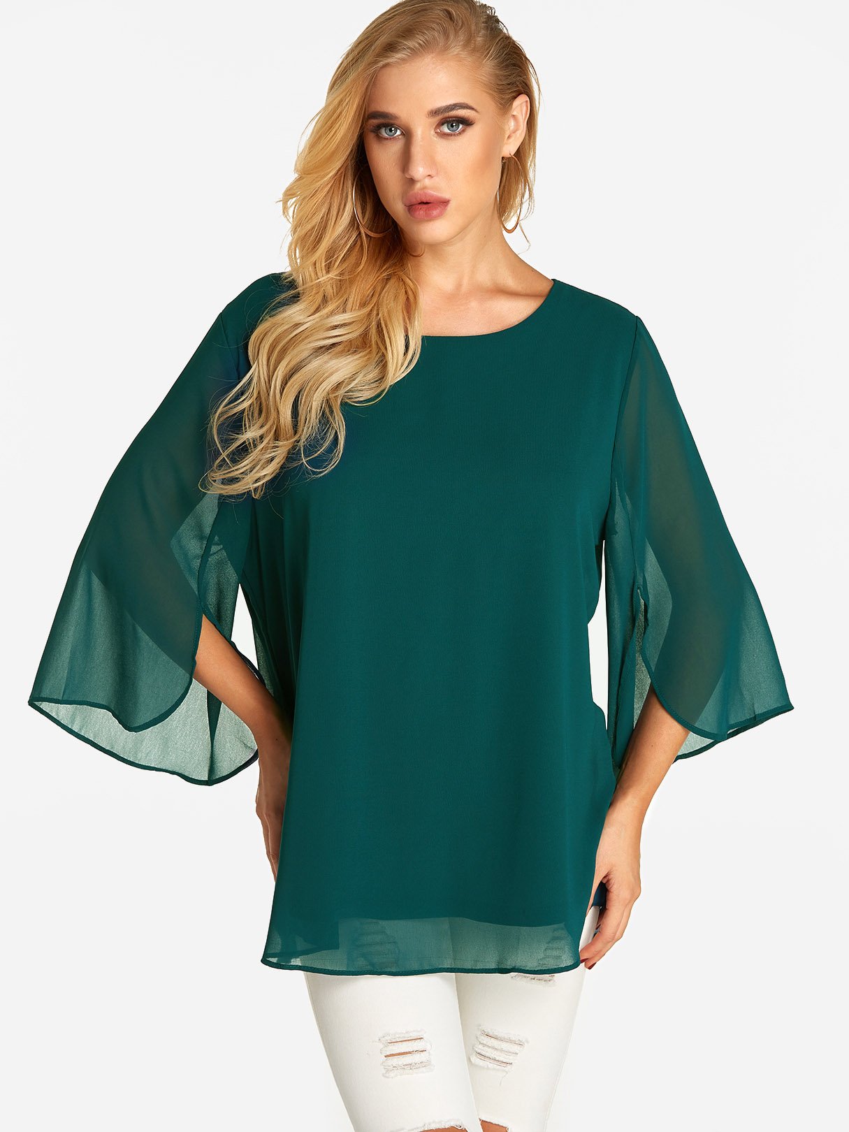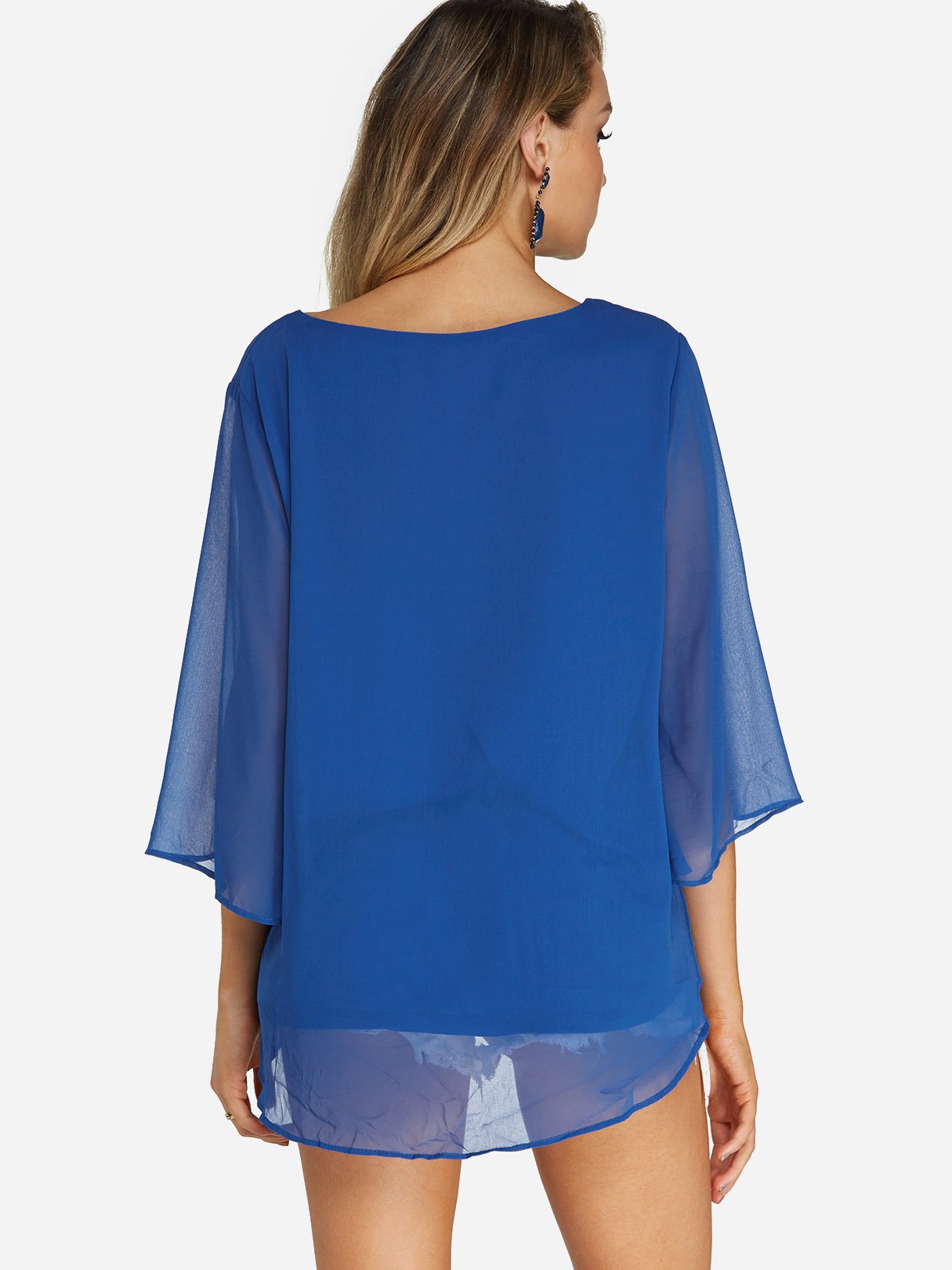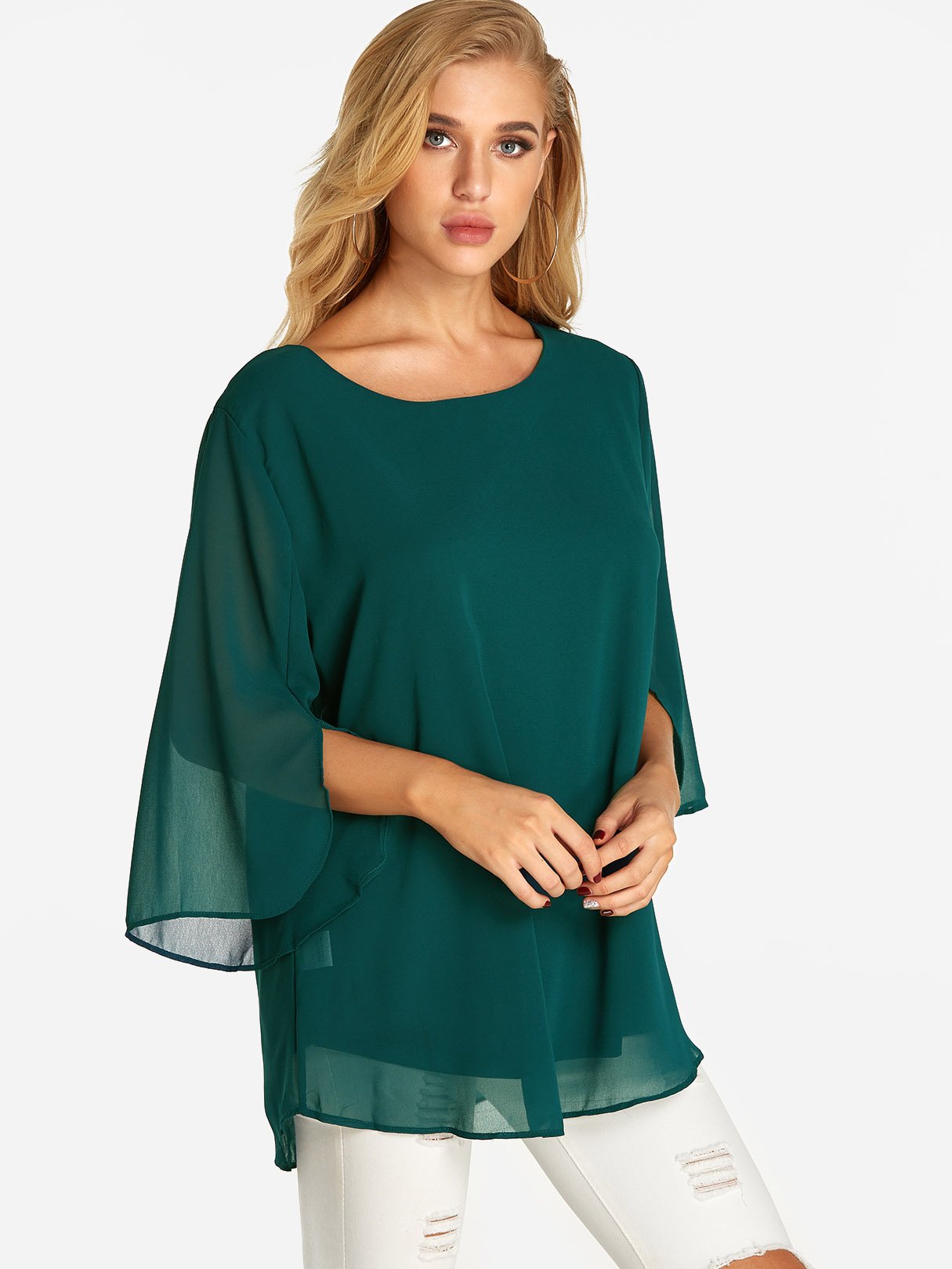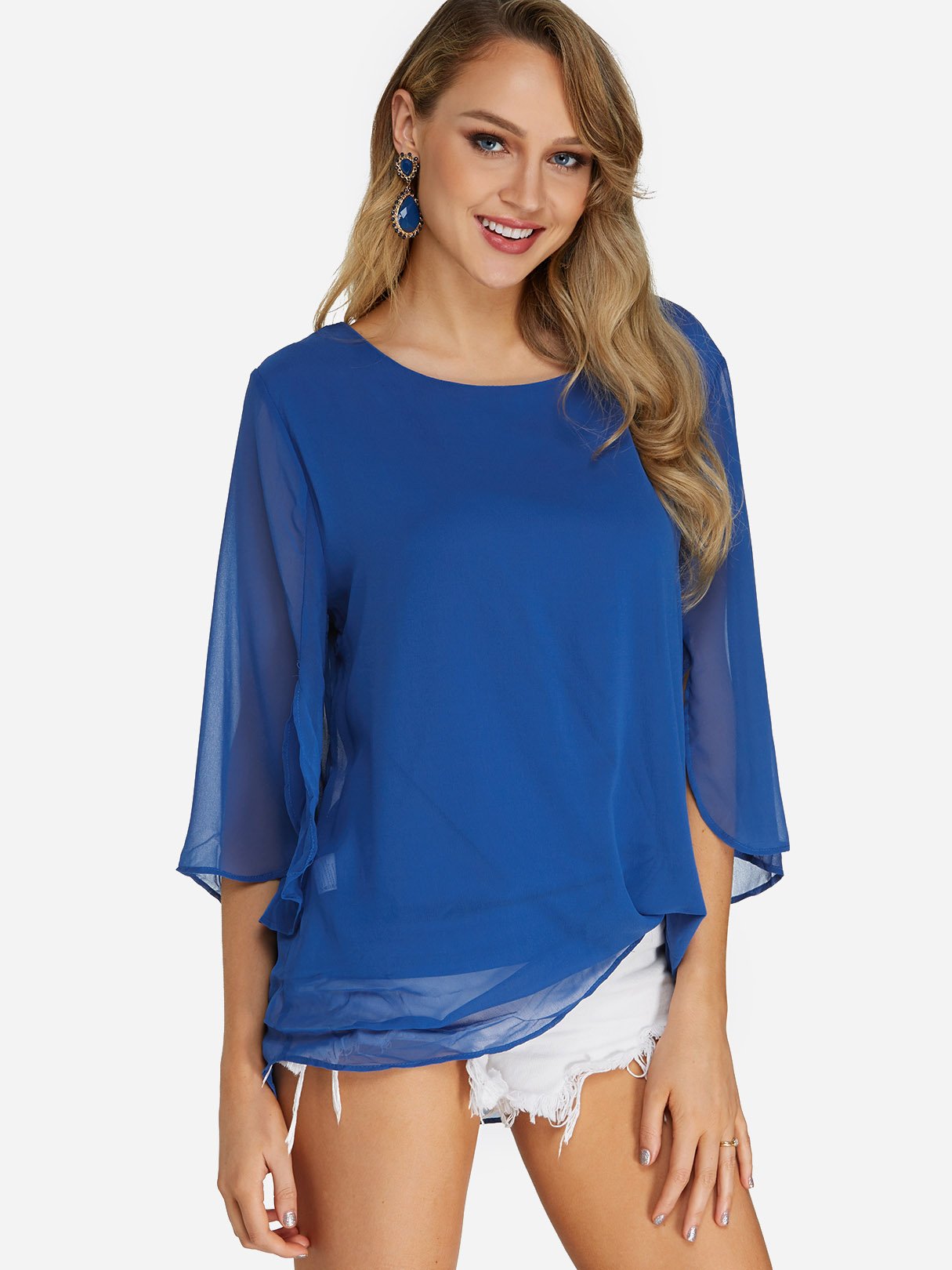 Round Neck Plain Tiered 3/4 Sleeve Blouses