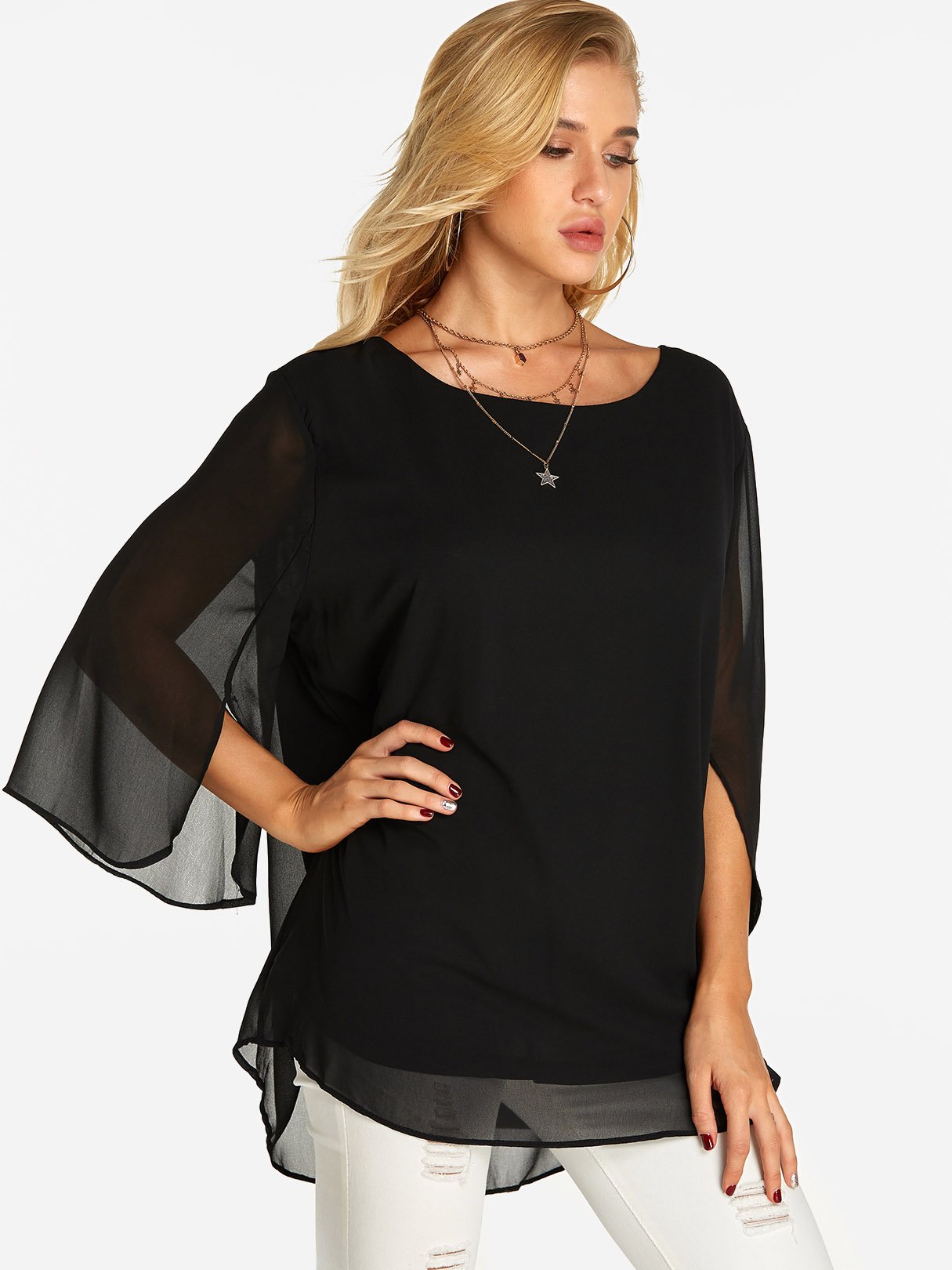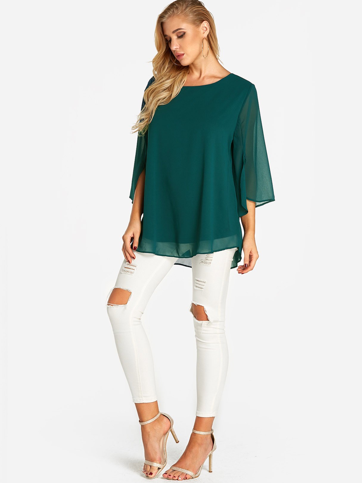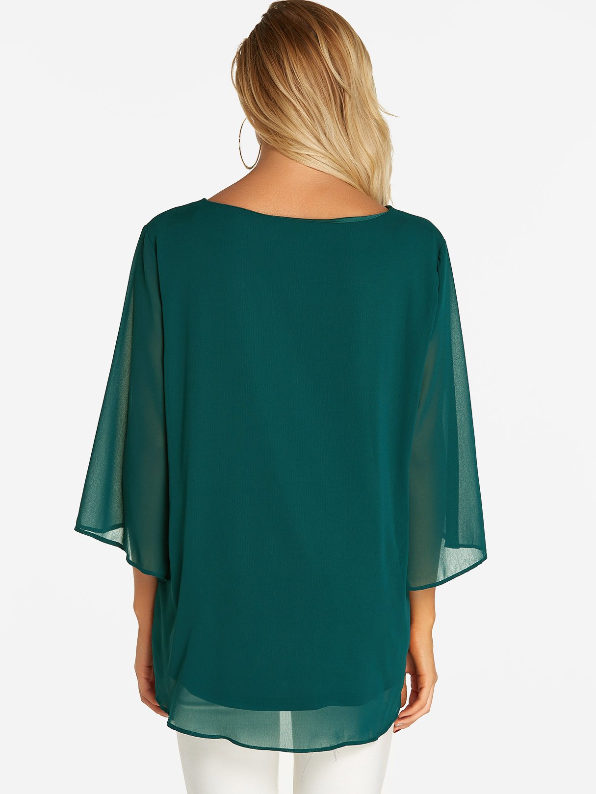 Round Neck Plain Tiered 3/4 Sleeve Blouses