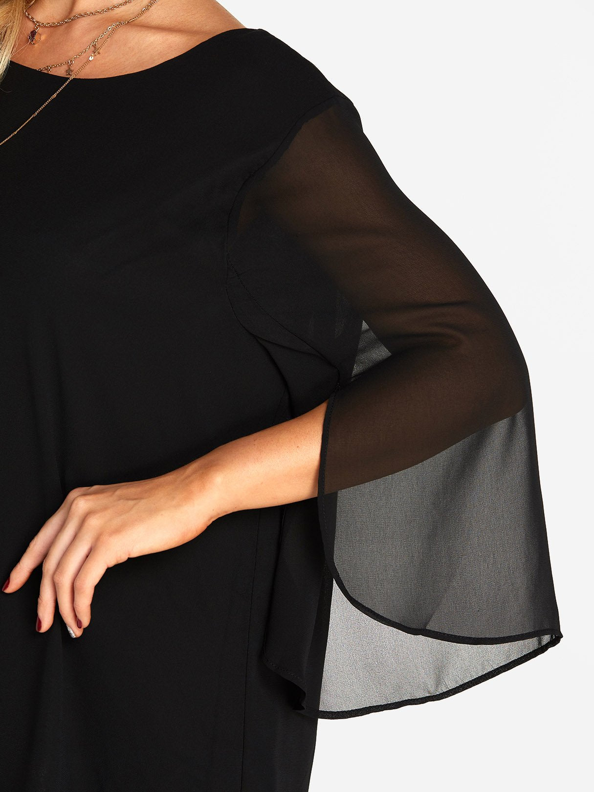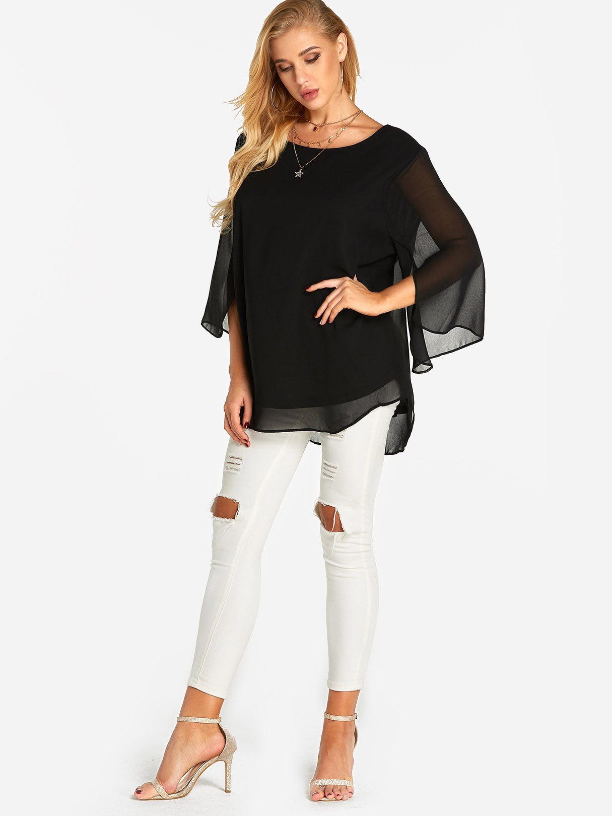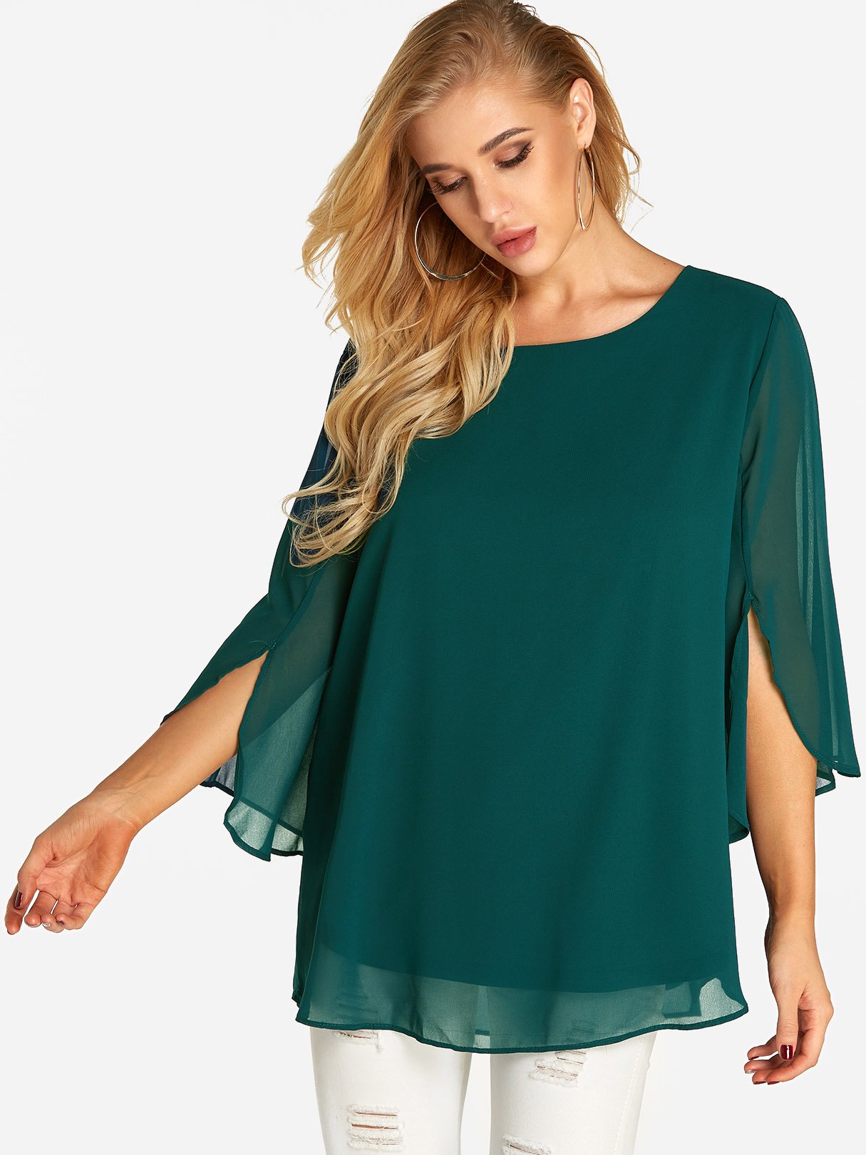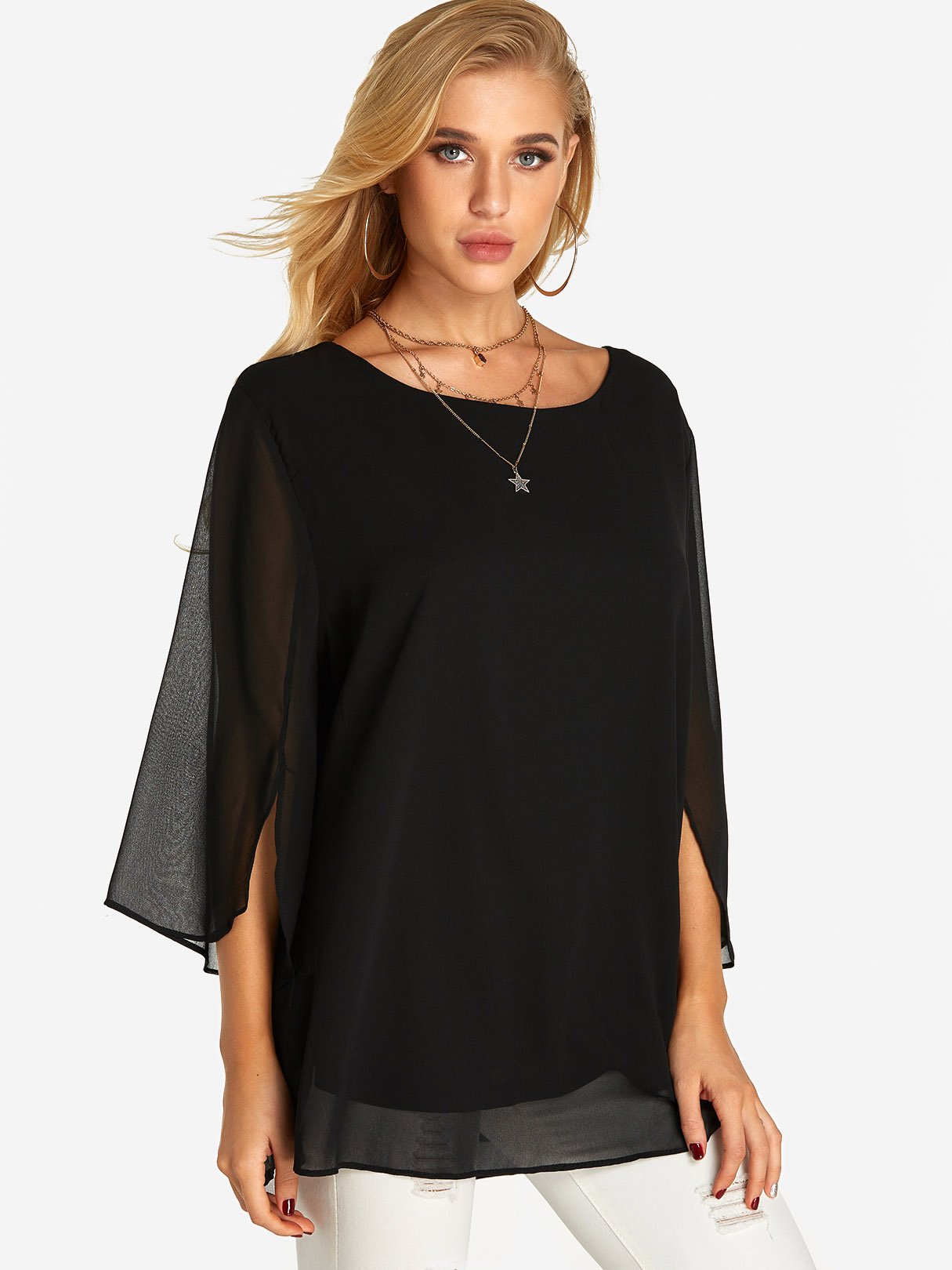 Round Neck Plain Tiered 3/4 Sleeve Blouses