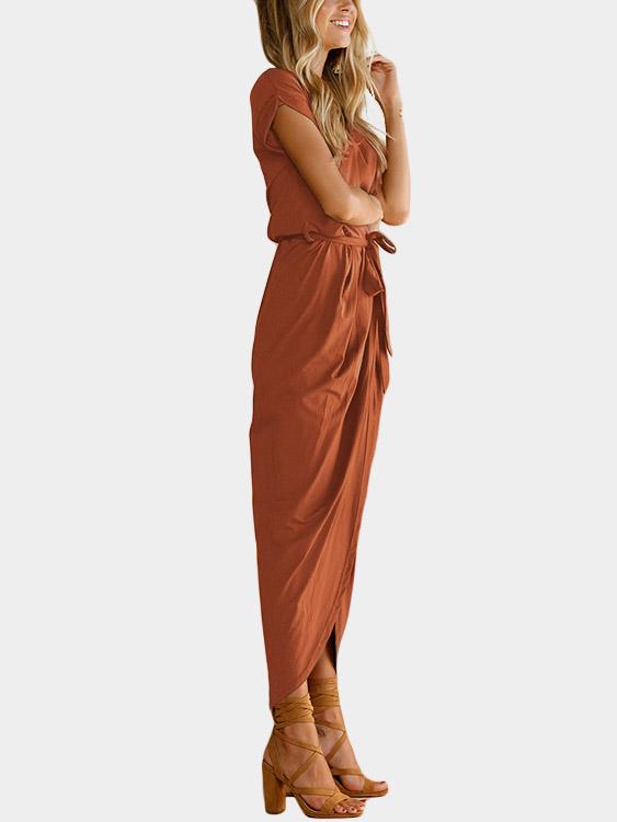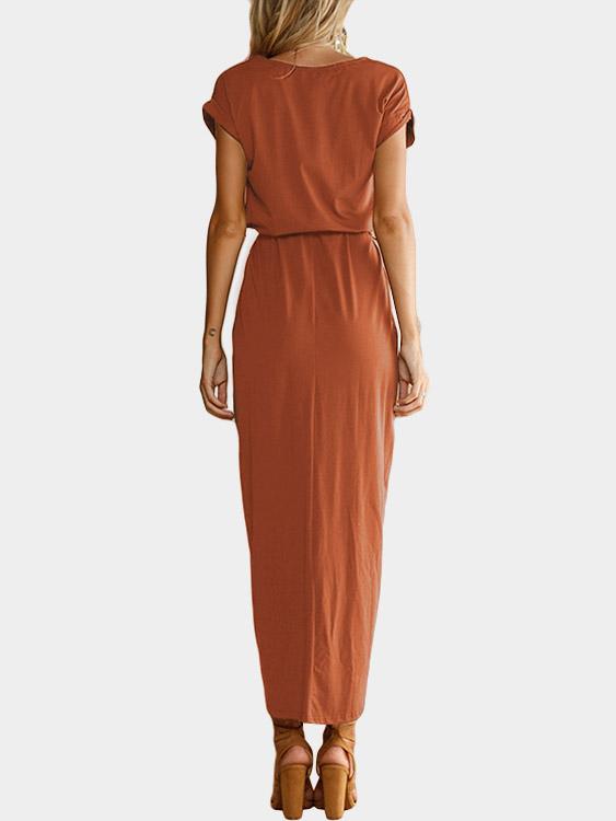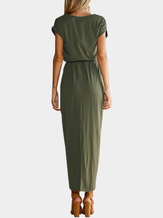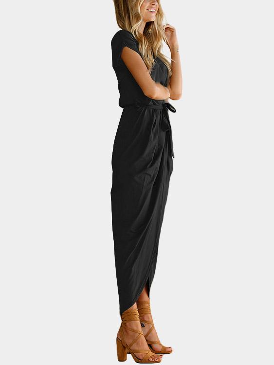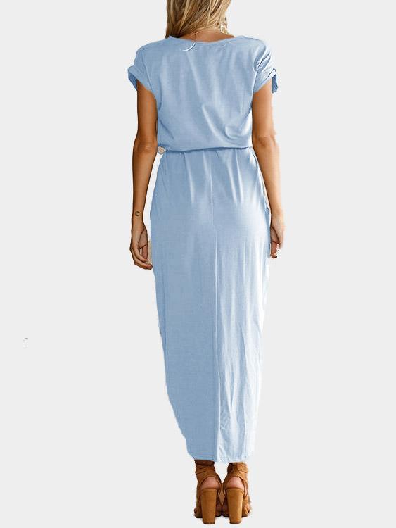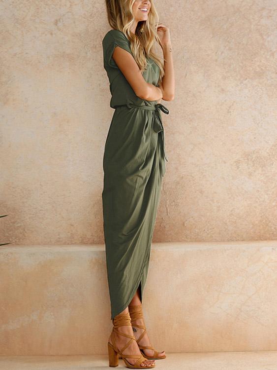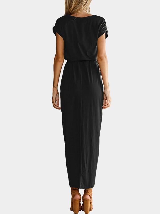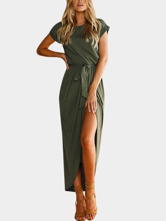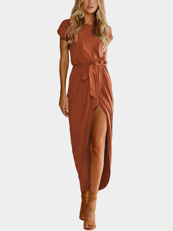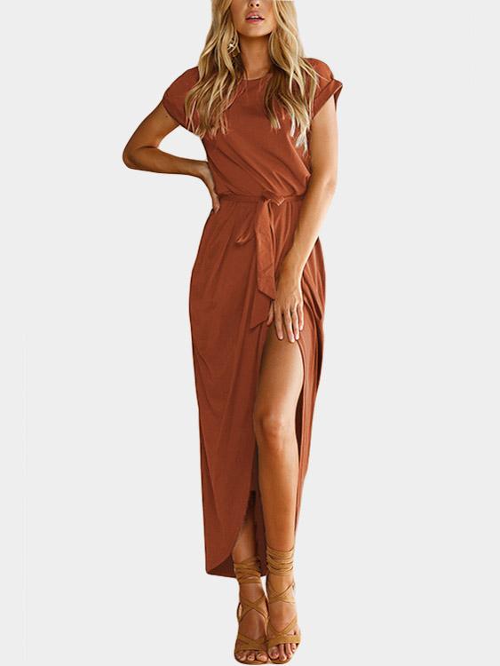 Round Neck Short Sleeve Lace-Up Belt Slit Hem Maxi Dresses