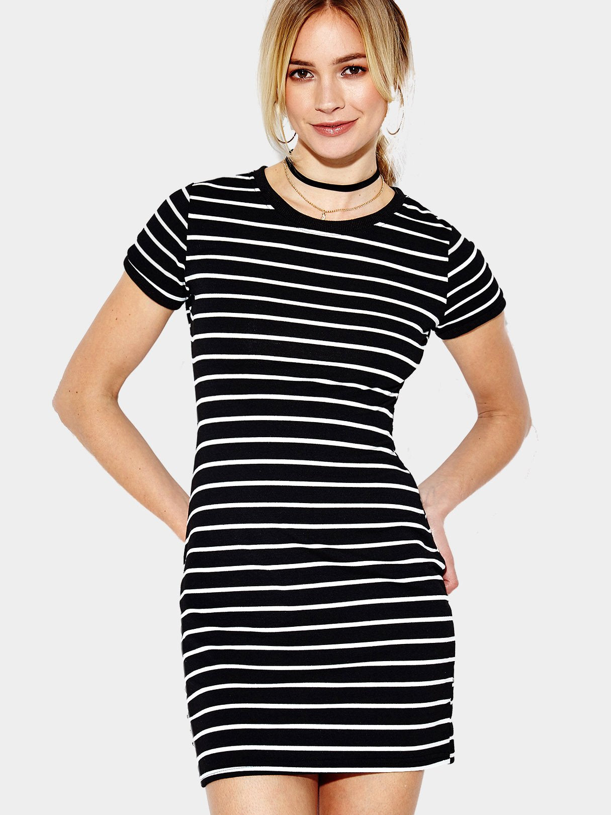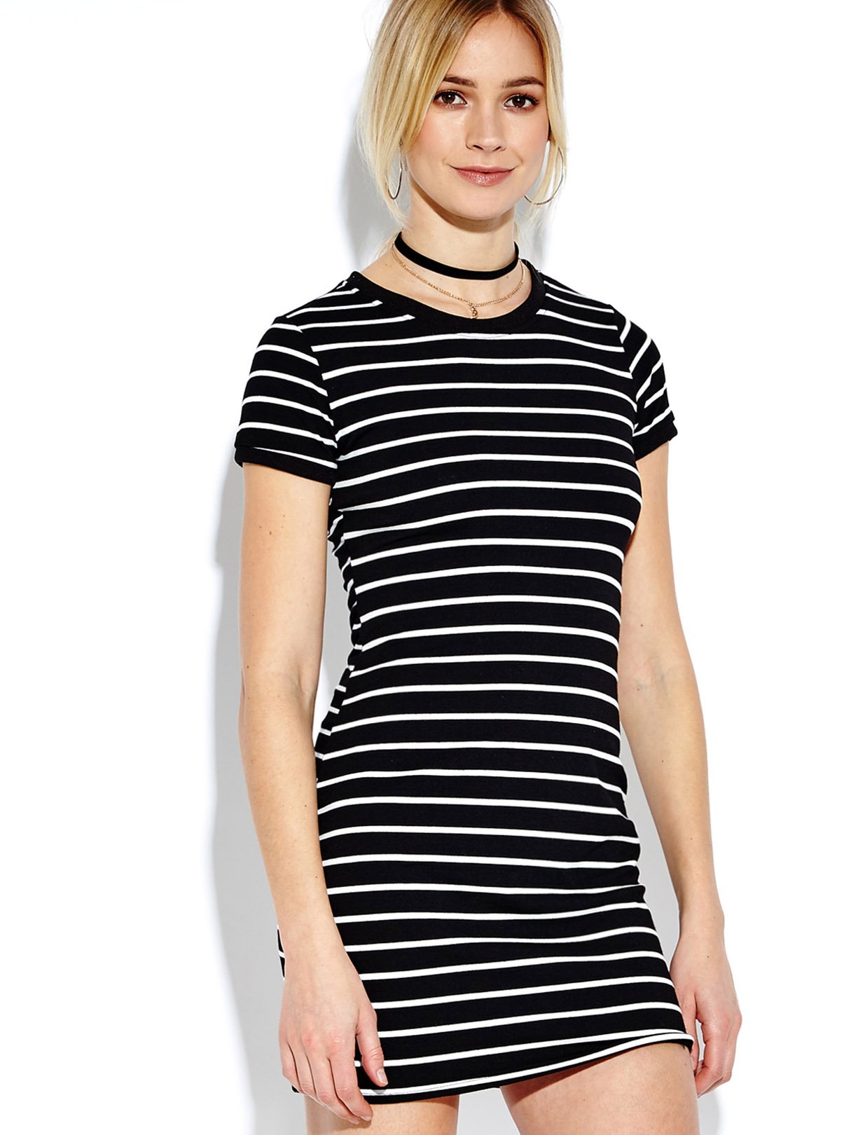 Round Neck Short Sleeve Stripe Mini Dress