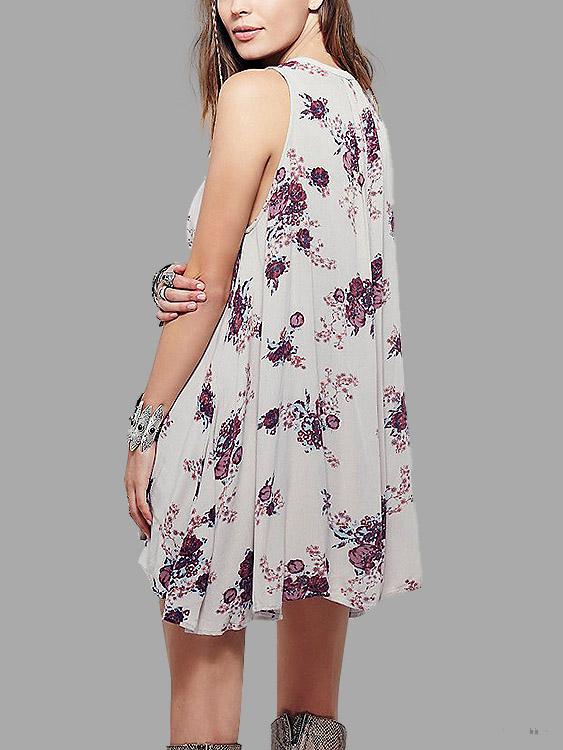 Round Neck Sleeveless Floral Print Flounced Hem Dress