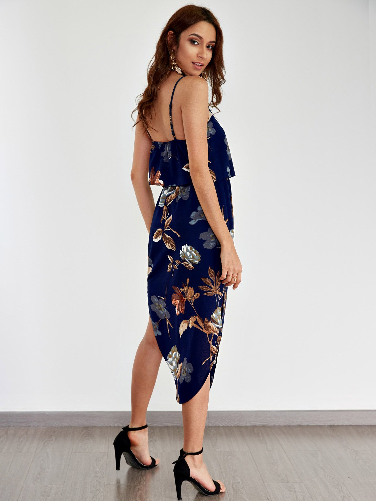 Round Neck Sleeveless Floral Print Spaghetti Strap Slit Hem Dresses
