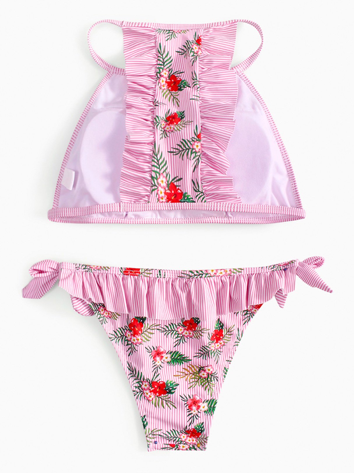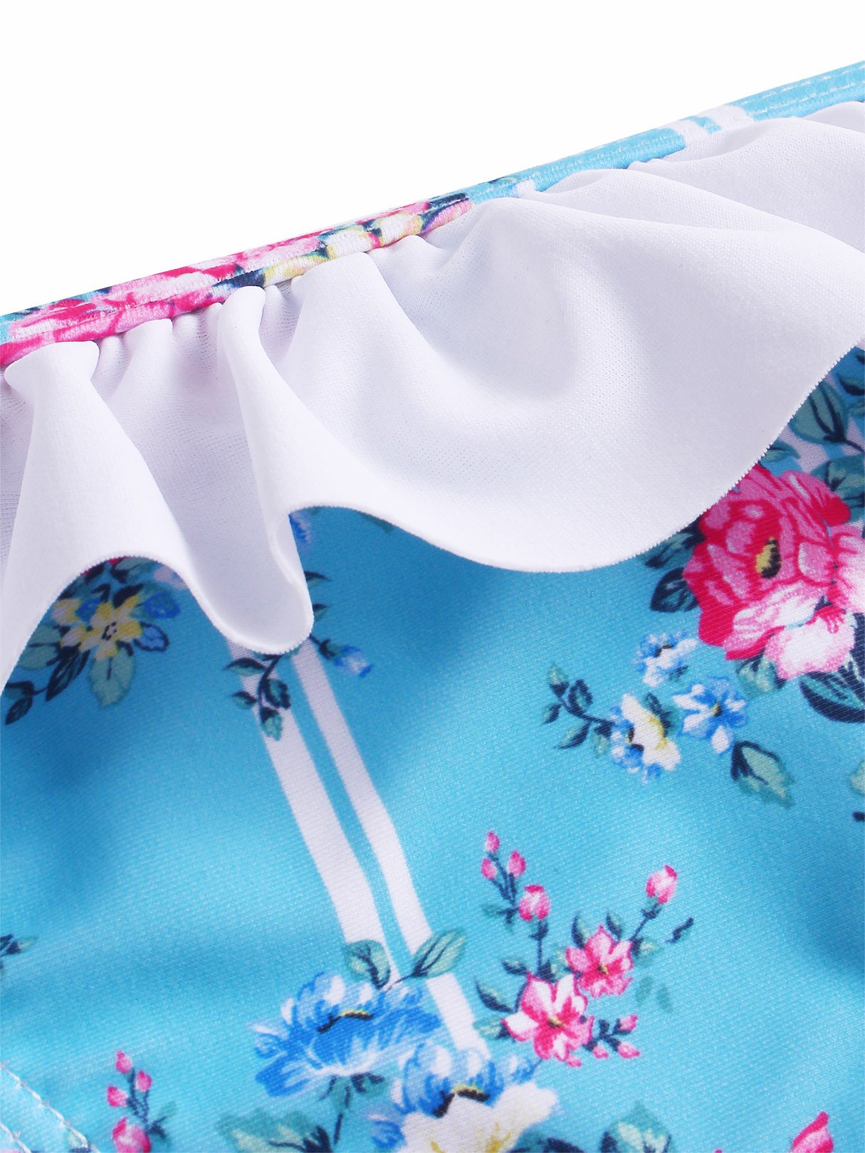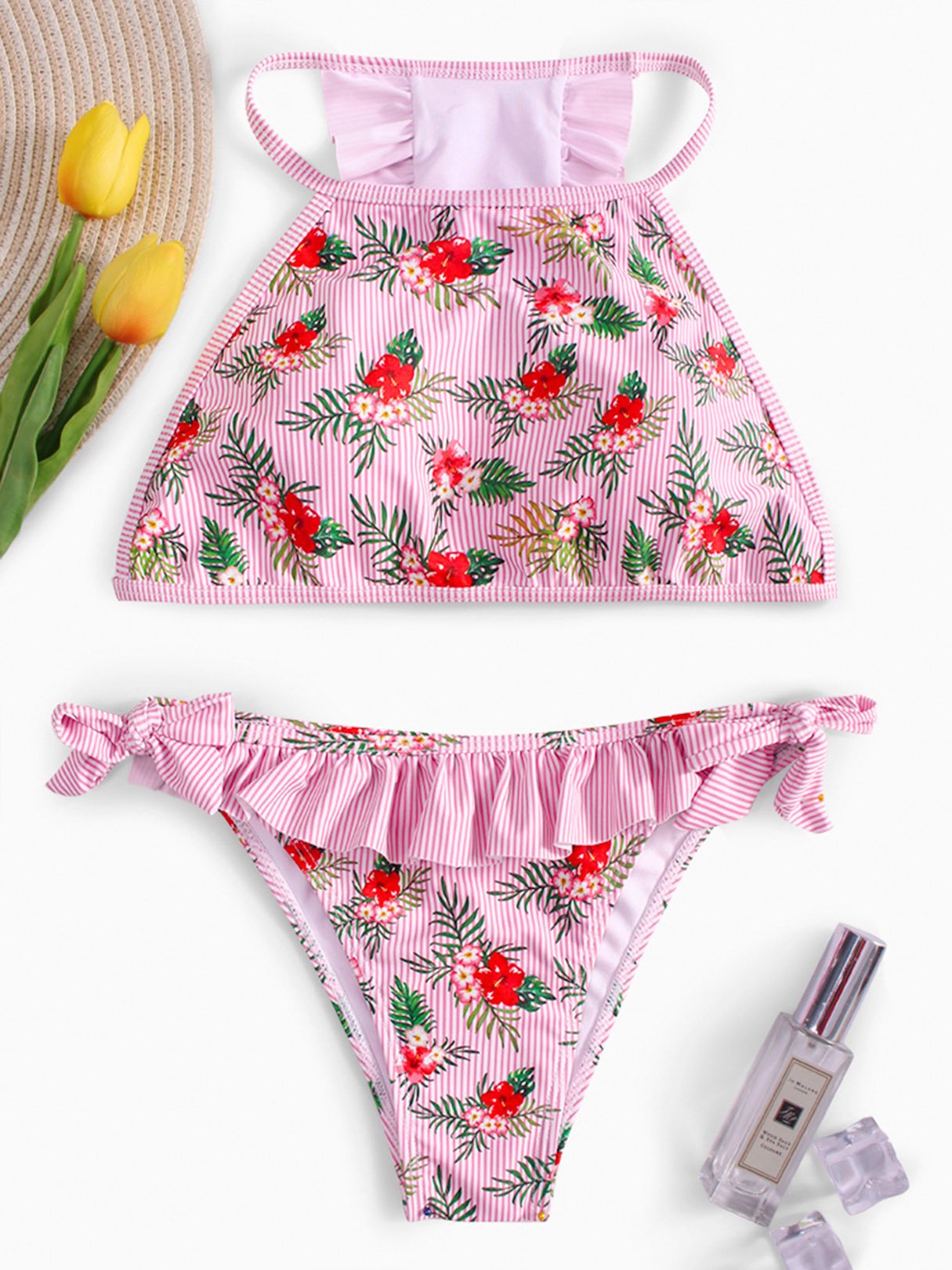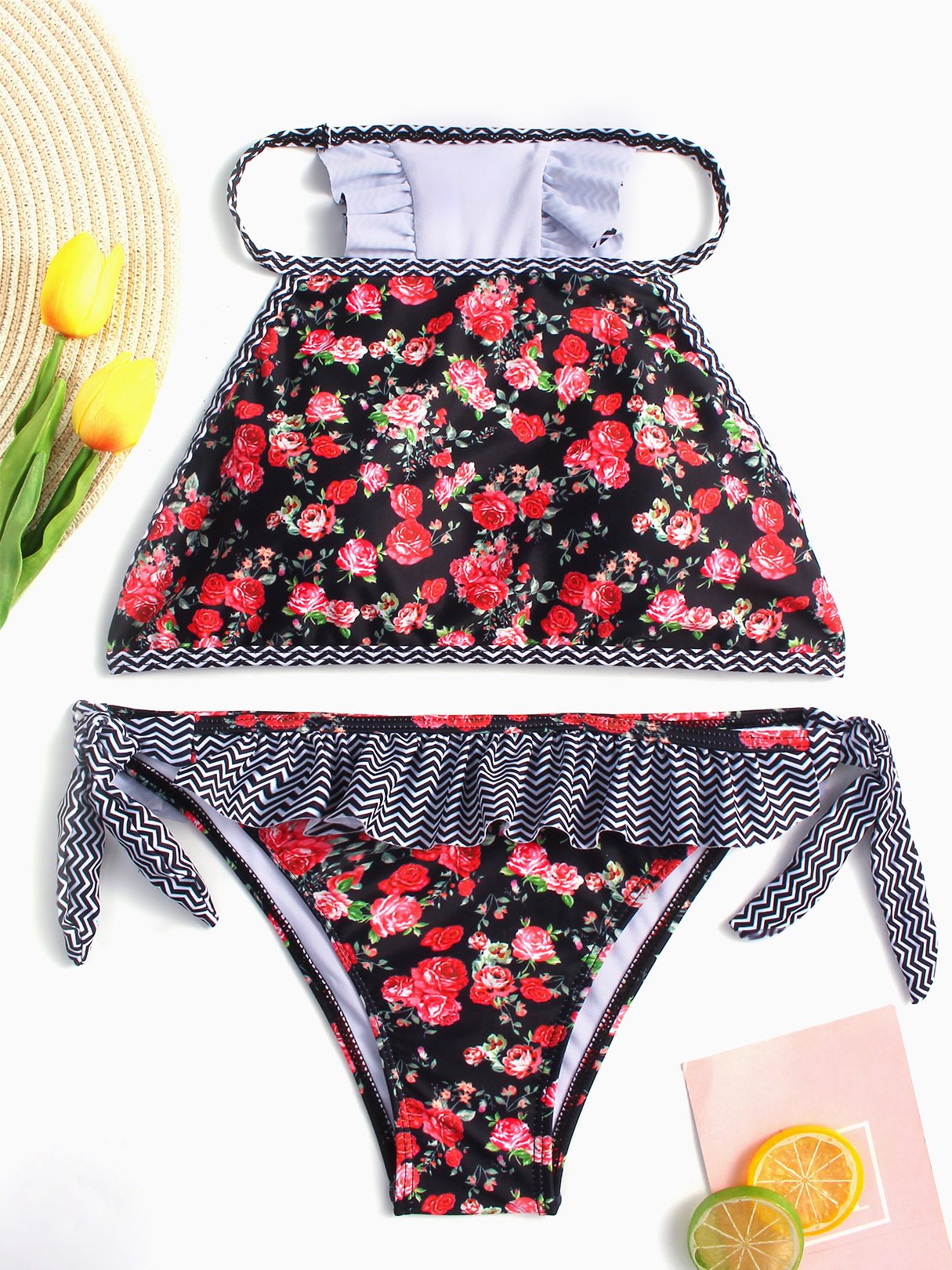 Round Neck Sleeveless Floral Print Tie-Up Ruffle Trim Ruffle Hem Two Piece Bikinis