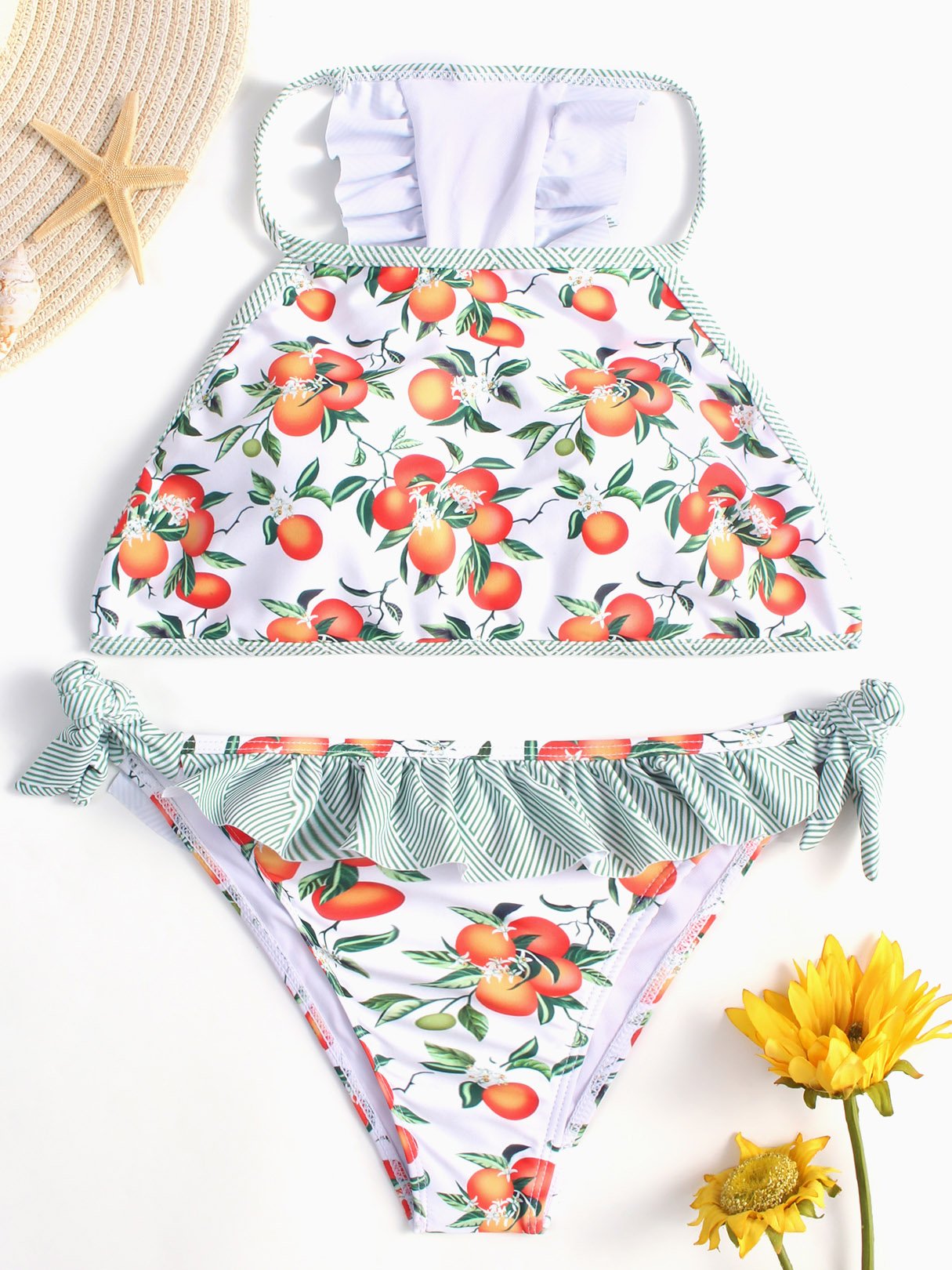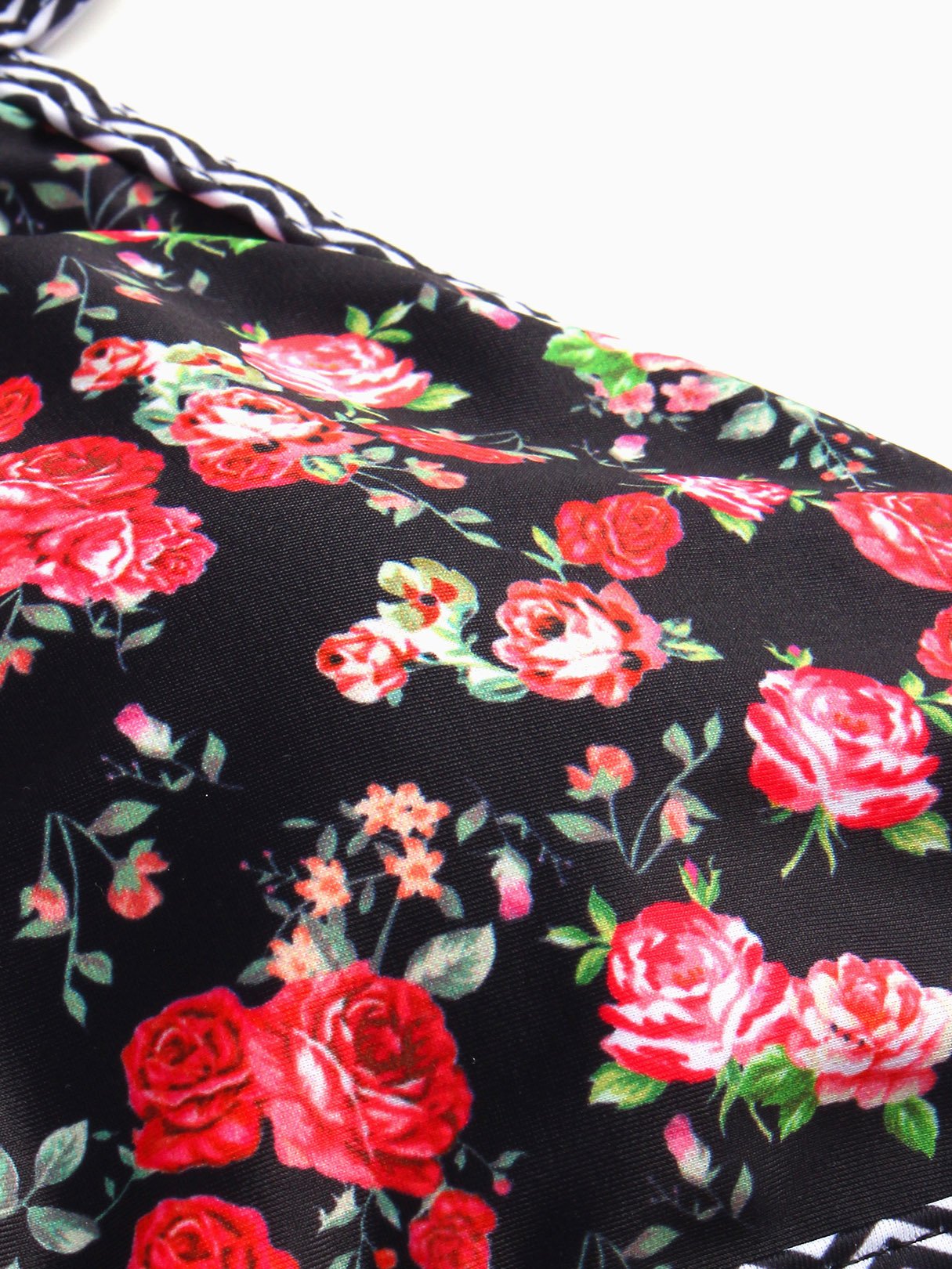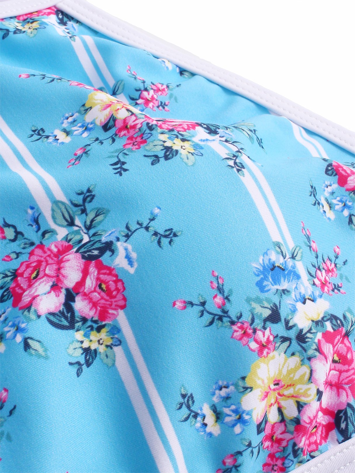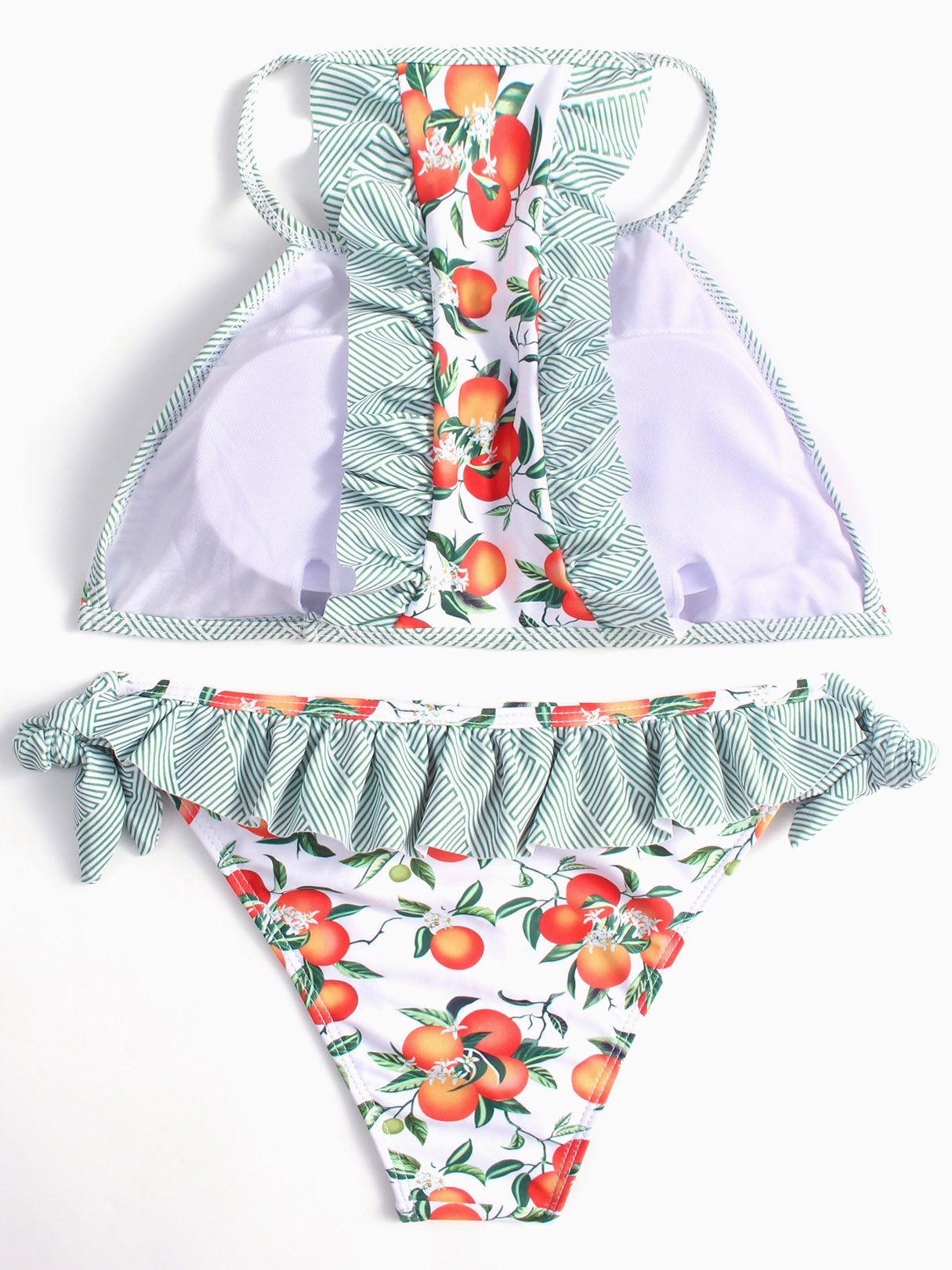Round Neck Sleeveless Floral Print Tie-Up Ruffle Trim Ruffle Hem Two Piece Bikinis