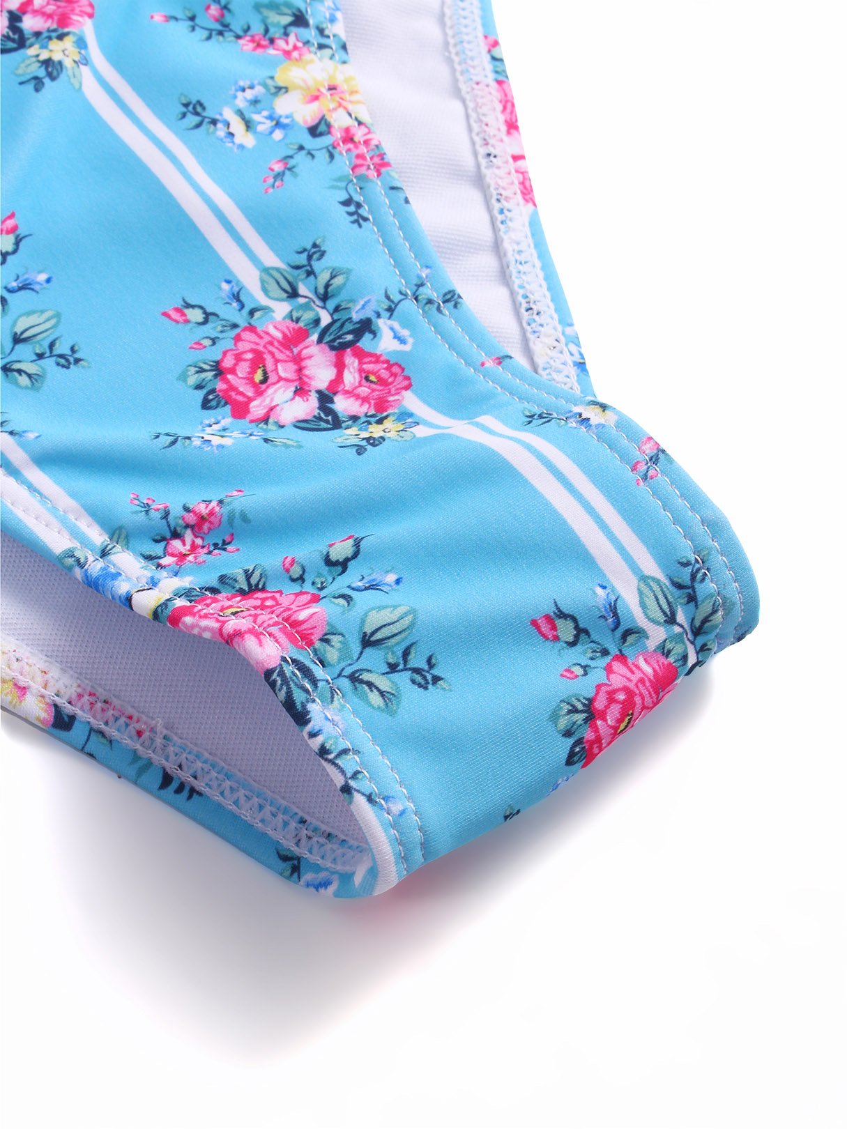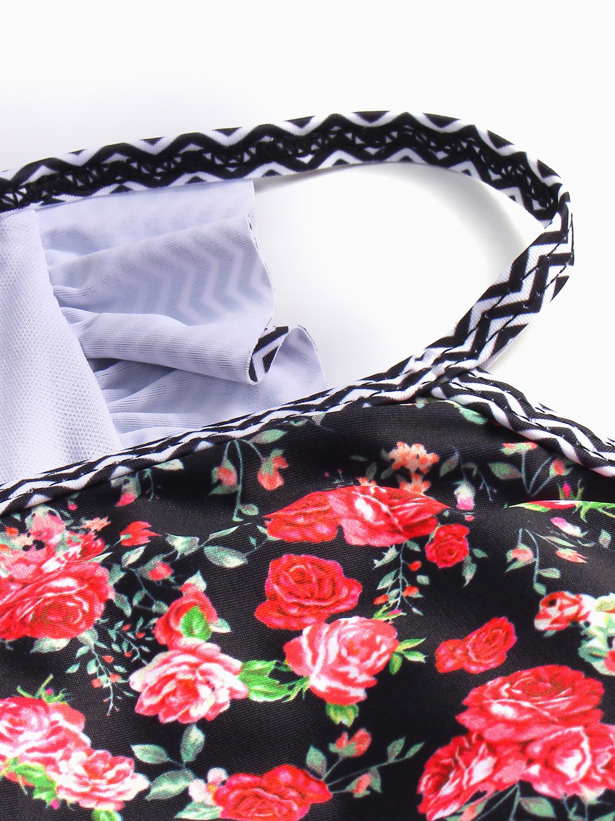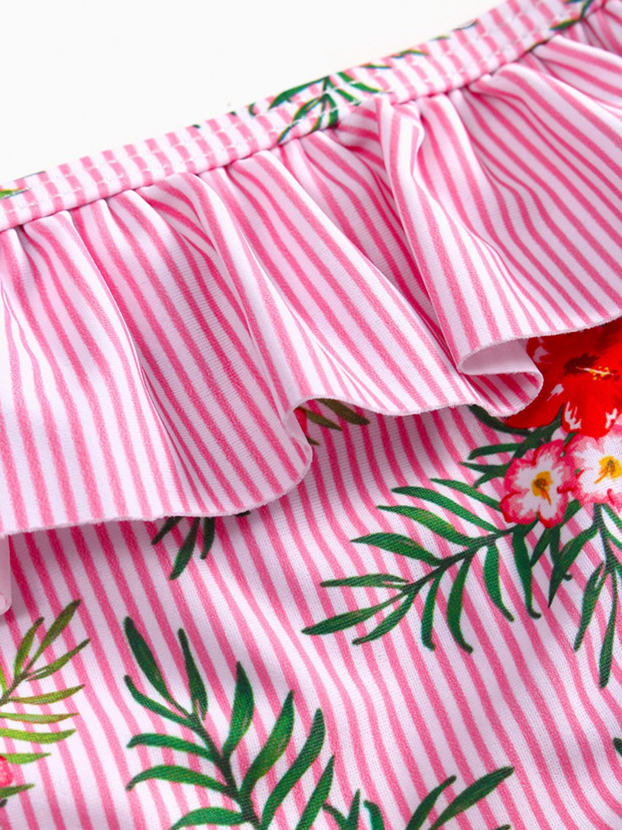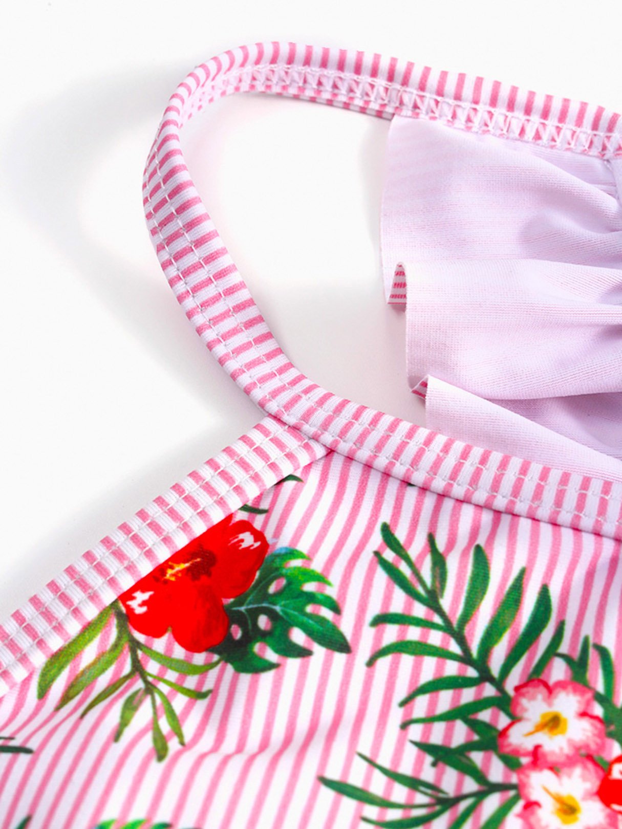 Round Neck Sleeveless Floral Print Tie-Up Ruffle Trim Ruffle Hem Two Piece Bikinis
