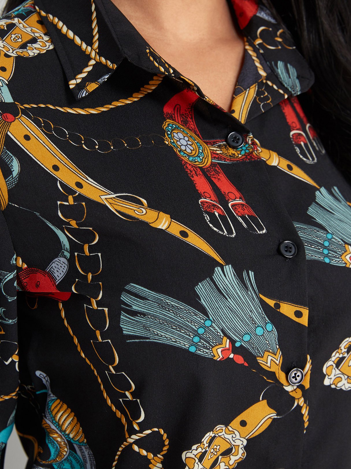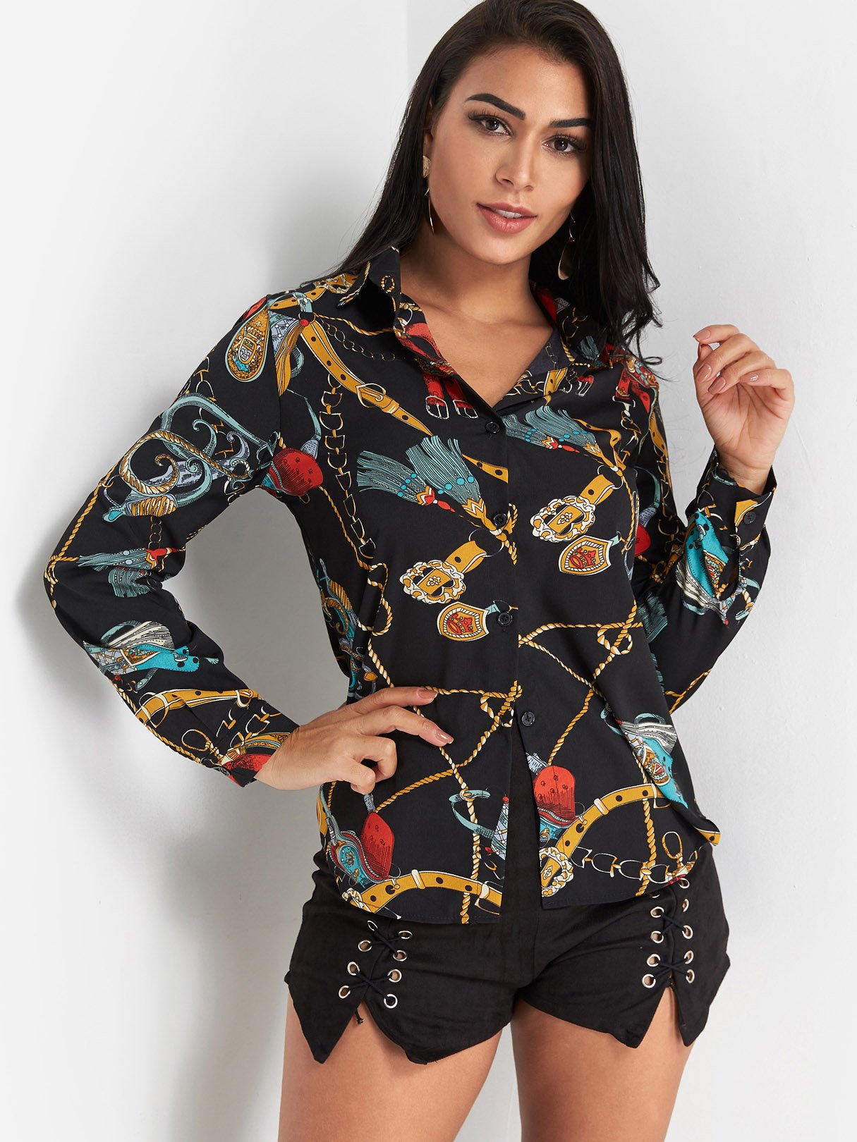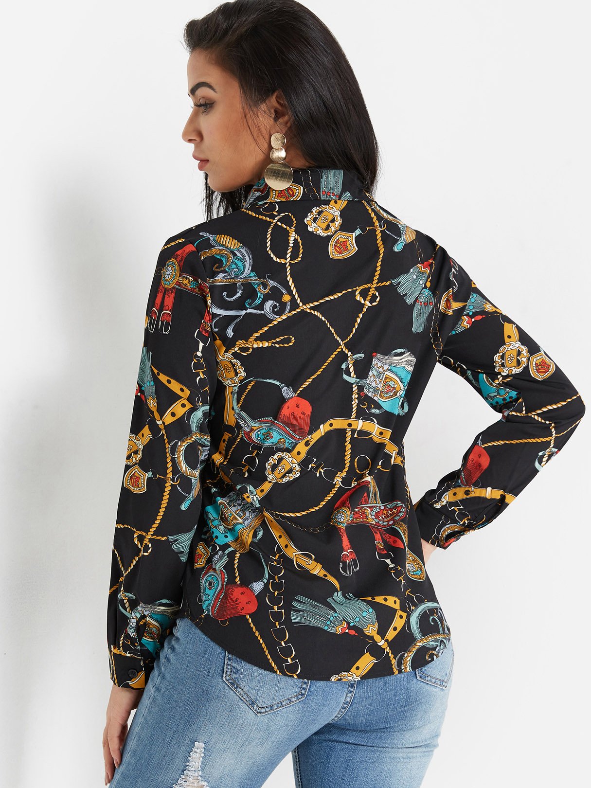 Scarf Print Classic Collar Blouse - Black / S is backordered and will ship as soon as it is back in stock.