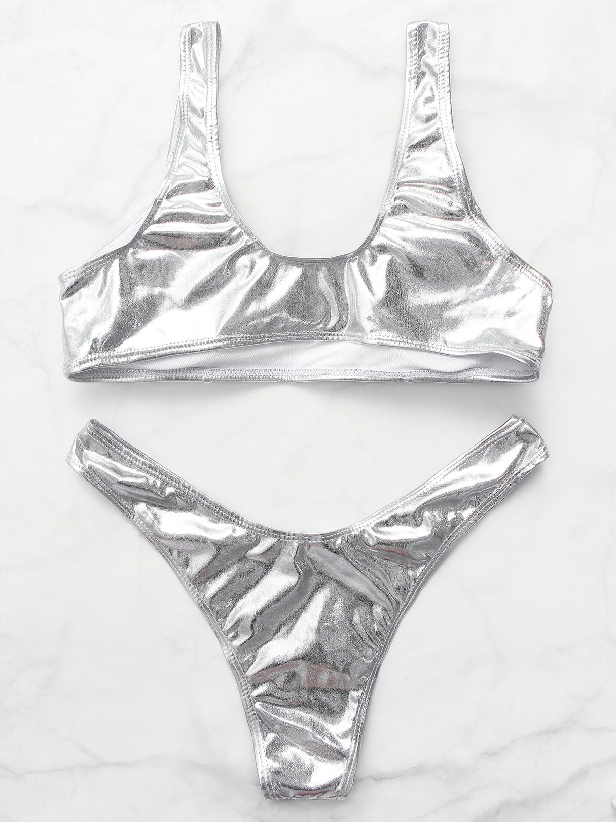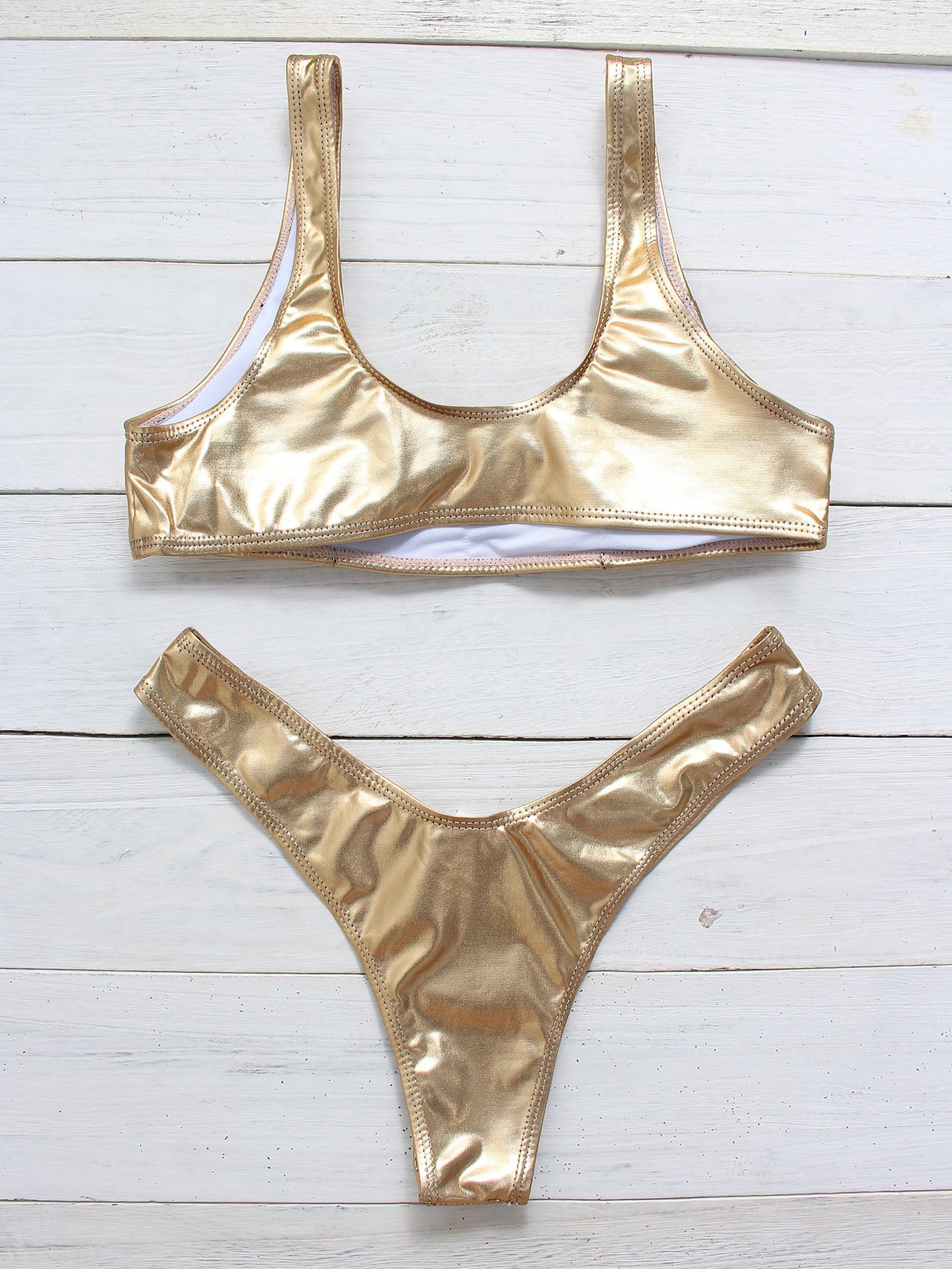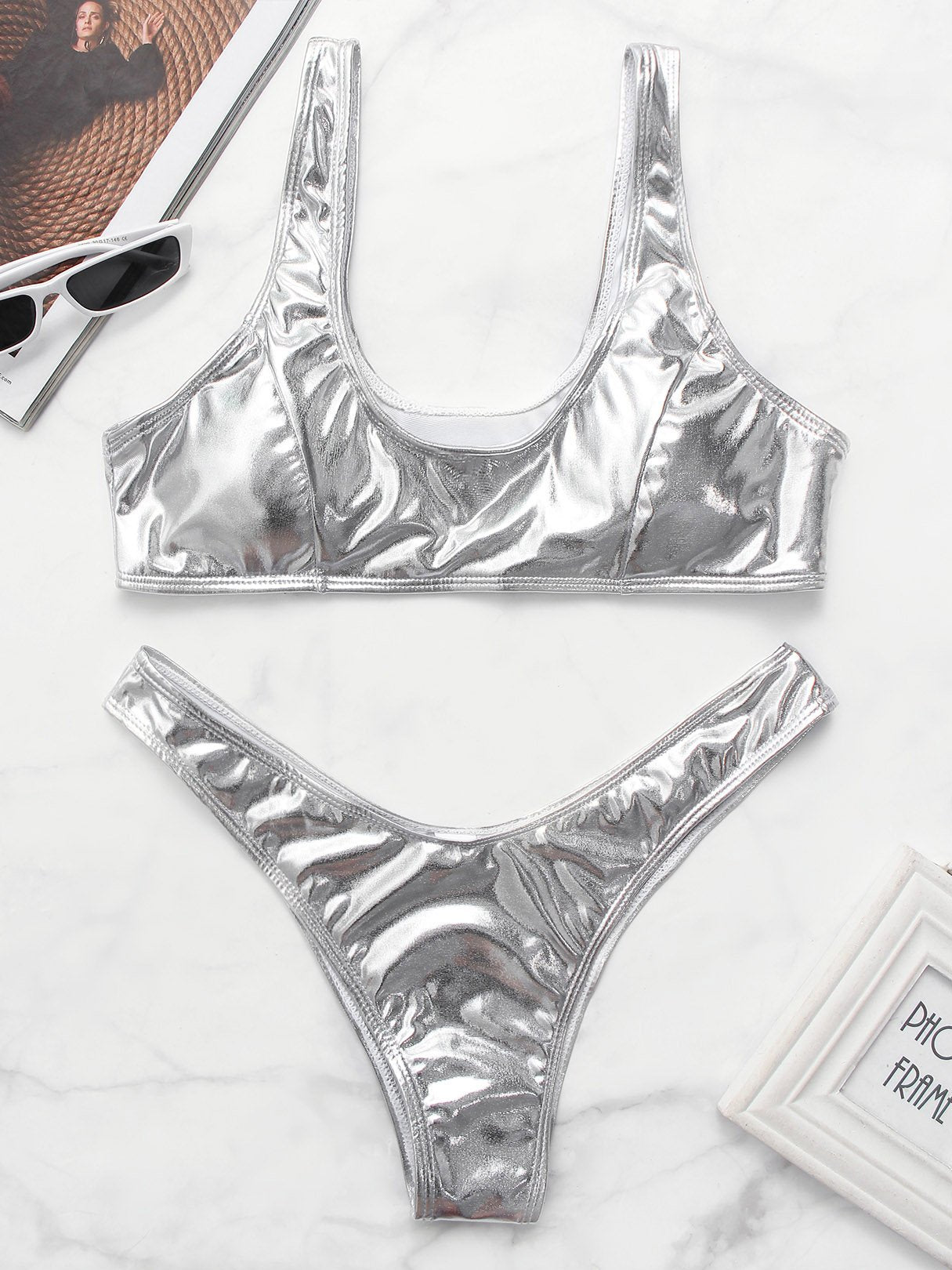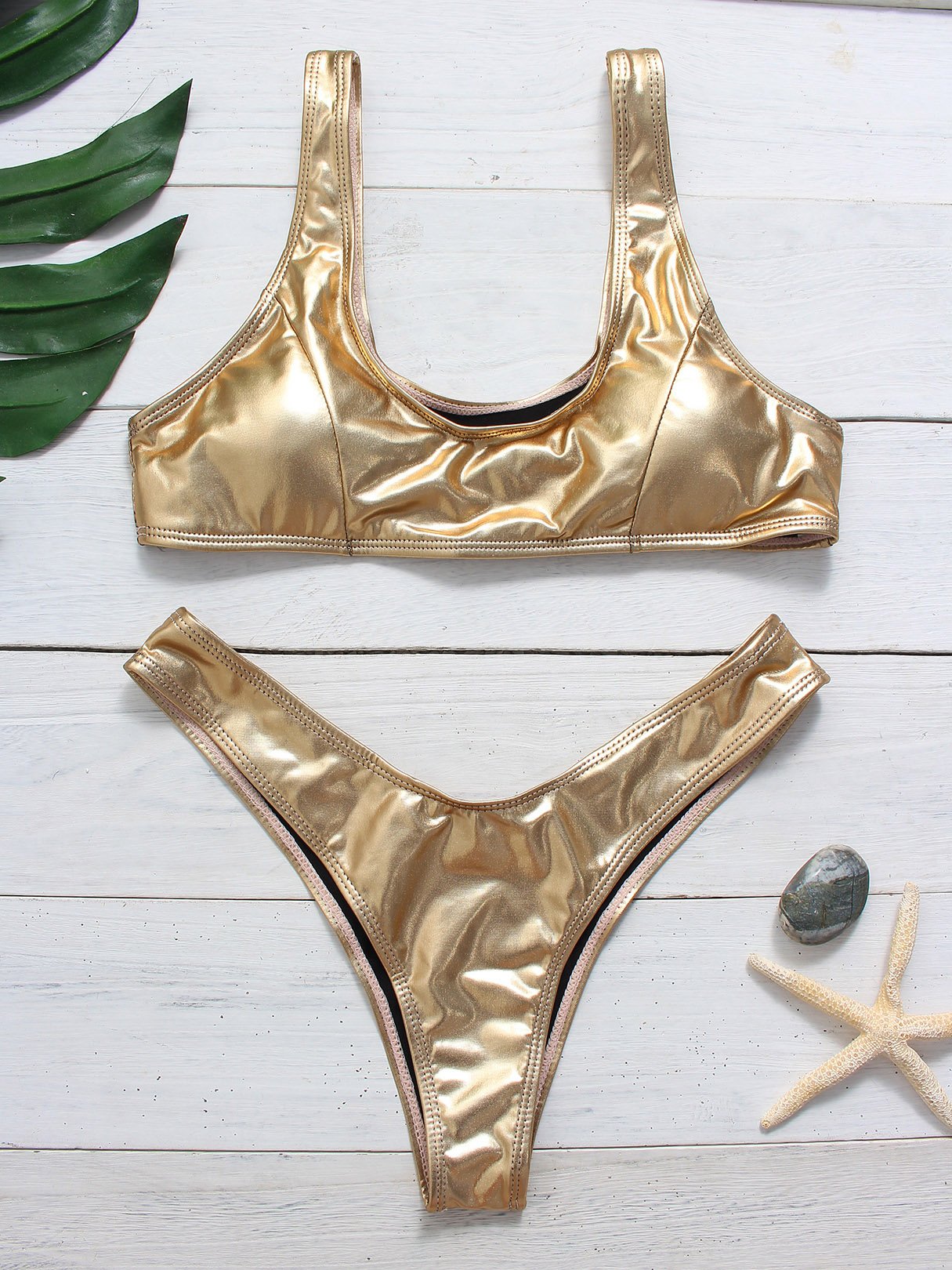 Scoop Neck Plain High Waist 2 Piece Bikini Sets