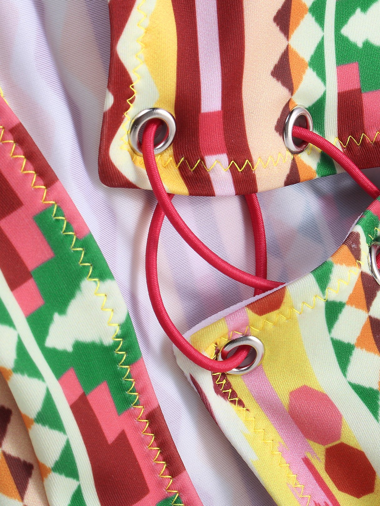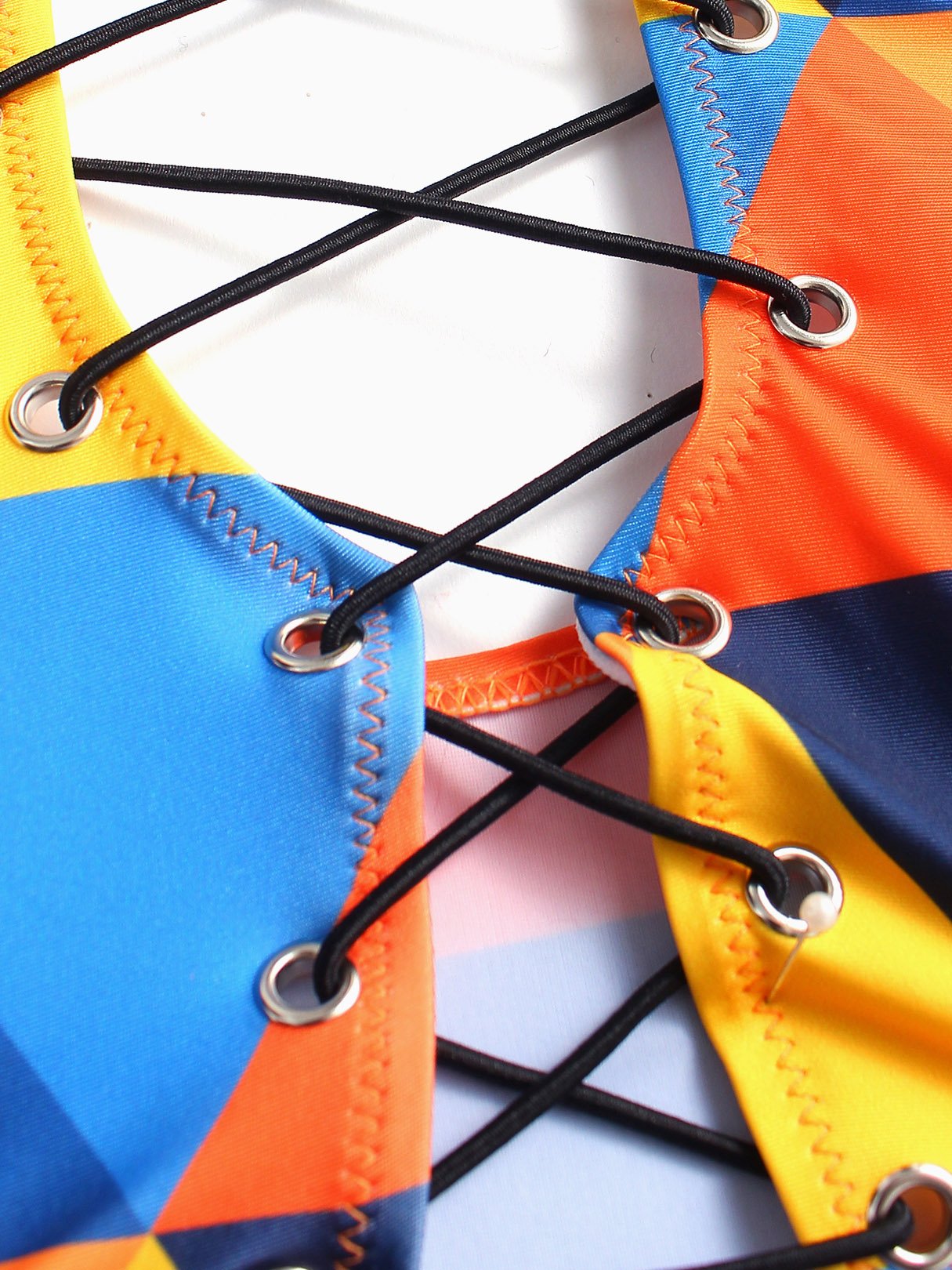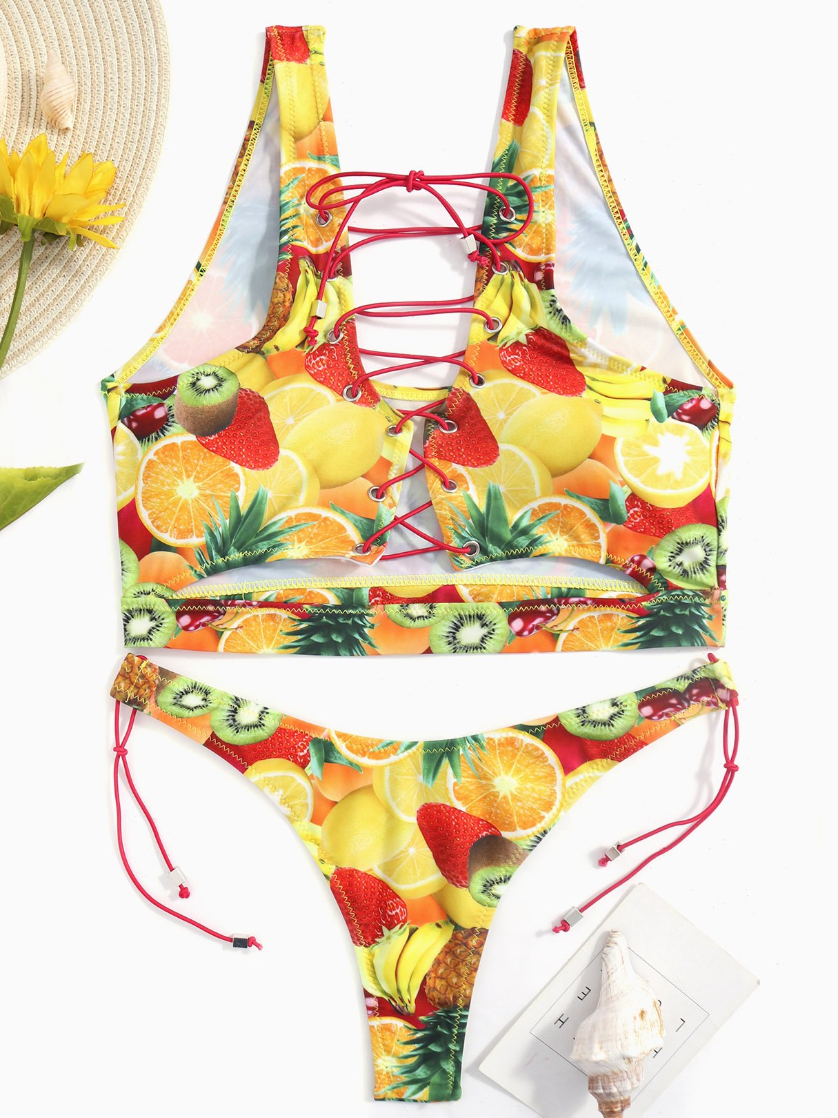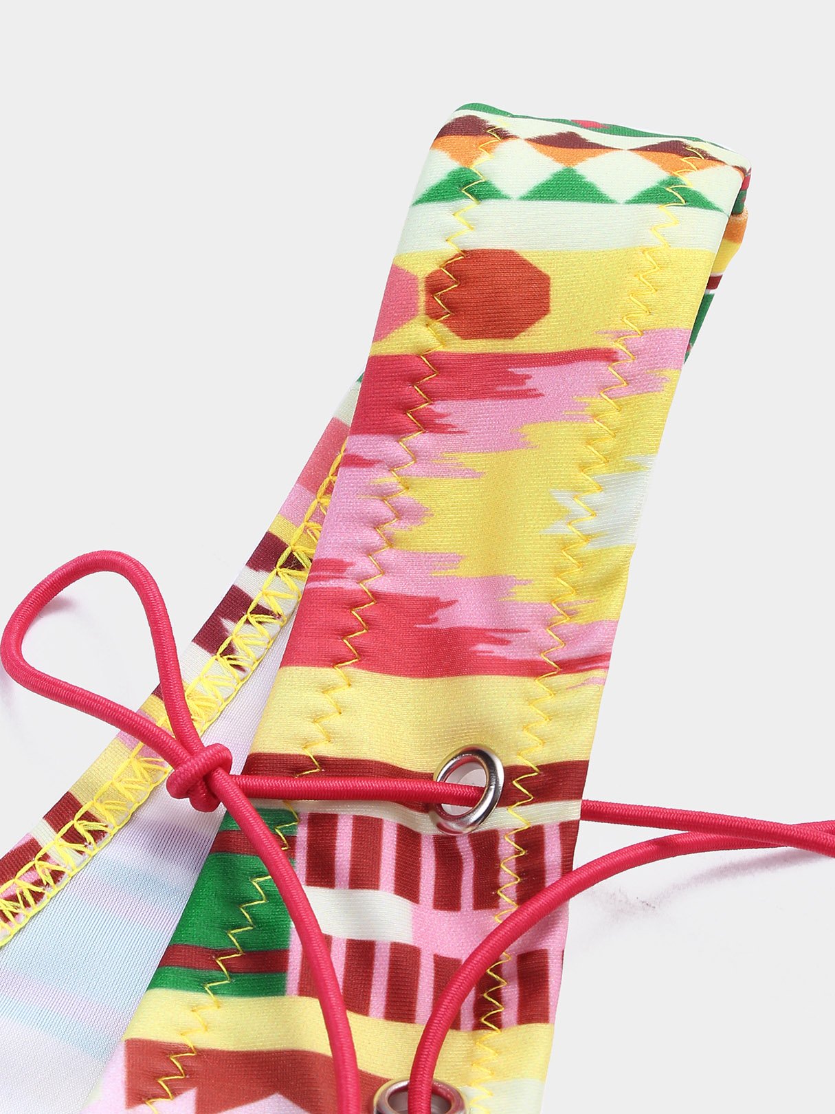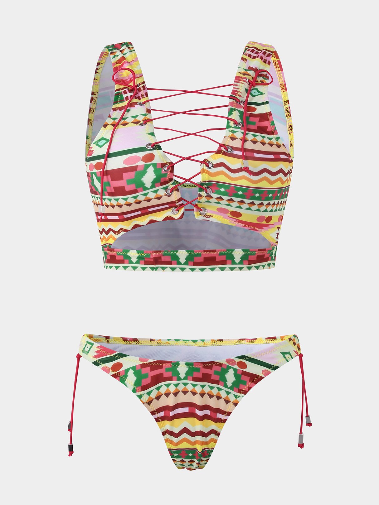 Scoop Neck Sleeveless Printed Crossed Front Lace-Up Cut Out Bikinis
