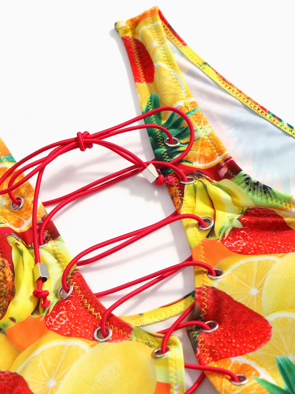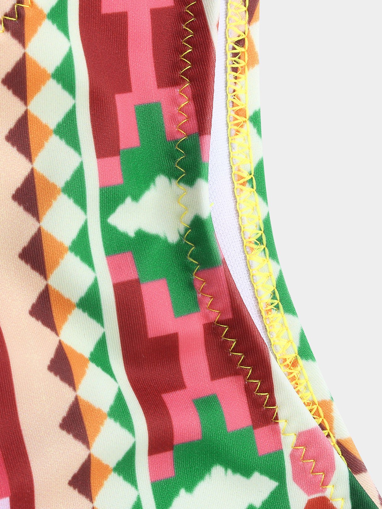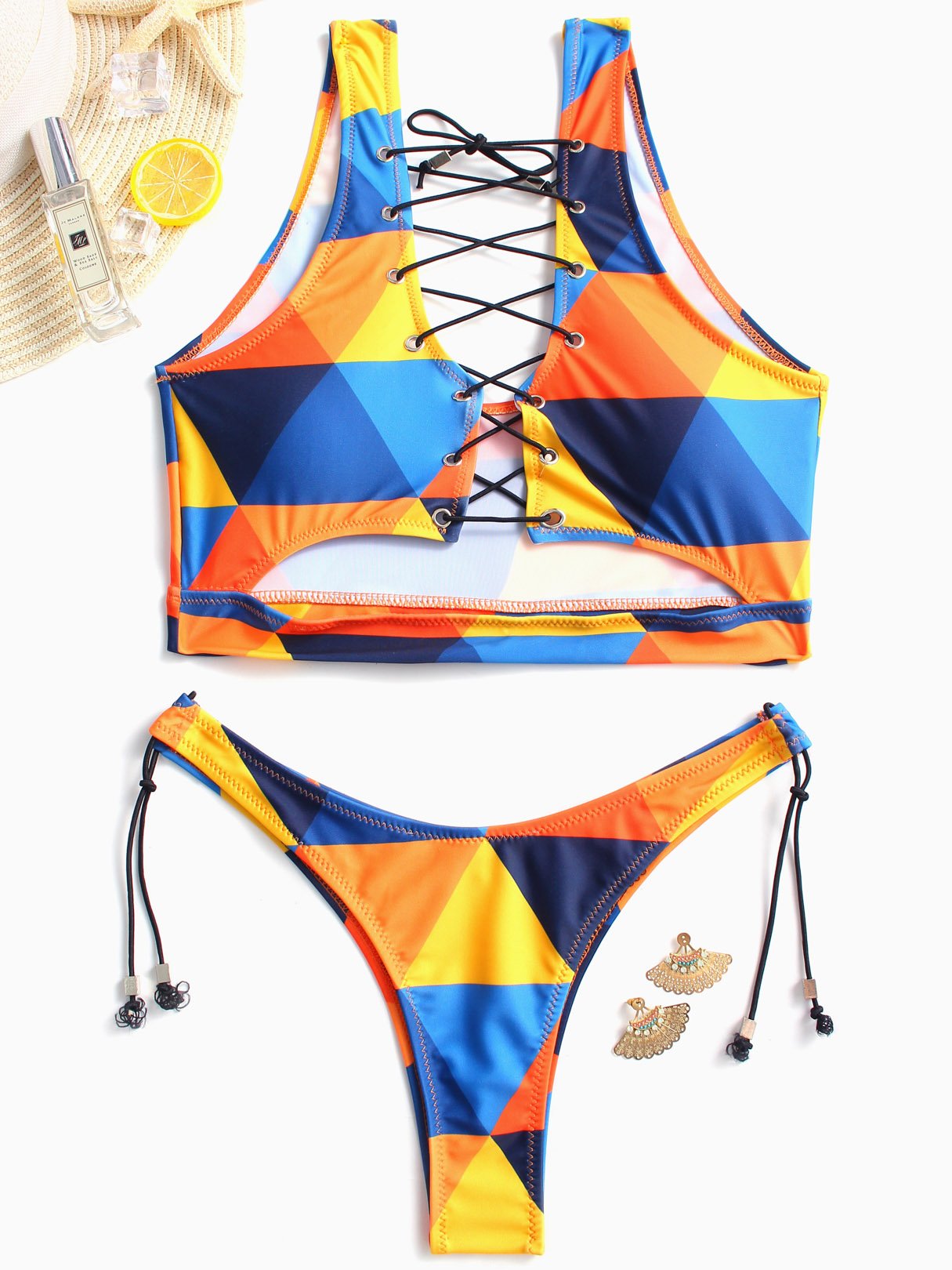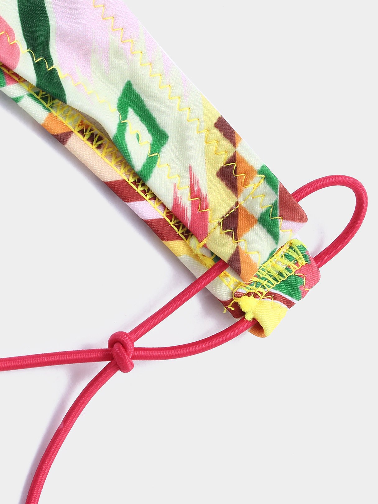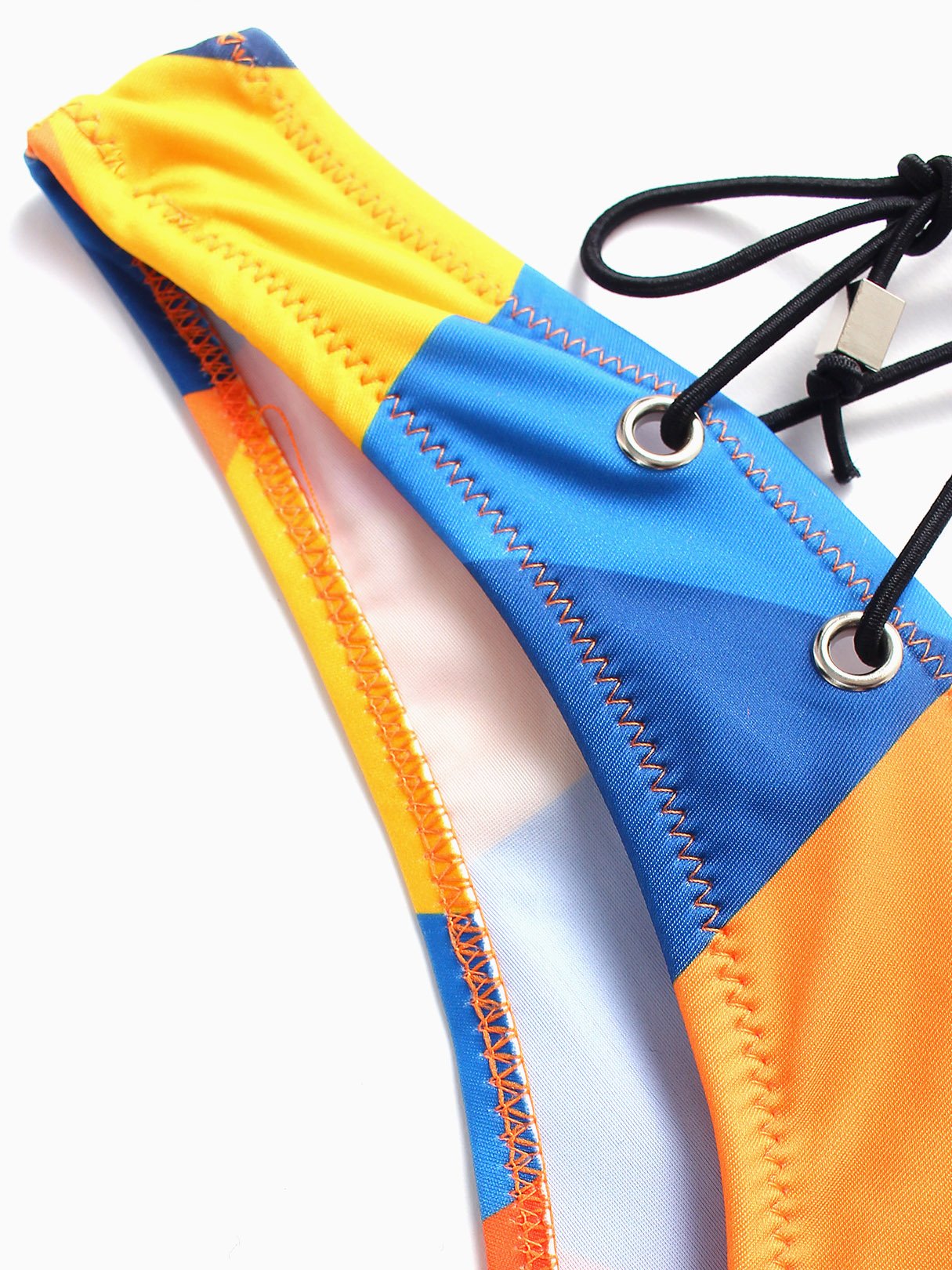 Scoop Neck Sleeveless Printed Crossed Front Lace-Up Cut Out Bikinis