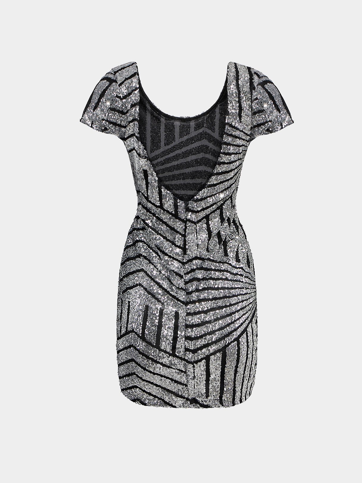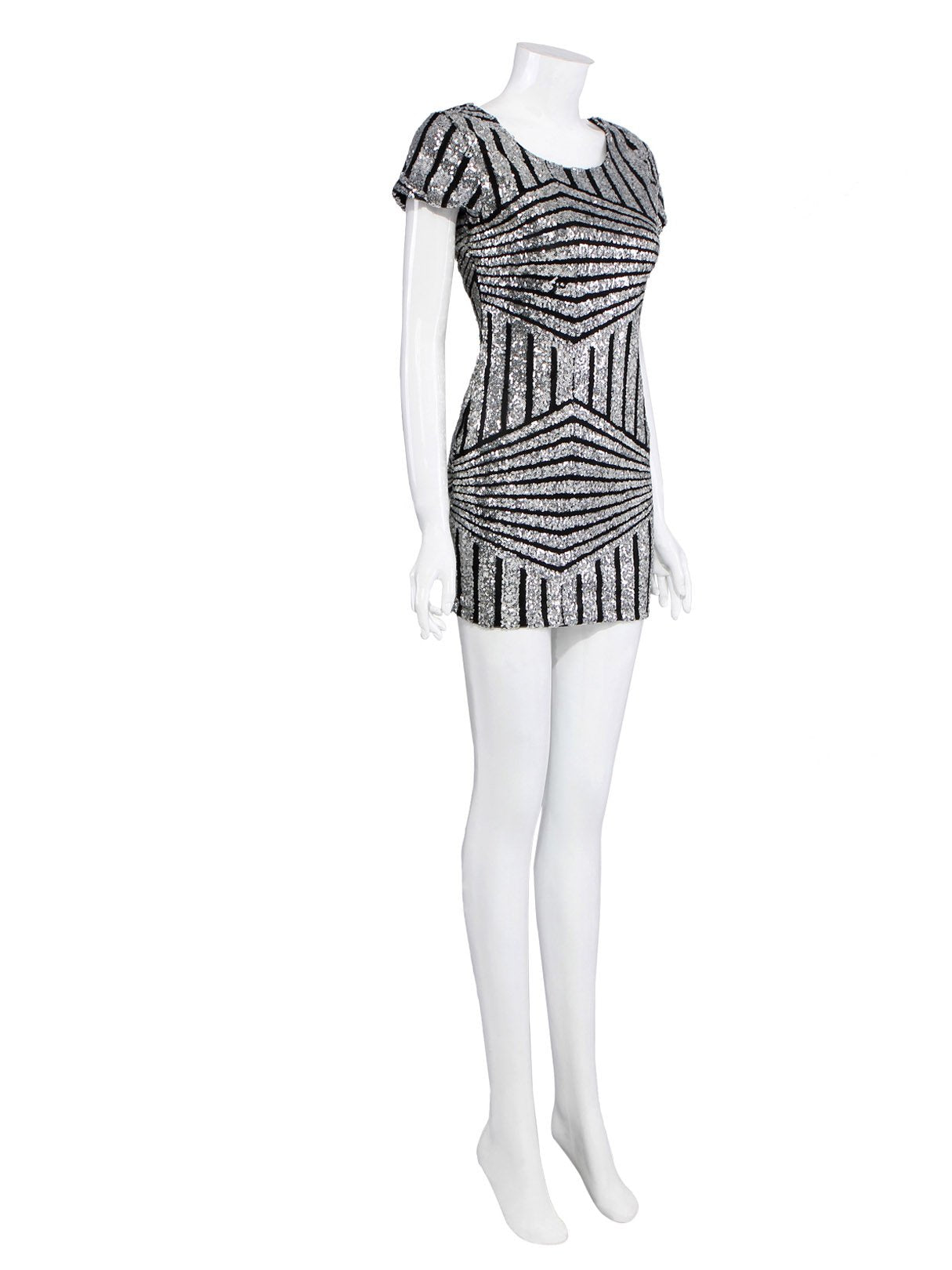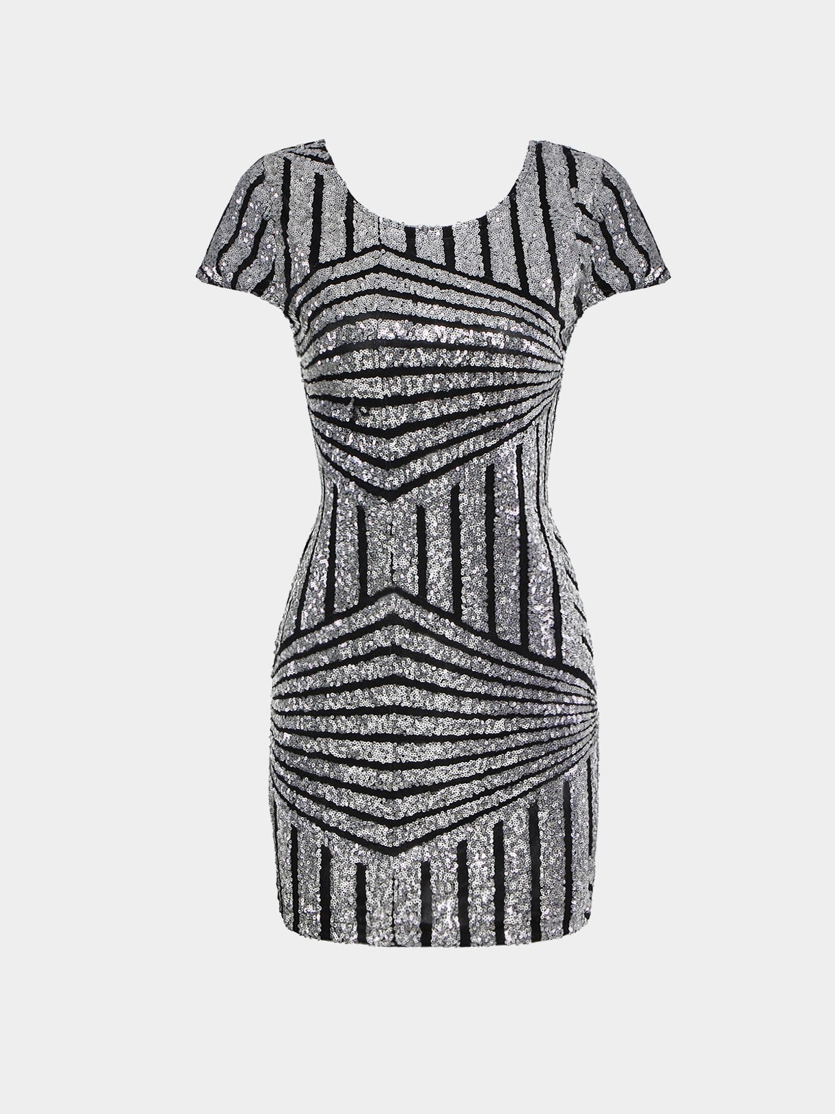 Silver Crew Neck Short Sleeve Stripe Geometrical Zip Back Sexy Dresses